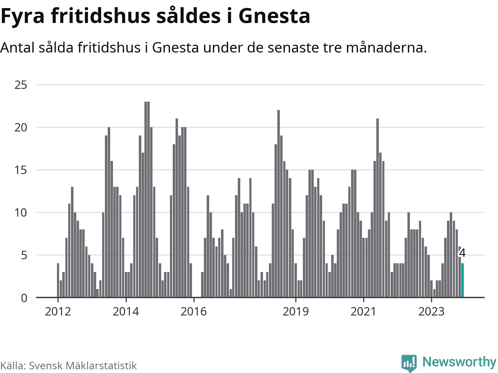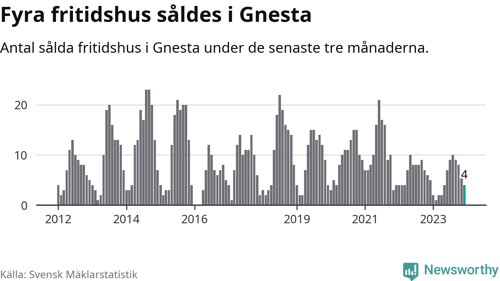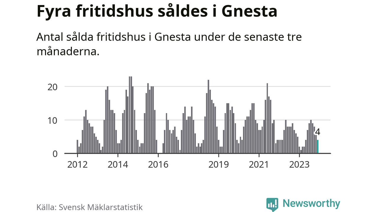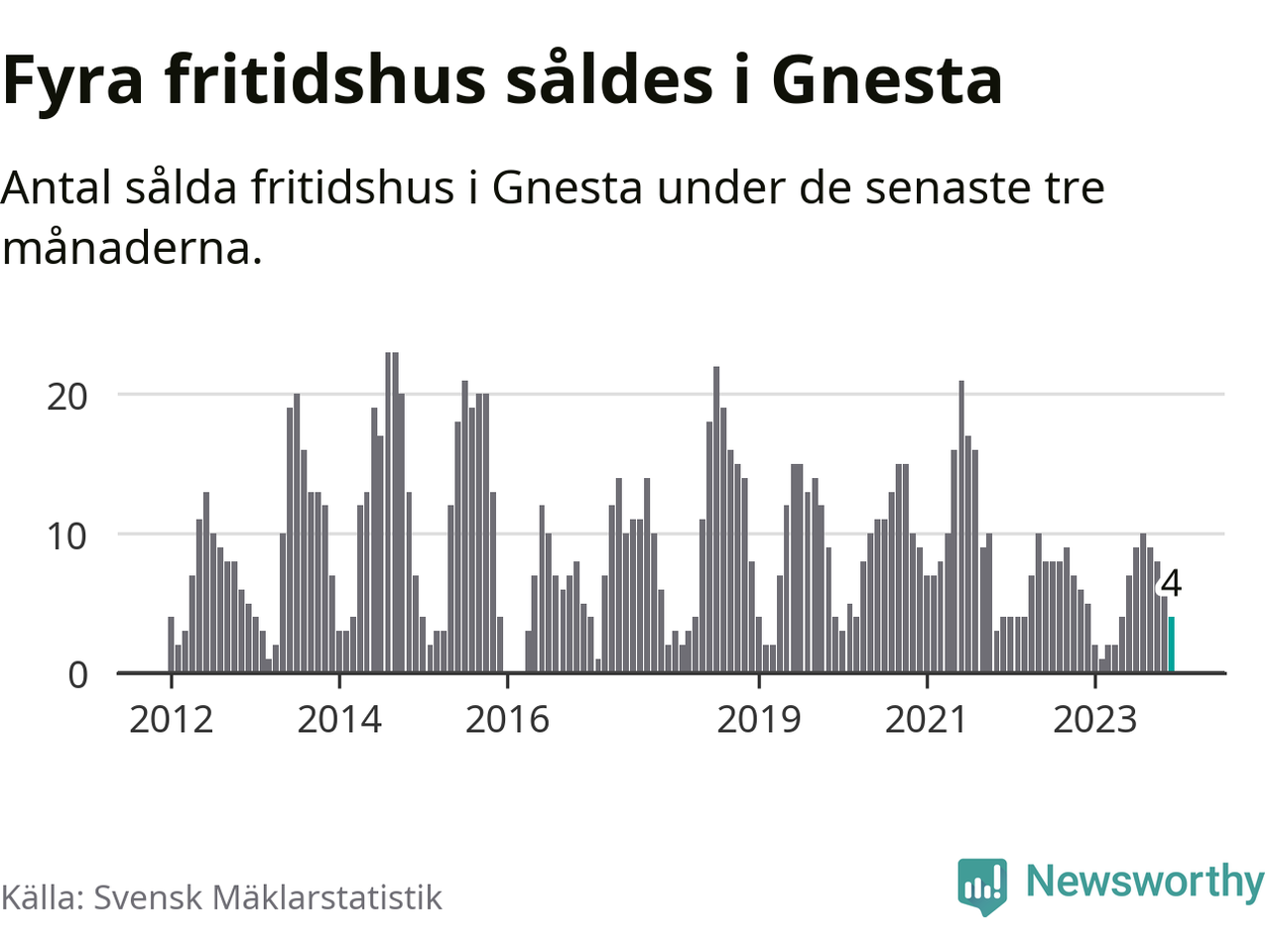 Mellan oktober och december gjordes sammanlagt fyra affärer med fritidshus i Gnesta kommun. Det kan jämföras med fem vid motsvarande tid i fjol.