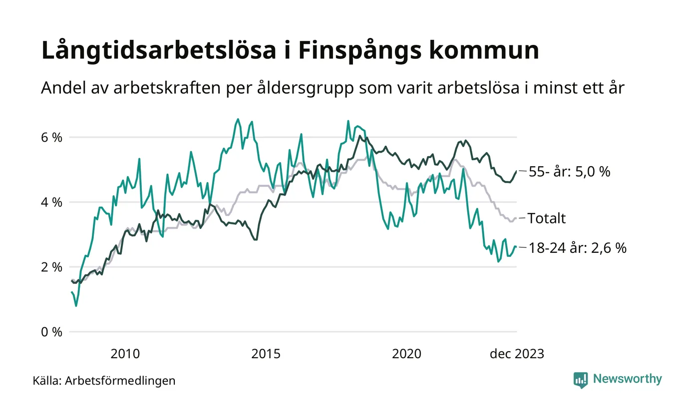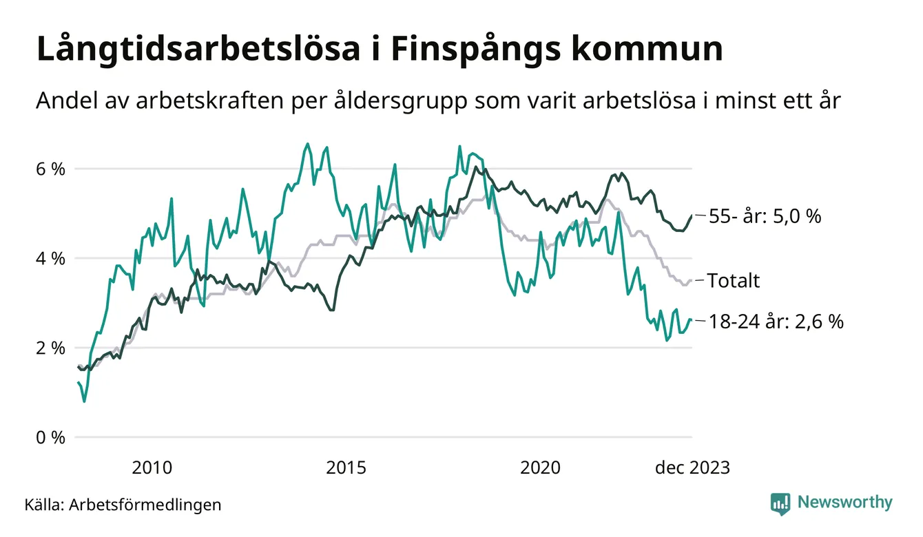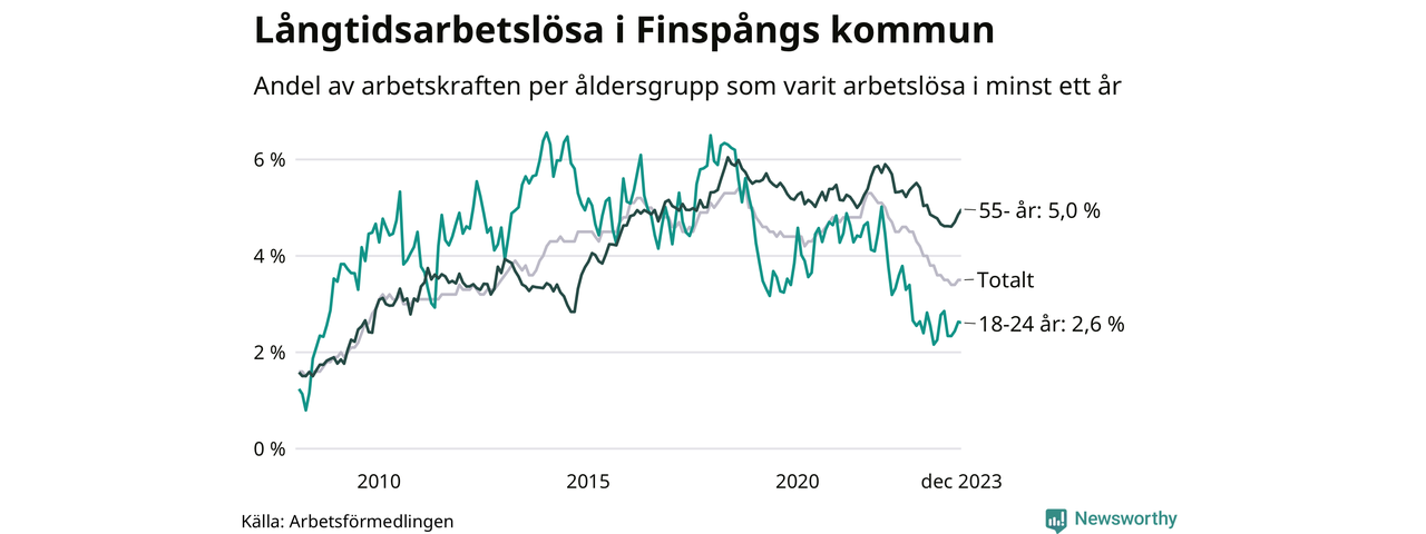 Av de 370 personerna som varit arbetslösa i mer än ett år i Finspångs kommun är 123 personer mellan 55 och 651 år och 26 är mellan 18 och 24 år. För den äldre gruppen är andelen arbetslösa 5,0 procent medan den i den yngre gruppen är 2,6 procent. Även i riket som helhet är långtidsarbetslösheten högre i gruppen äldre.