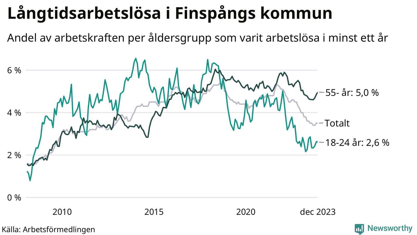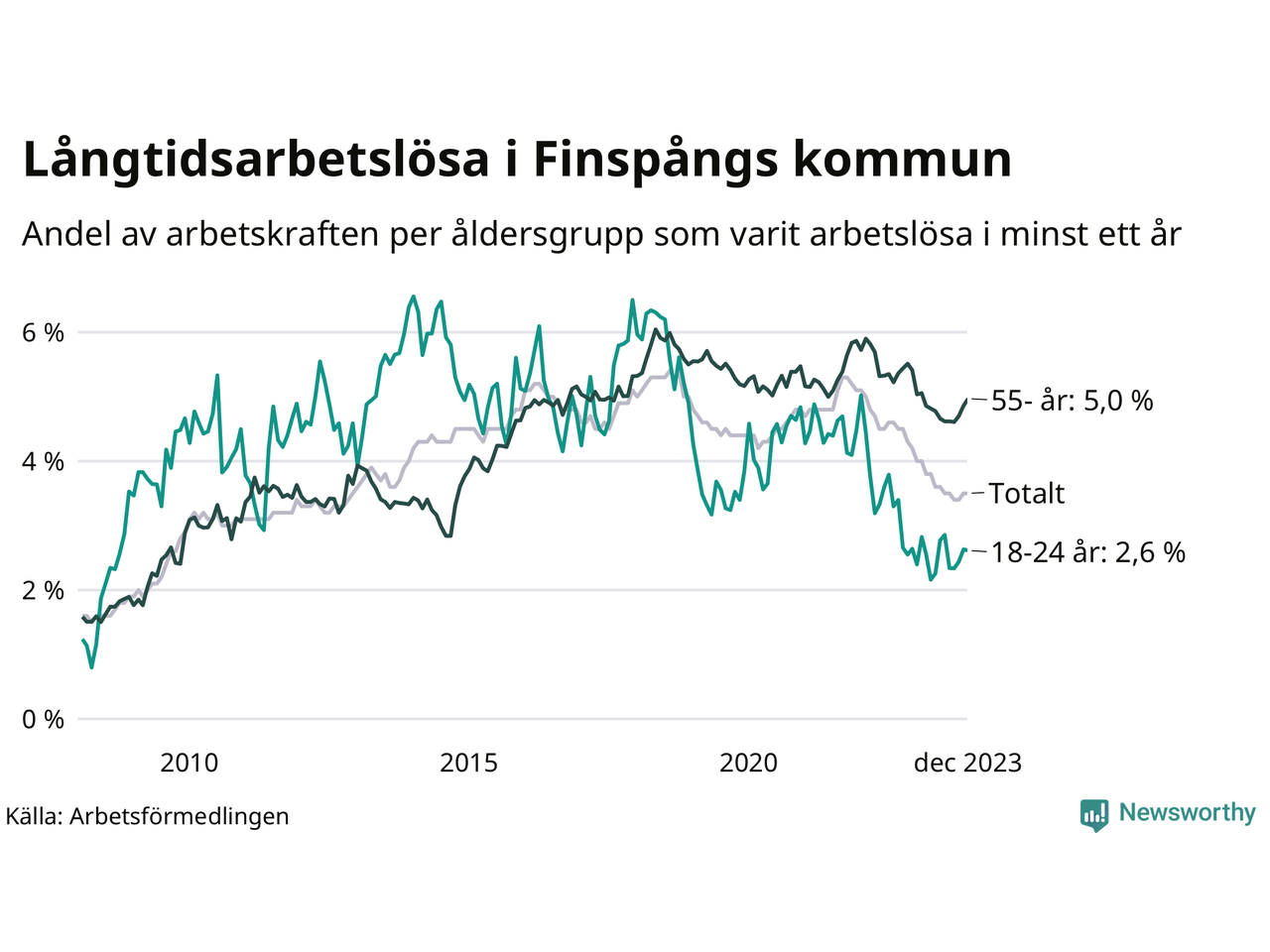 Graf: Andel arbetslösa uppdelat i åldersgrupper i Finspång