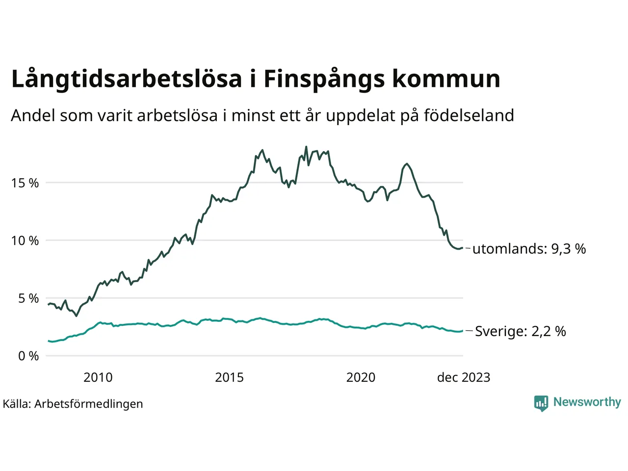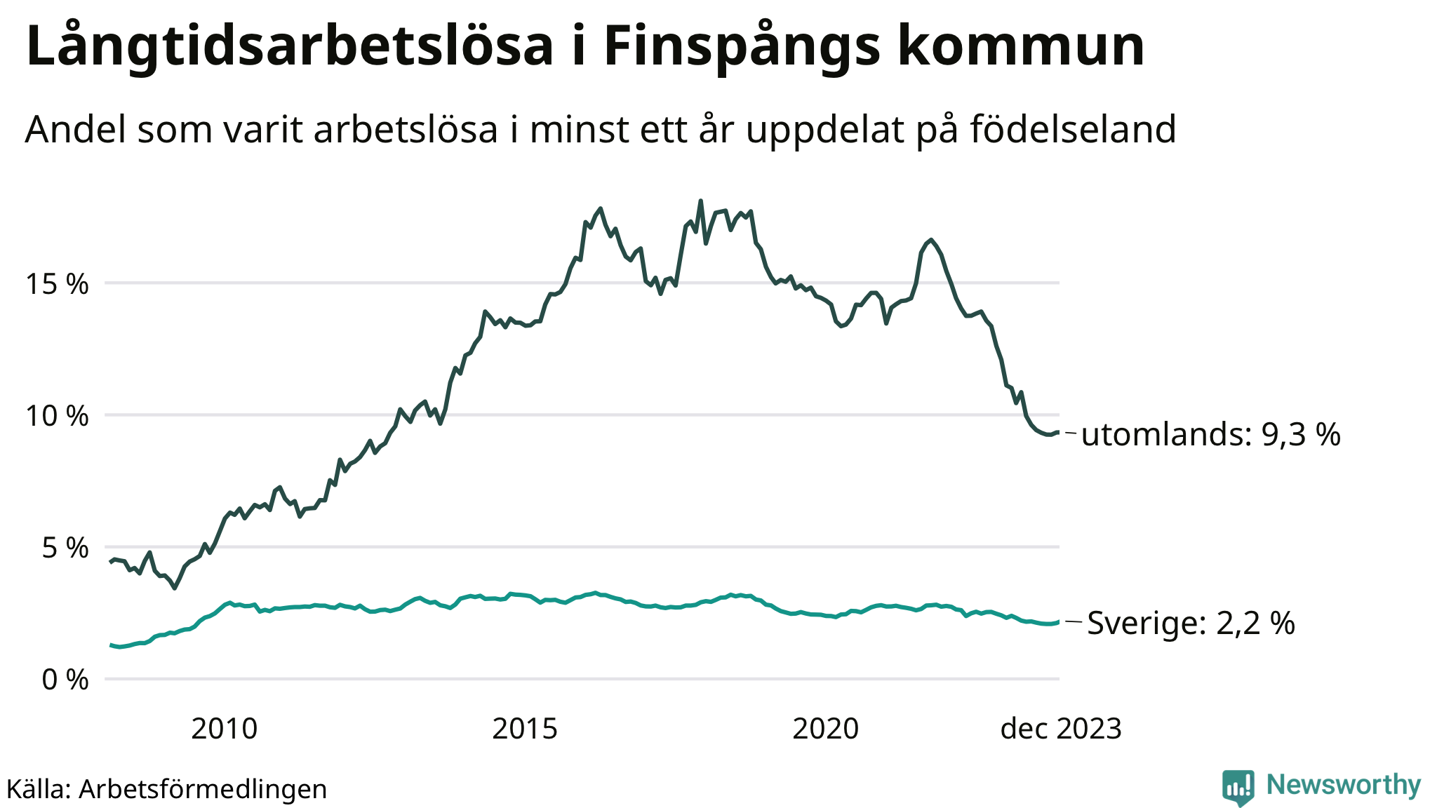 Graf: Andel arbetslösa uppdelat på födelseland i Finspång