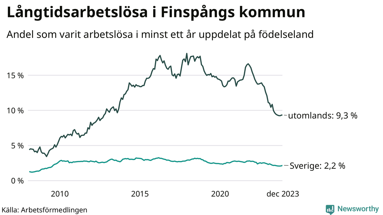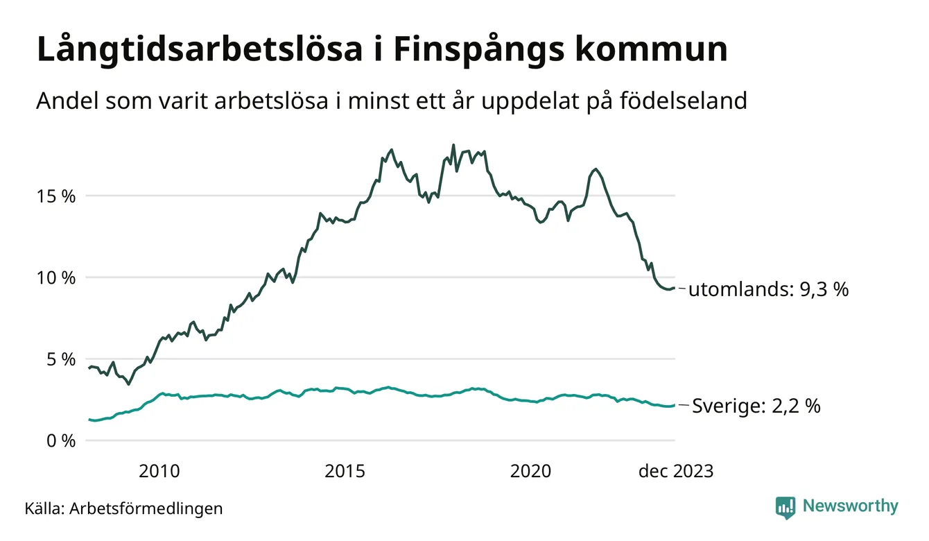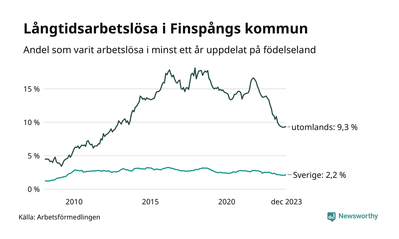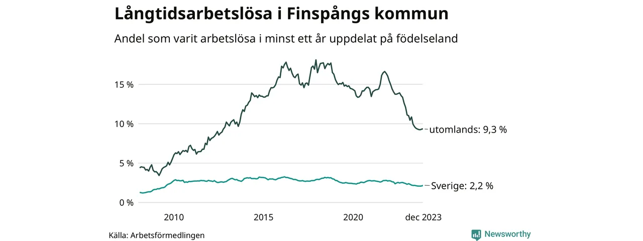 186 av de långtidsarbetslösa i Finspång är födda i Sverige, medan 184 är födda utomlands. Det innebär att långtidsarbetslösheten bland Sverigefödda är 2,2 procent, medan den är fyra gånger så hög – 9,3 procent – bland födda utomlands. Även i riket som helhet är arbetslösheten högre bland utrikesfödda.