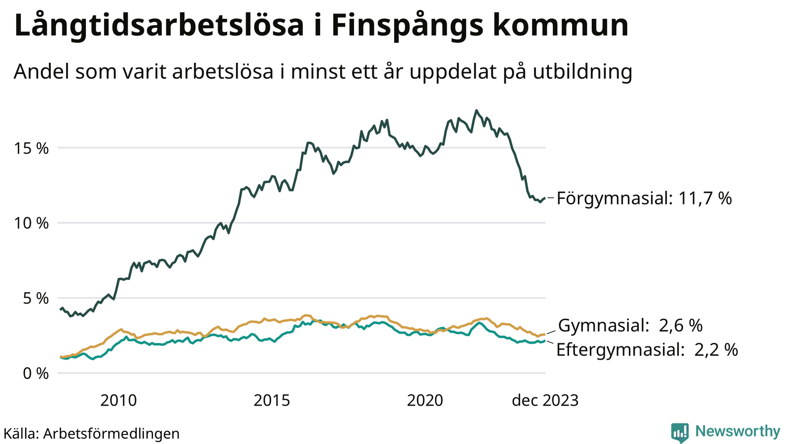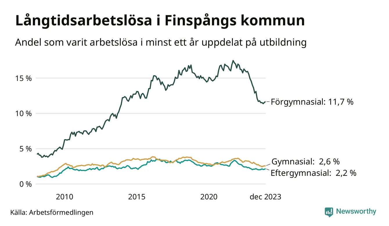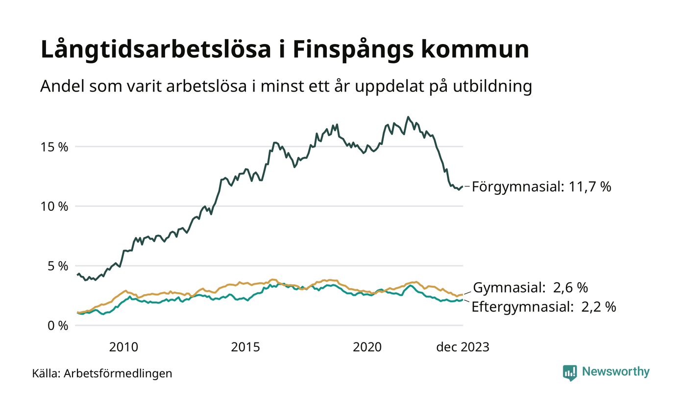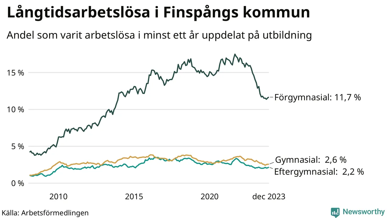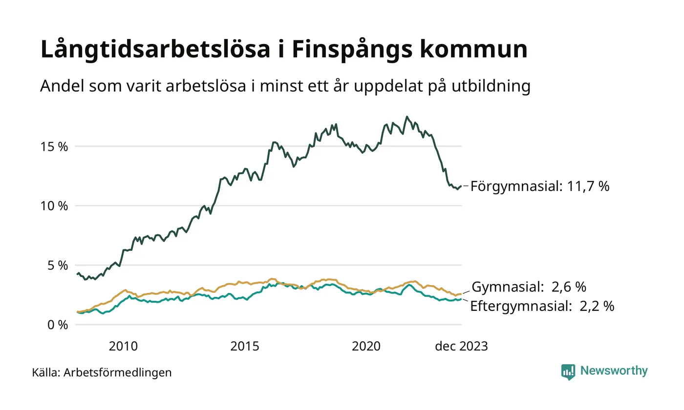 Graf över andel långtidsarbetslösa i Finspång uppdelat på utbildningsnivå