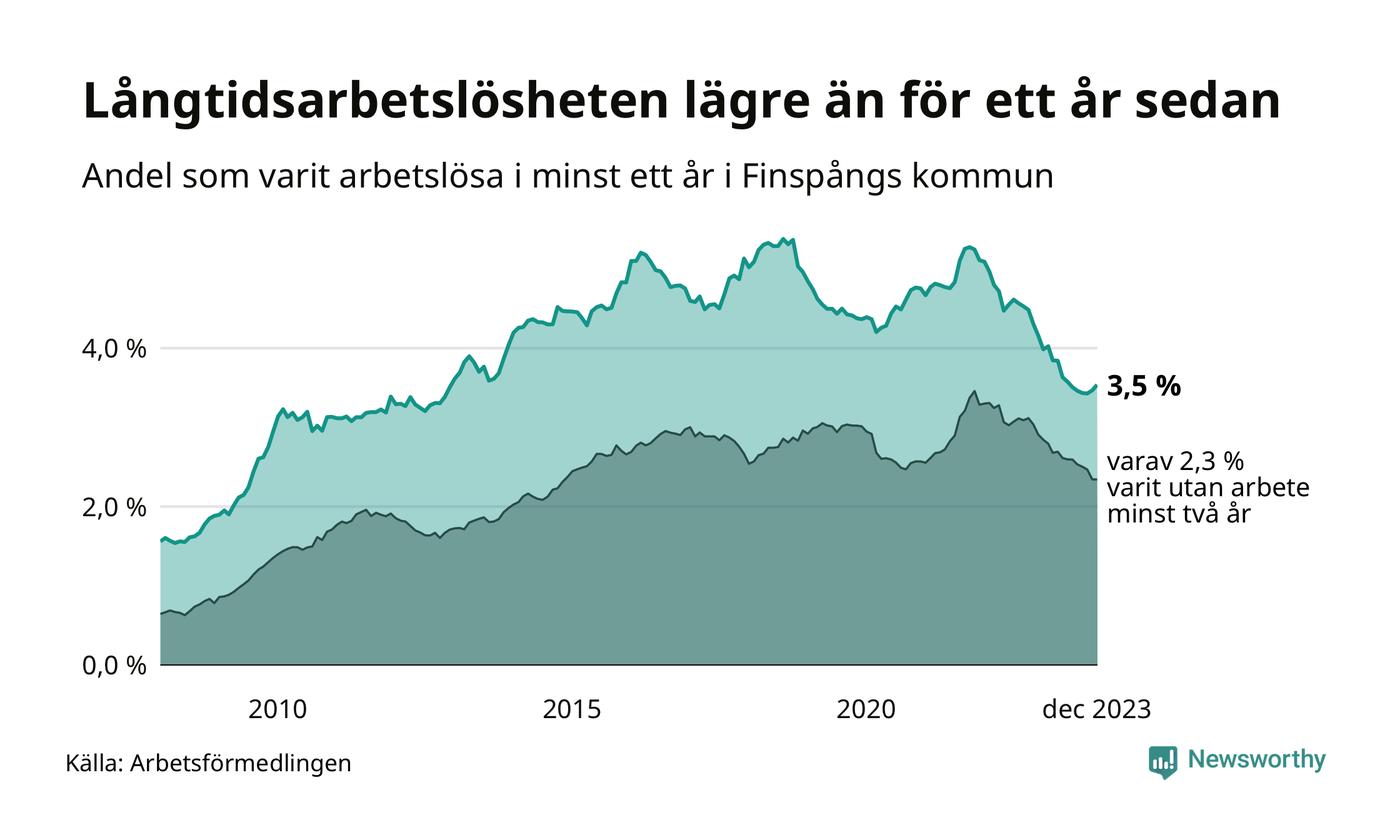 I december hade 370 Finspångsbor varit arbetslösa i minst ett år, vilket är nio fler än månaden innan. 370 personer motsvarar 3,5 procent av arbetskraften i kommunen – andelen långtidsarbetslösa är 0,7 procentenheter lägre än samma månad för ett år sedan.