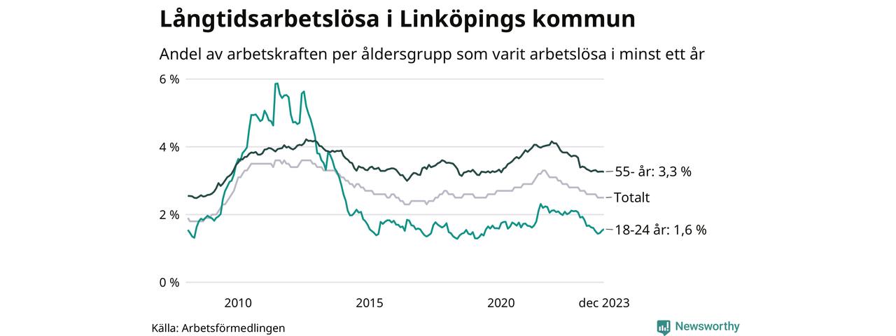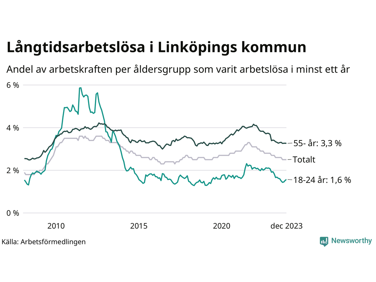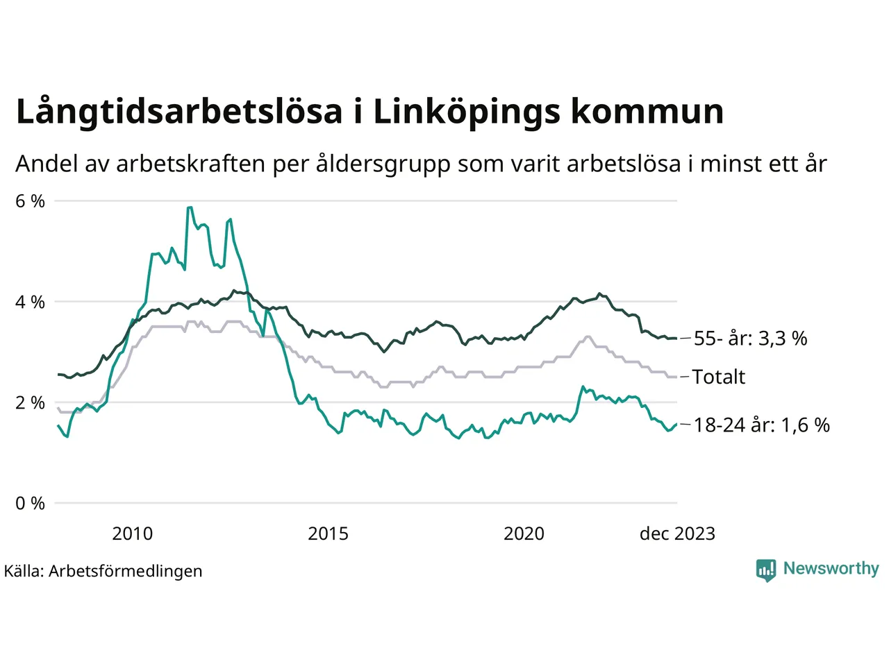 Av de 2 046 personerna som varit arbetslösa i mer än ett år i Linköpings kommun är 504 personer mellan 55 och 651 år och 145 är mellan 18 och 24 år. För den äldre gruppen är andelen arbetslösa 3,3 procent medan den i den yngre gruppen är 1,6 procent. Även i riket som helhet är långtidsarbetslösheten högre i gruppen äldre.