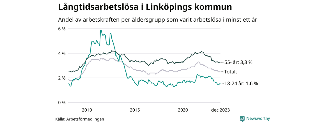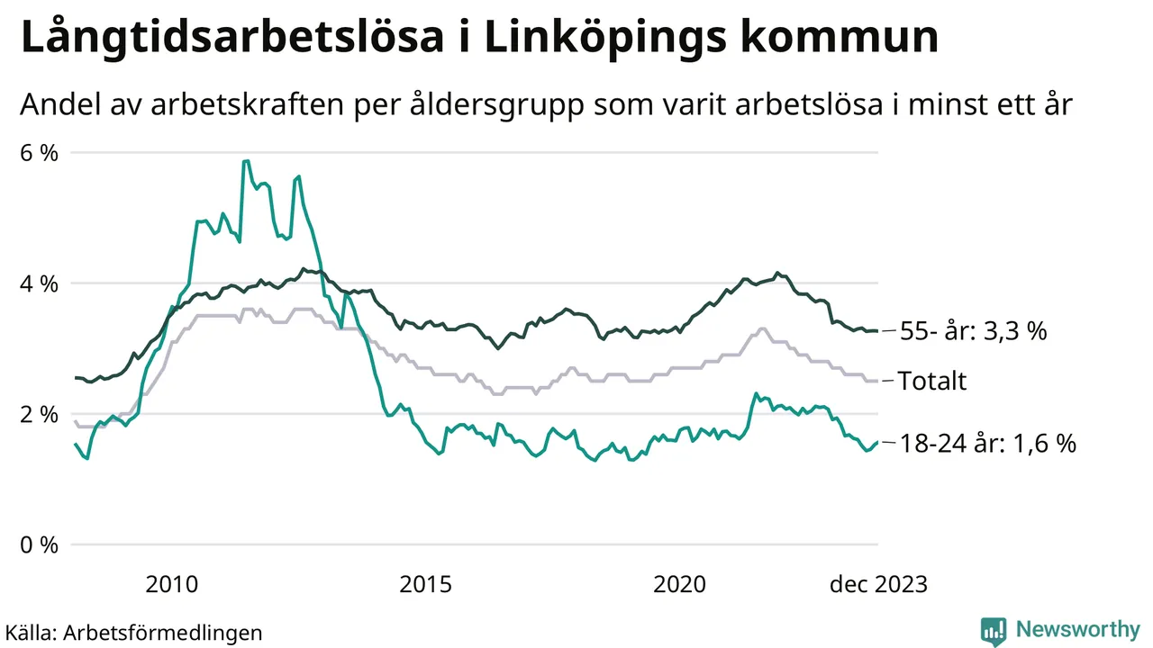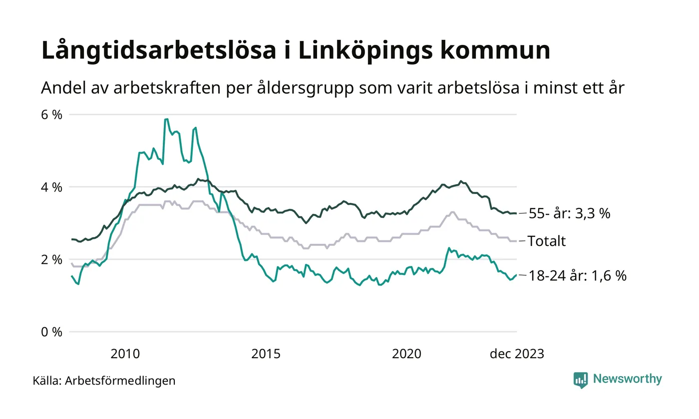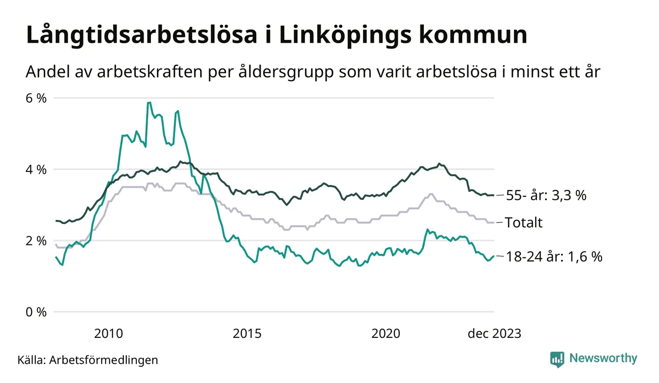 Av de 2 046 personerna som varit arbetslösa i mer än ett år i Linköpings kommun är 504 personer mellan 55 och 651 år och 145 är mellan 18 och 24 år. För den äldre gruppen är andelen arbetslösa 3,3 procent medan den i den yngre gruppen är 1,6 procent. Även i riket som helhet är långtidsarbetslösheten högre i gruppen äldre.