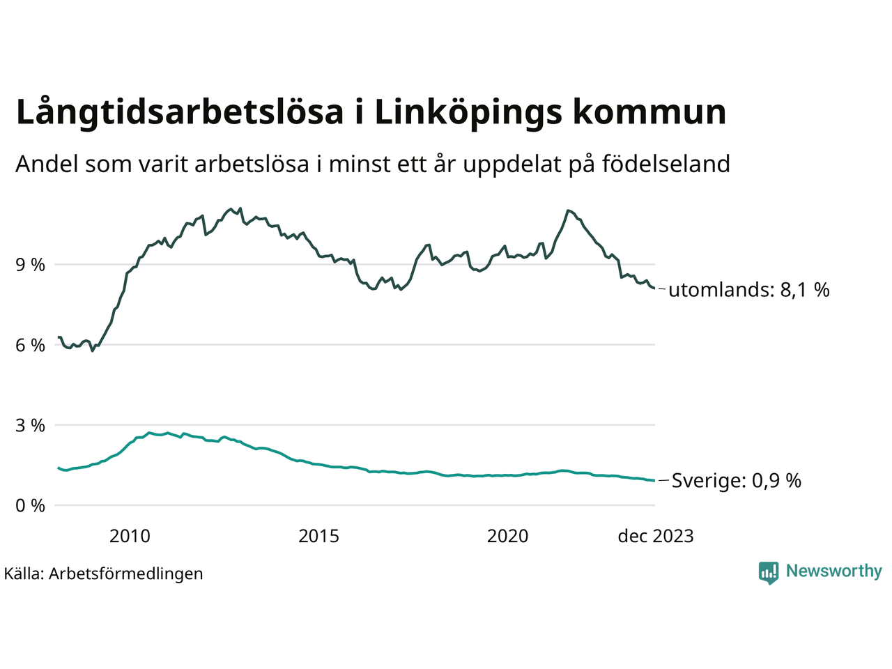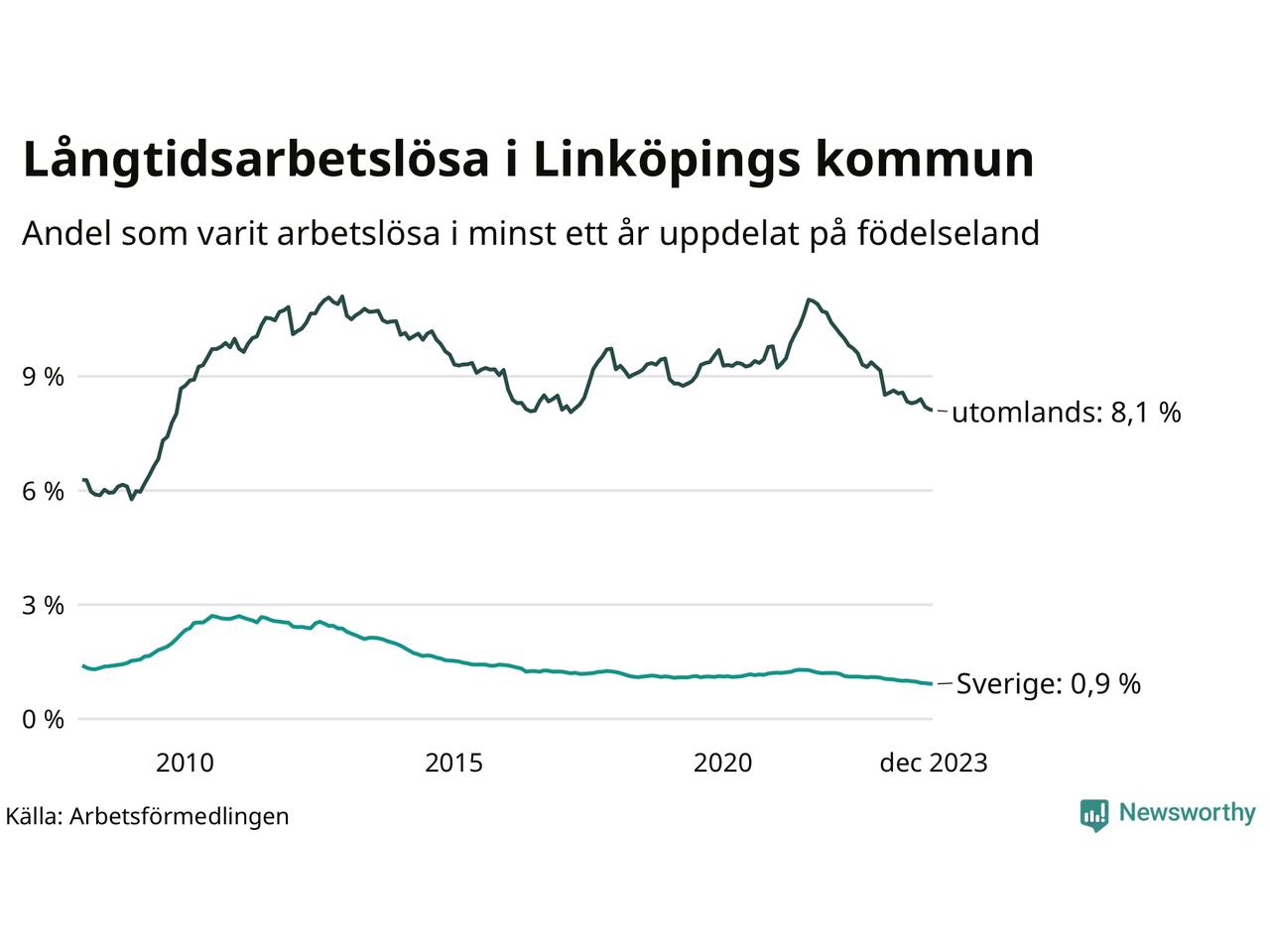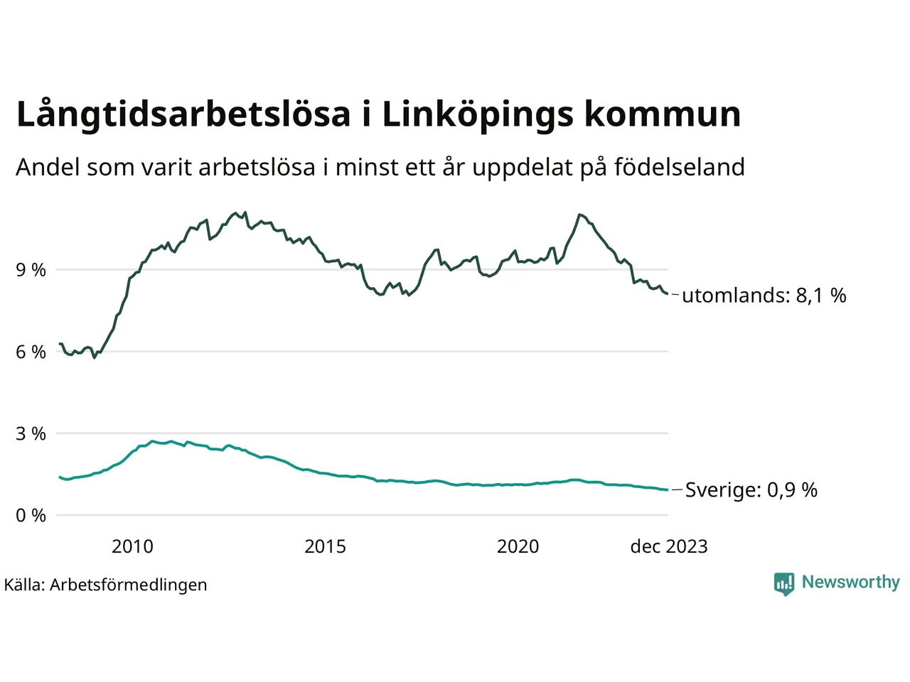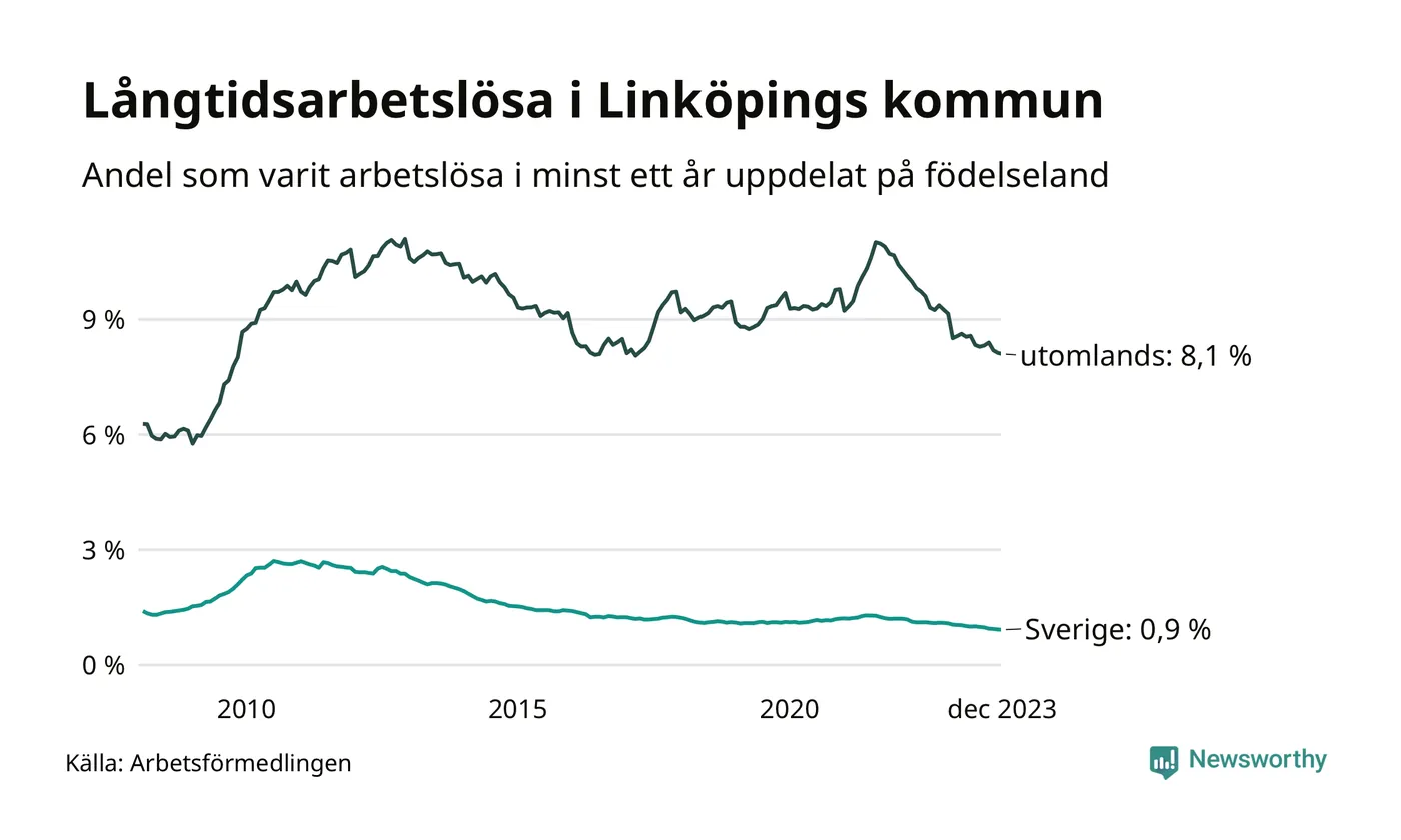 598 av de långtidsarbetslösa i Linköping är födda i Sverige, medan 1 448 är födda utomlands. Det innebär att långtidsarbetslösheten bland Sverigefödda är 0,9 procent, medan den är nio gånger så hög – 8,1 procent – bland födda utomlands. Även i riket som helhet är arbetslösheten högre bland utrikesfödda.