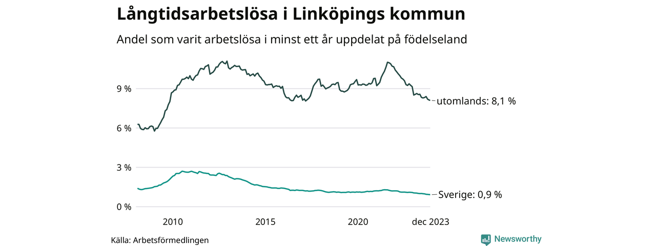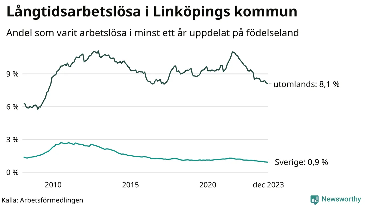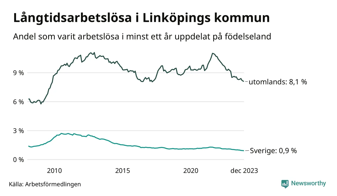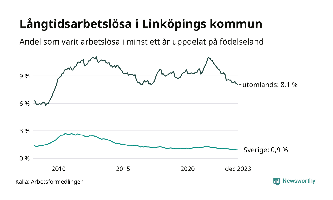 598 av de långtidsarbetslösa i Linköping är födda i Sverige, medan 1 448 är födda utomlands. Det innebär att långtidsarbetslösheten bland Sverigefödda är 0,9 procent, medan den är nio gånger så hög – 8,1 procent – bland födda utomlands. Även i riket som helhet är arbetslösheten högre bland utrikesfödda.