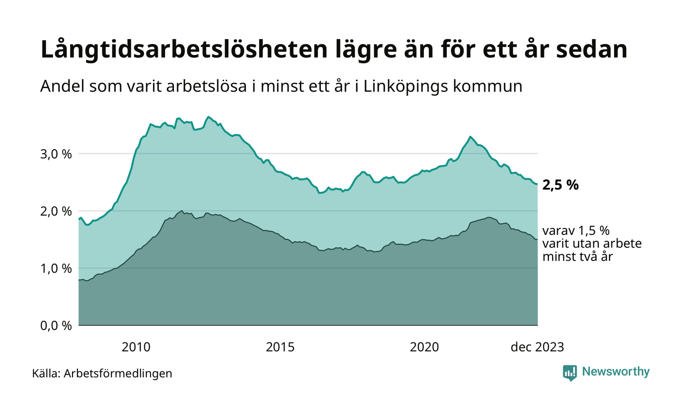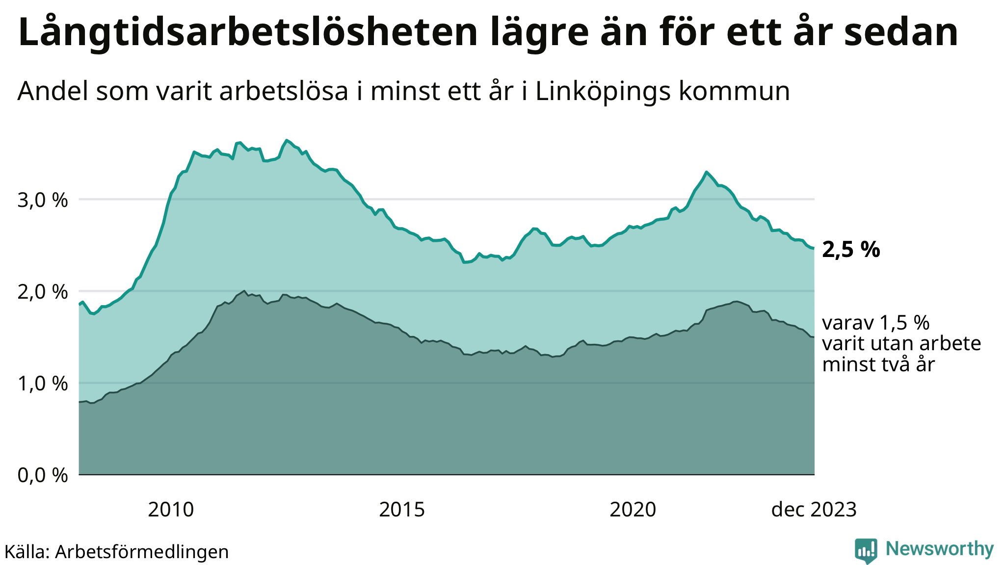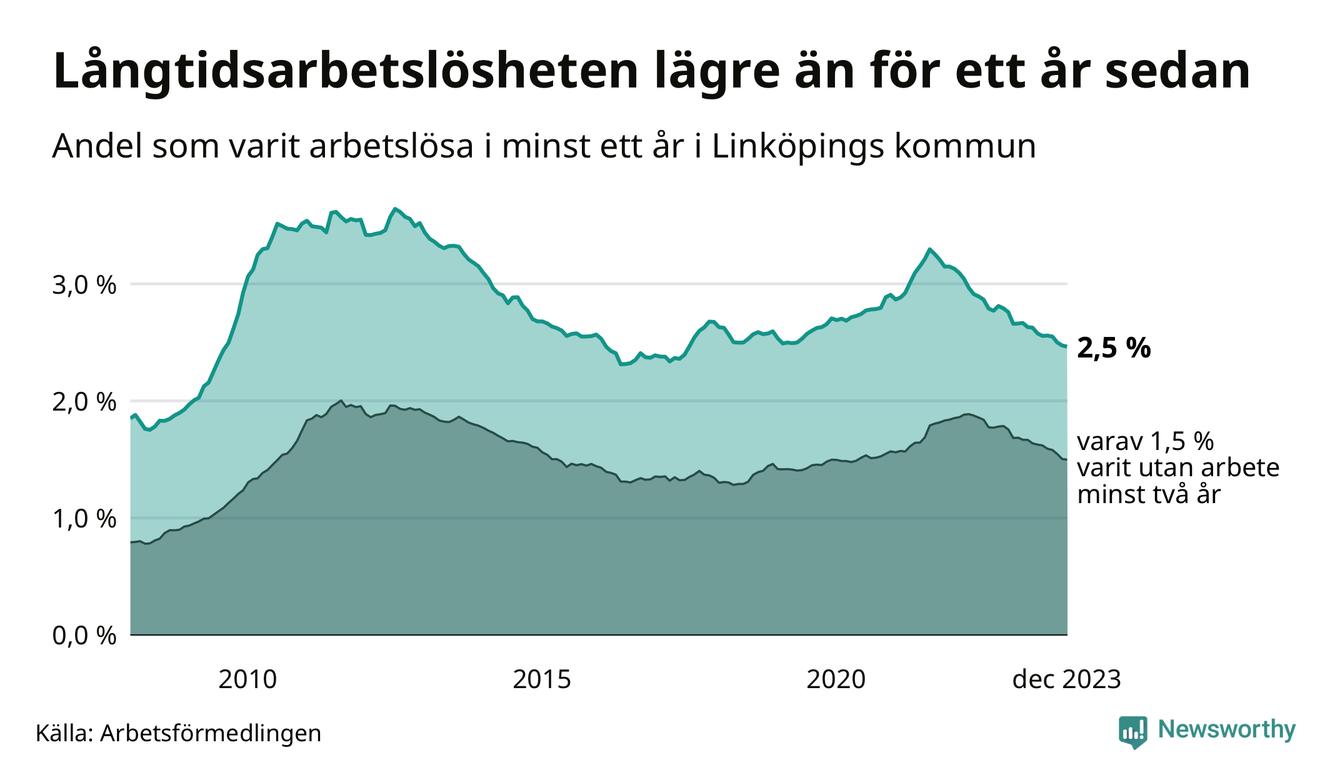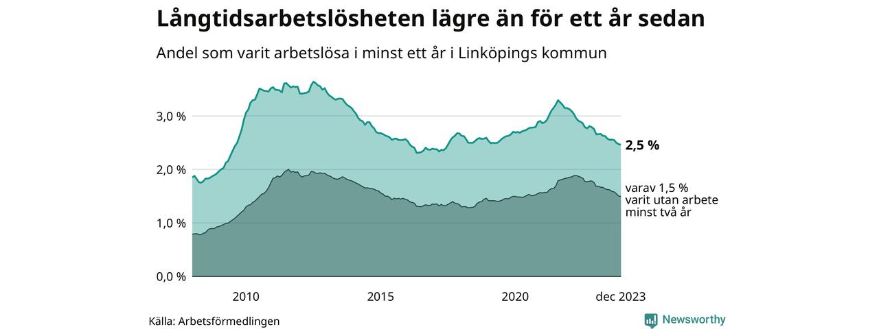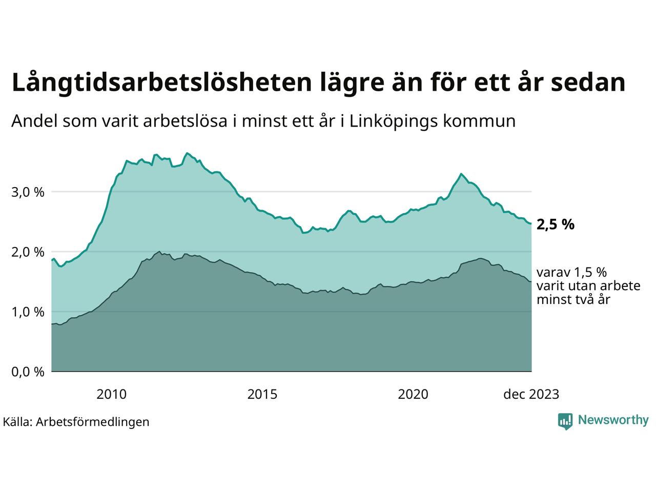 I december hade 2 046 Linköpingsbor varit arbetslösa i minst ett år, vilket är sex färre än månaden innan. Det är den fjärde månaden i rad med minskande antal långtidsarbetslösa. 2 046 personer motsvarar 2,5 procent av arbetskraften i kommunen – andelen långtidsarbetslösa är 0,3 procentenheter lägre än samma månad för ett år sedan.