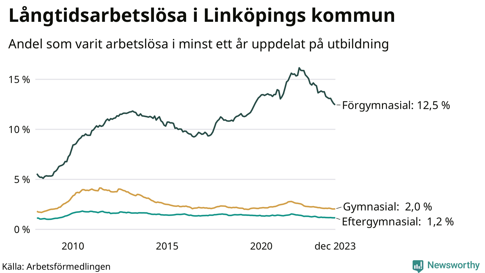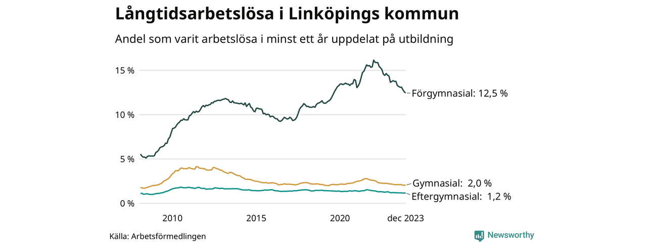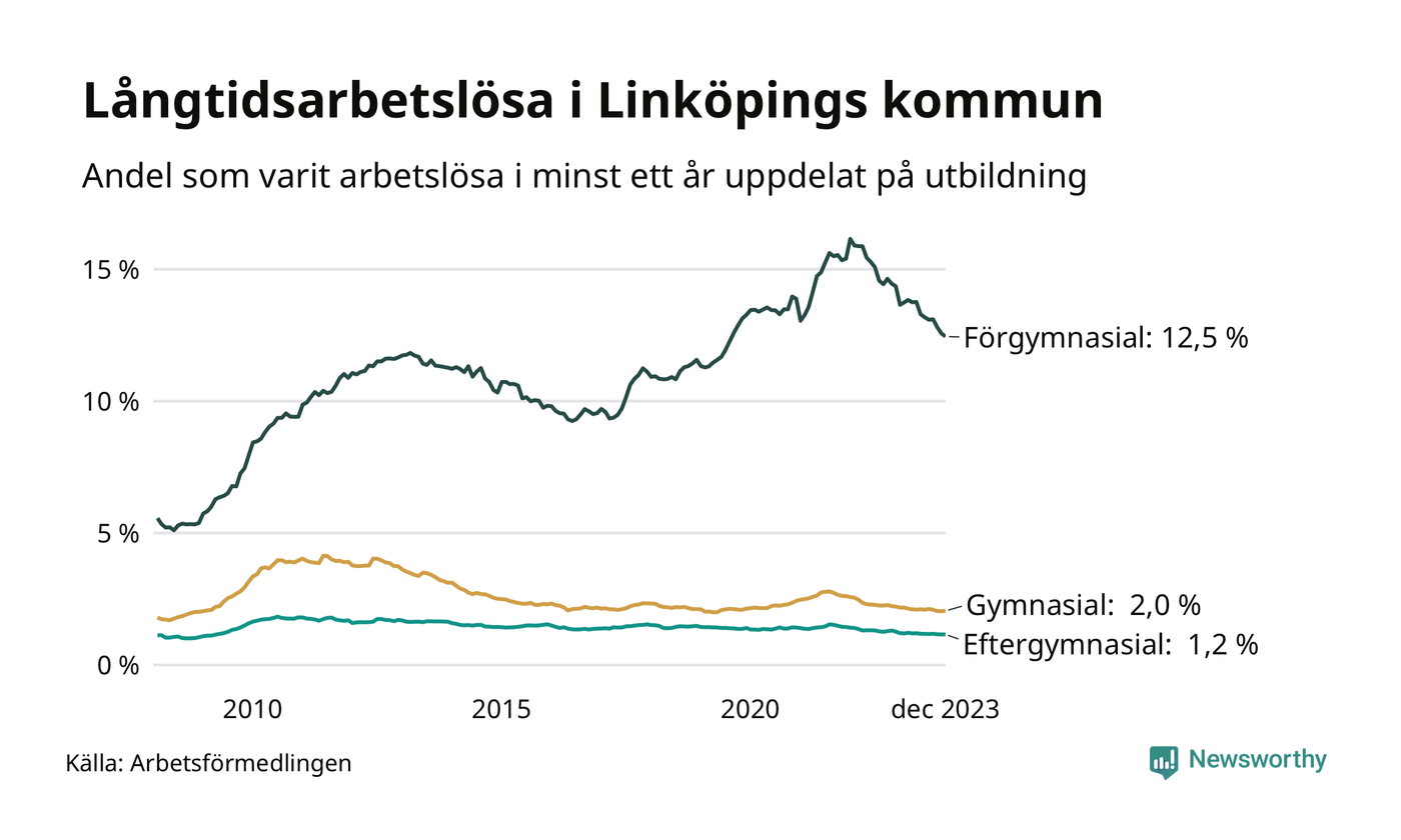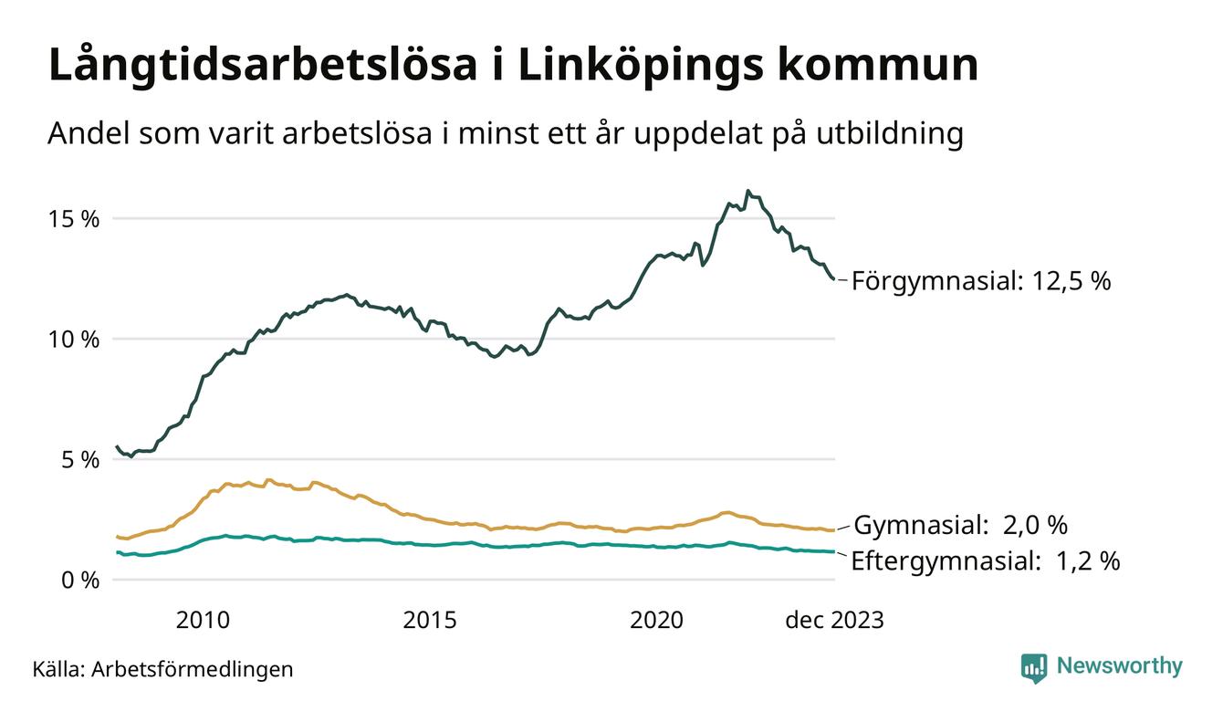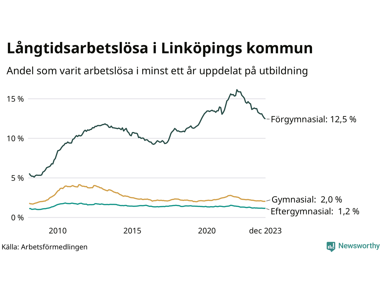 I december hade 2 046 Linköpingsbor varit arbetslösa i minst ett år, vilket är sex färre än månaden innan. Det är den fjärde månaden i rad med minskande antal långtidsarbetslösa. 2 046 personer motsvarar 2,5 procent av arbetskraften i kommunen – andelen långtidsarbetslösa är 0,3 procentenheter lägre än samma månad för ett år sedan.