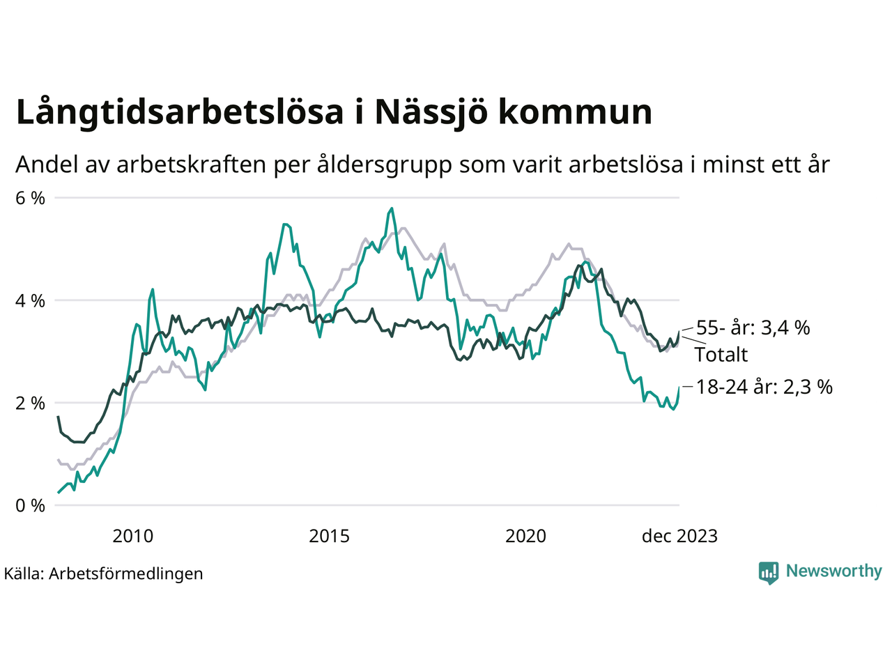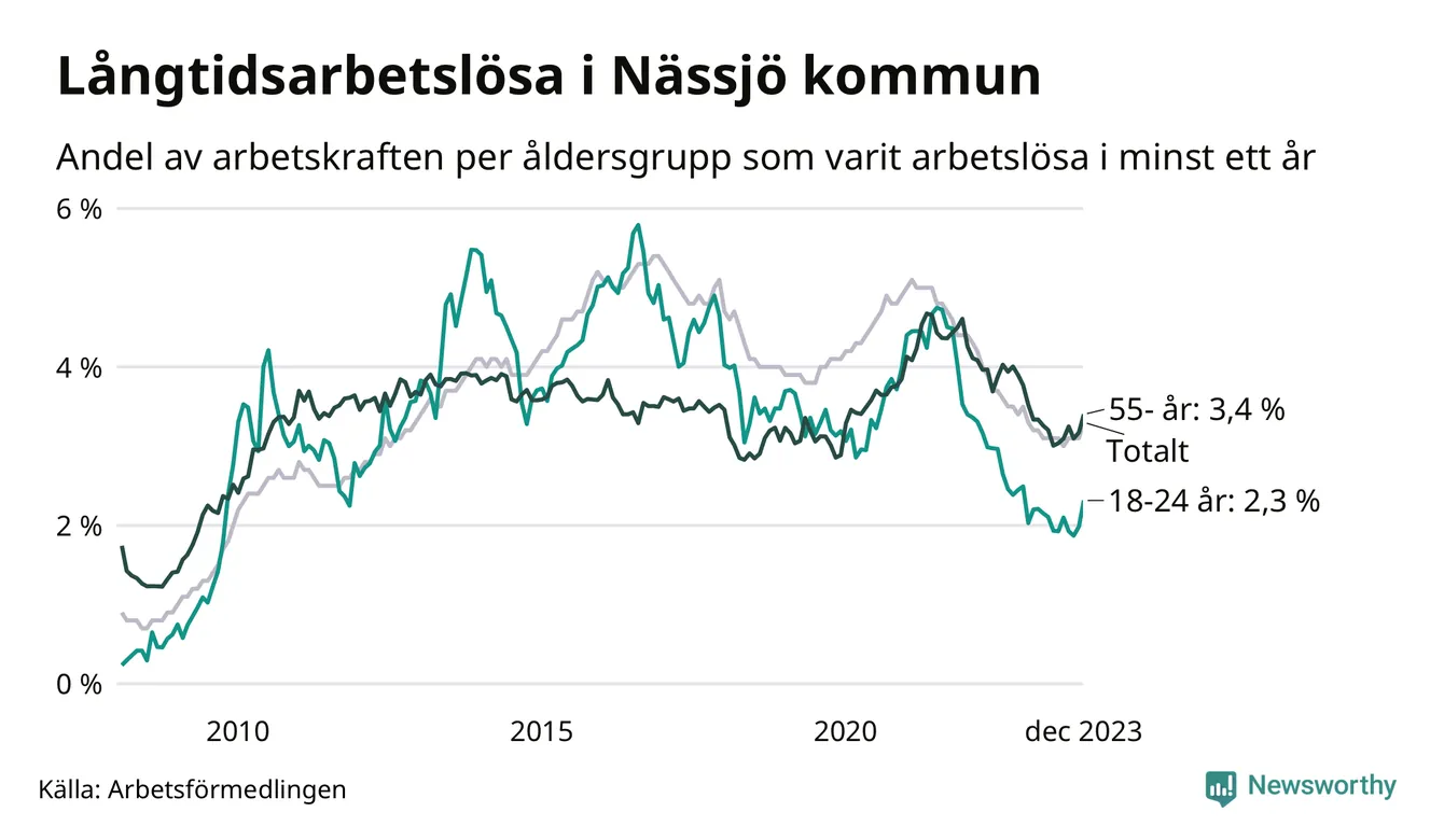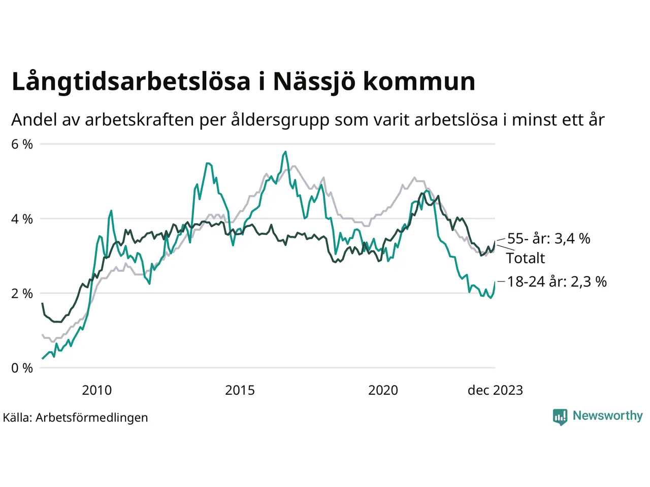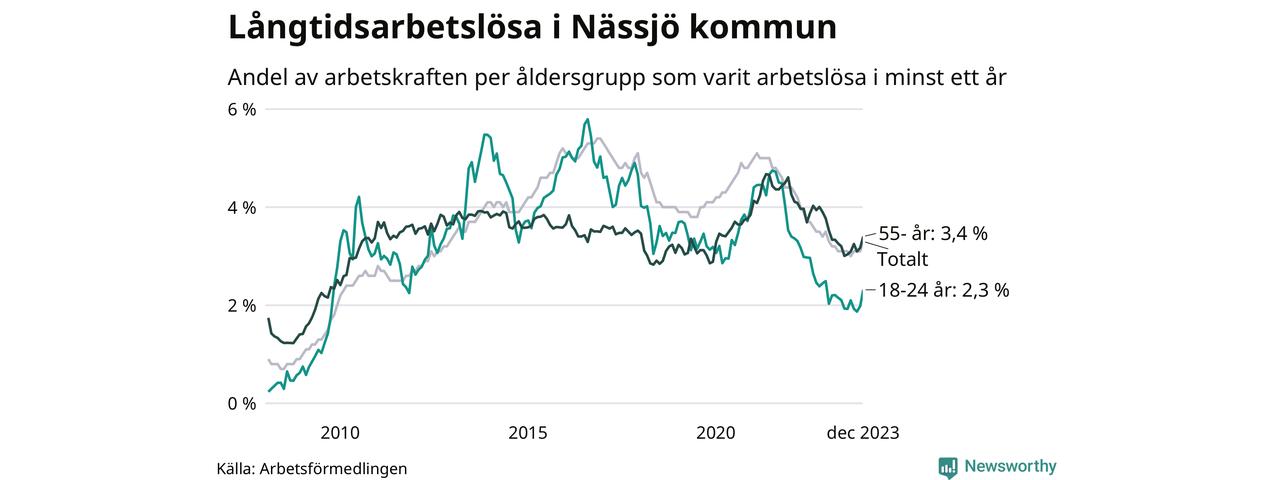 Av de 514 personerna som varit arbetslösa i mer än ett år i Nässjö kommun är 117 personer mellan 55 och 651 år och 40 är mellan 18 och 24 år. För den äldre gruppen är andelen arbetslösa 3,4 procent medan den i den yngre gruppen är 2,3 procent. Även i riket som helhet är långtidsarbetslösheten högre i gruppen äldre.