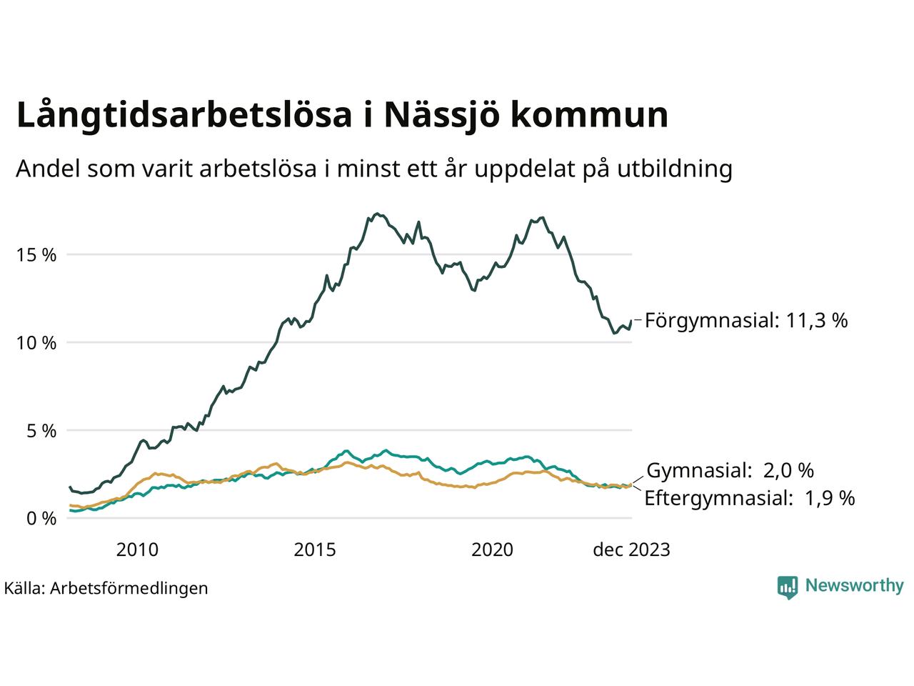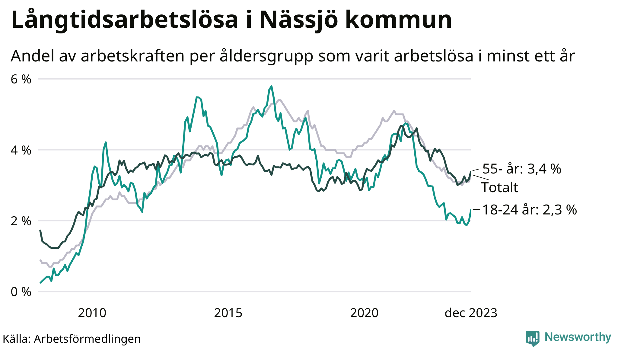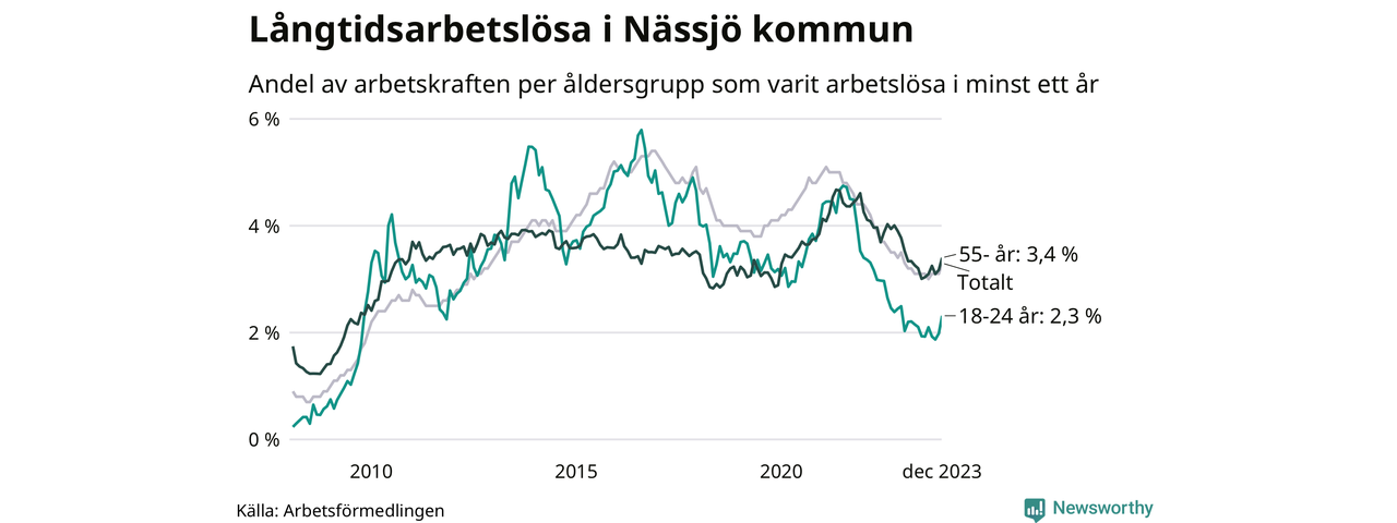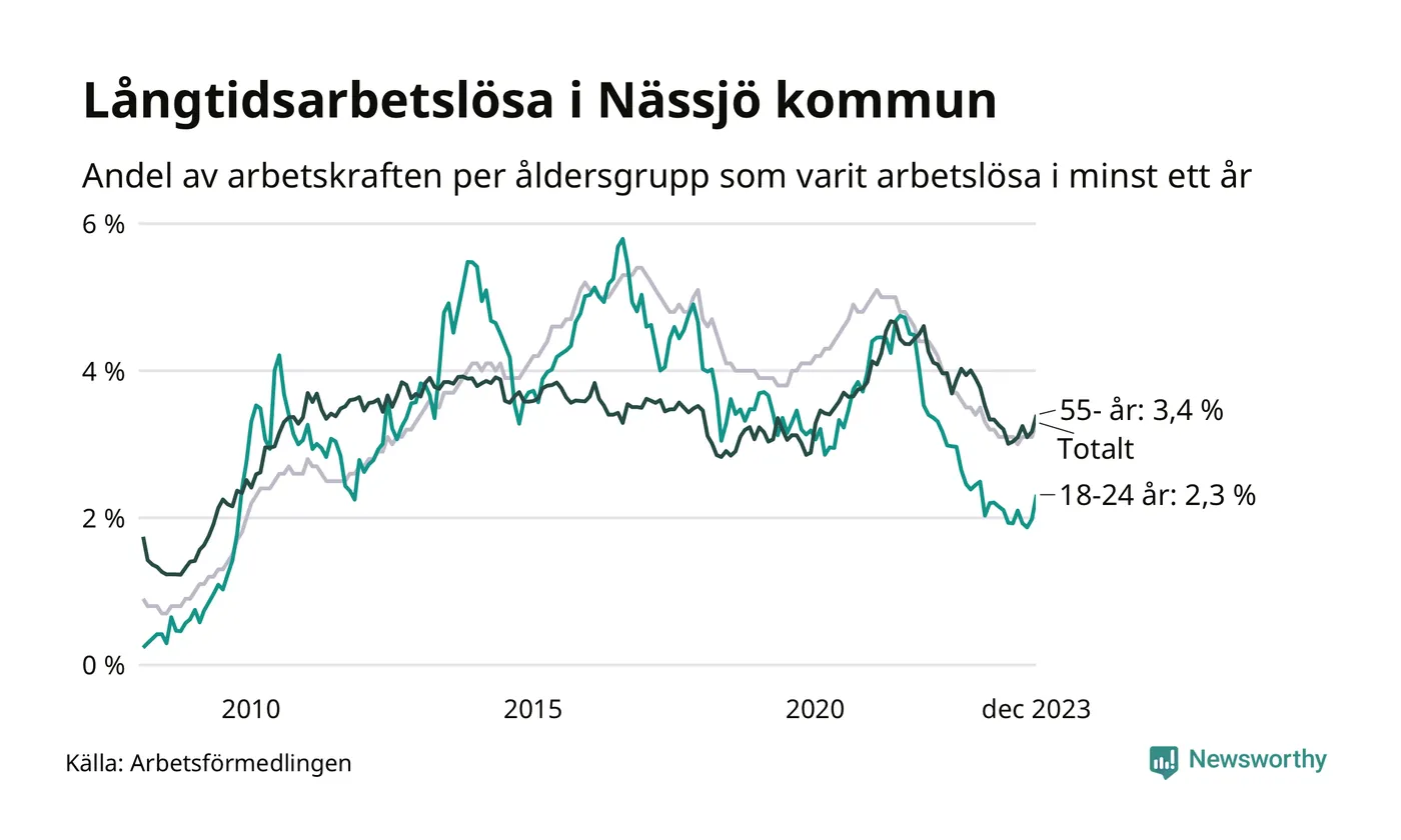 Av de 514 personerna som varit arbetslösa i mer än ett år i Nässjö kommun är 117 personer mellan 55 och 651 år och 40 är mellan 18 och 24 år. För den äldre gruppen är andelen arbetslösa 3,4 procent medan den i den yngre gruppen är 2,3 procent. Även i riket som helhet är långtidsarbetslösheten högre i gruppen äldre.
