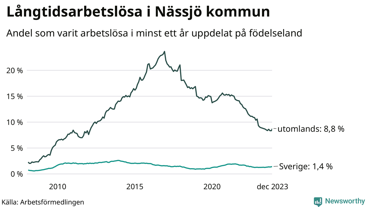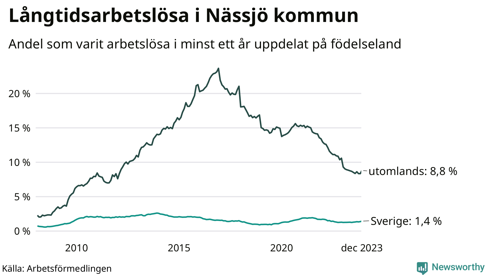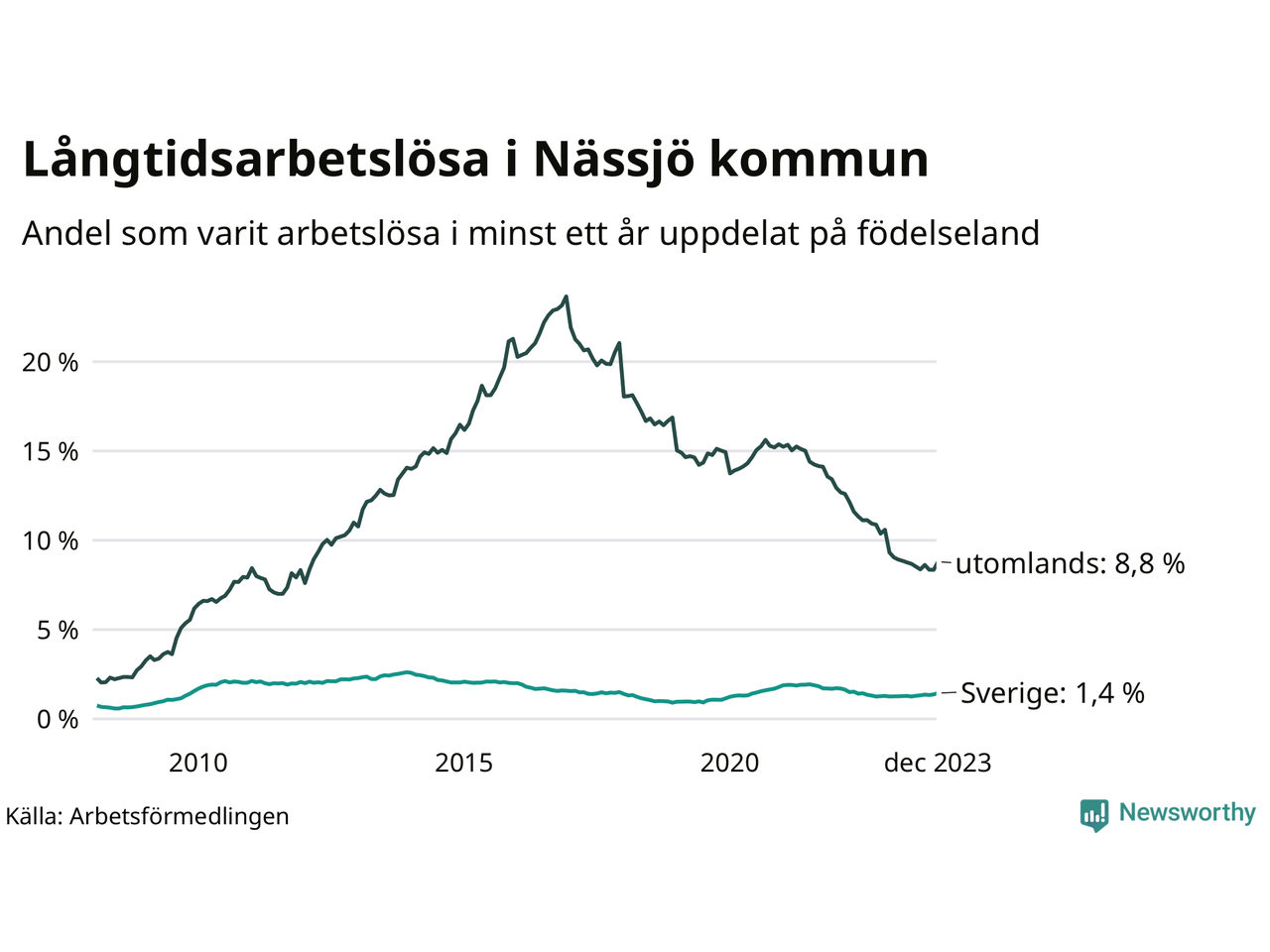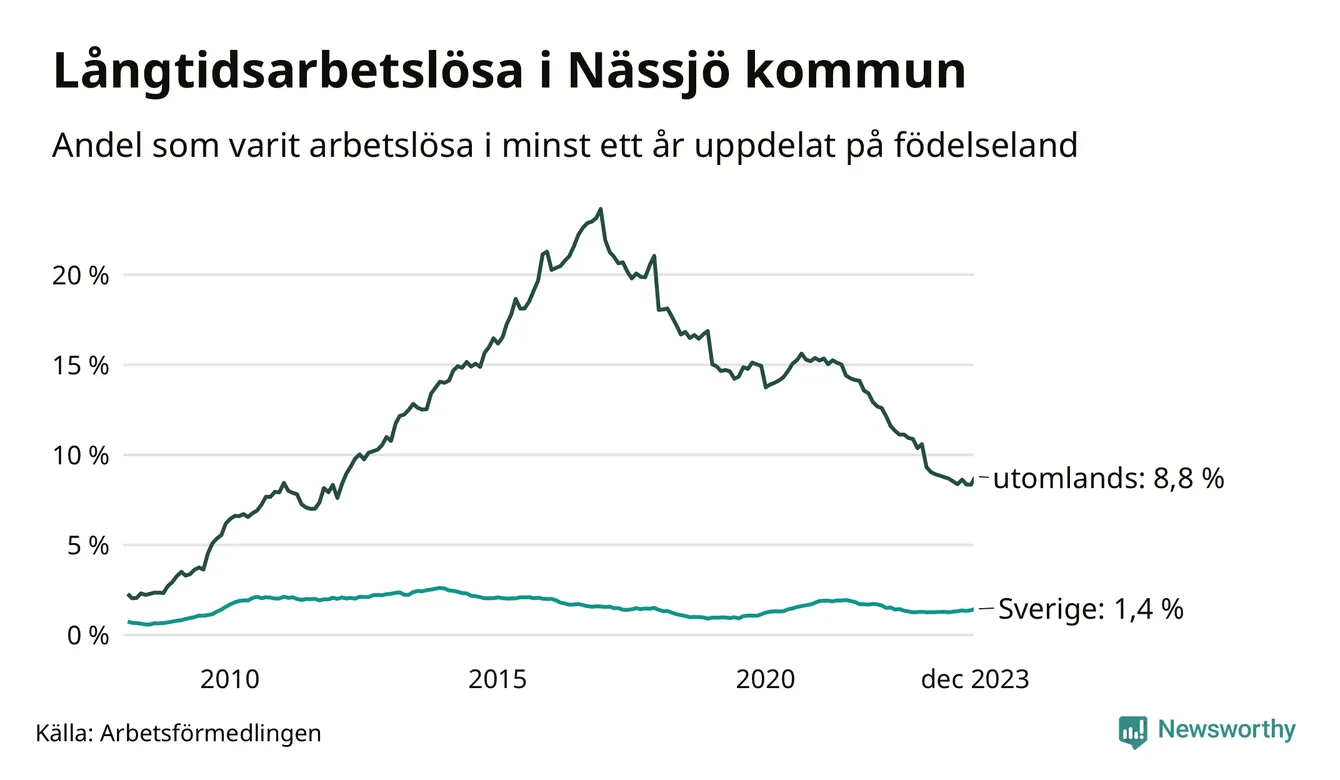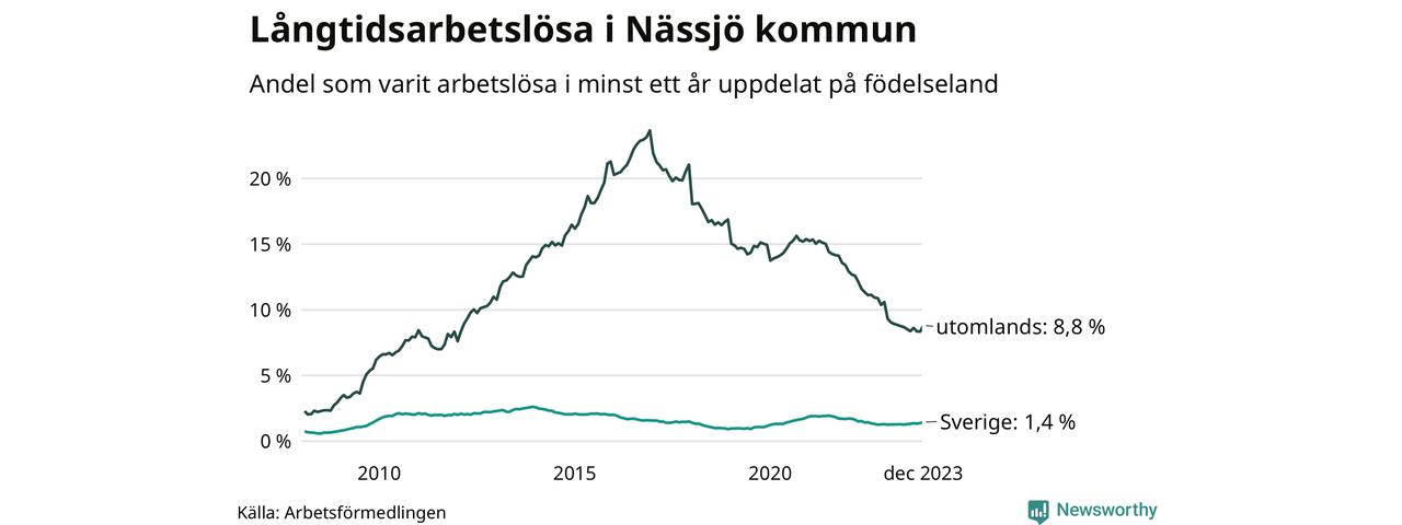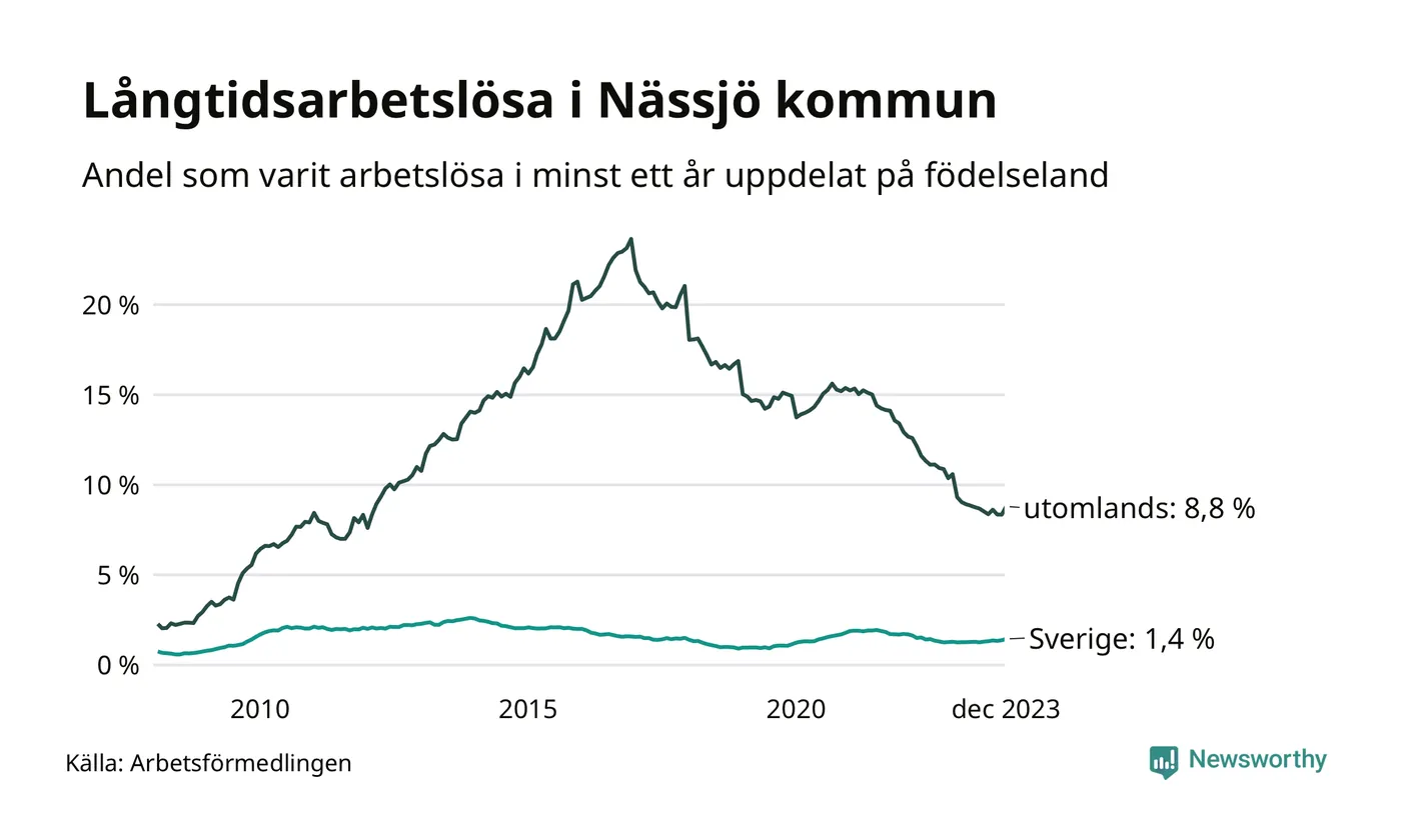 171 av de långtidsarbetslösa i Nässjö är födda i Sverige, medan 343 är födda utomlands. Det innebär att långtidsarbetslösheten bland Sverigefödda är 1,4 procent, medan den är sex gånger så hög – 8,8 procent – bland födda utomlands. Även i riket som helhet är arbetslösheten högre bland utrikesfödda.