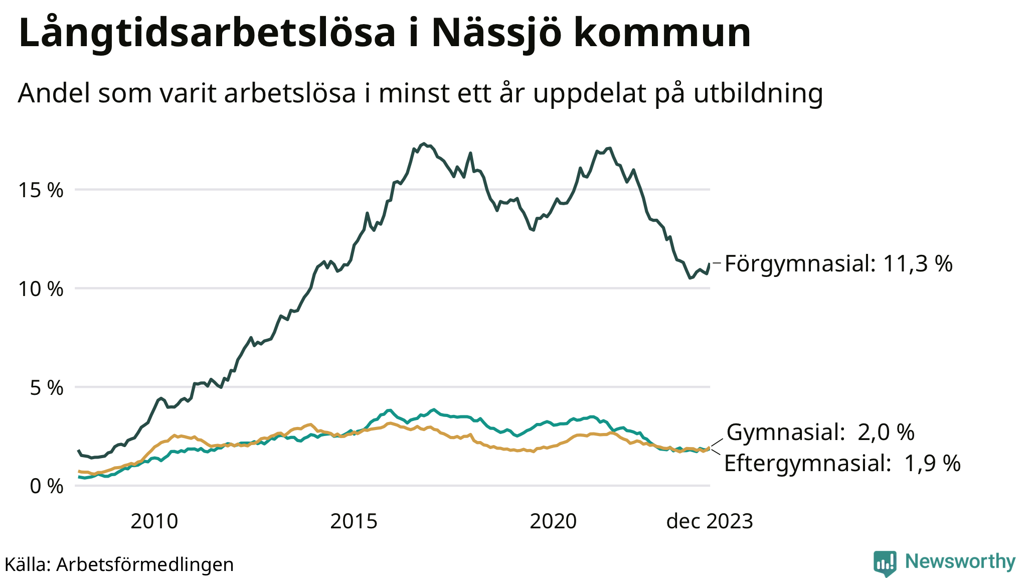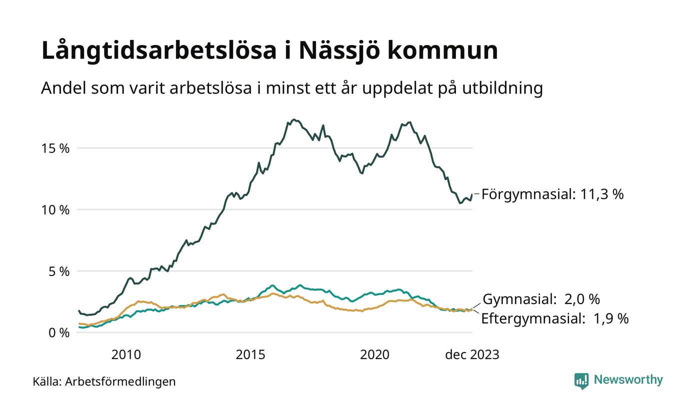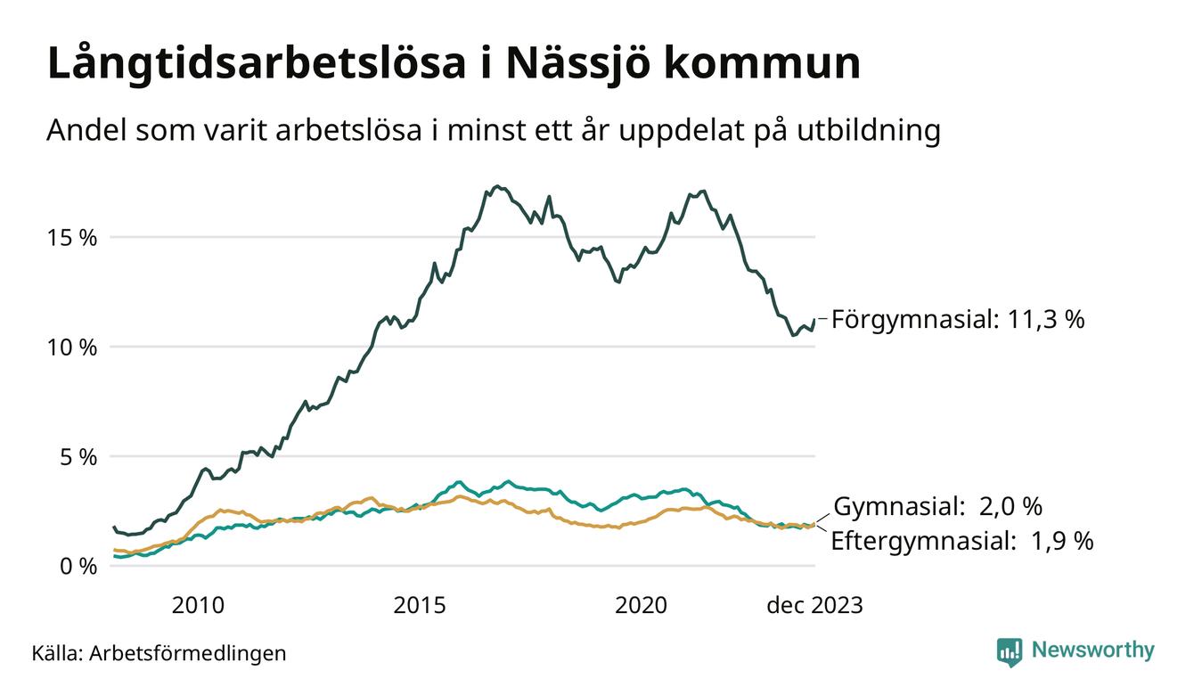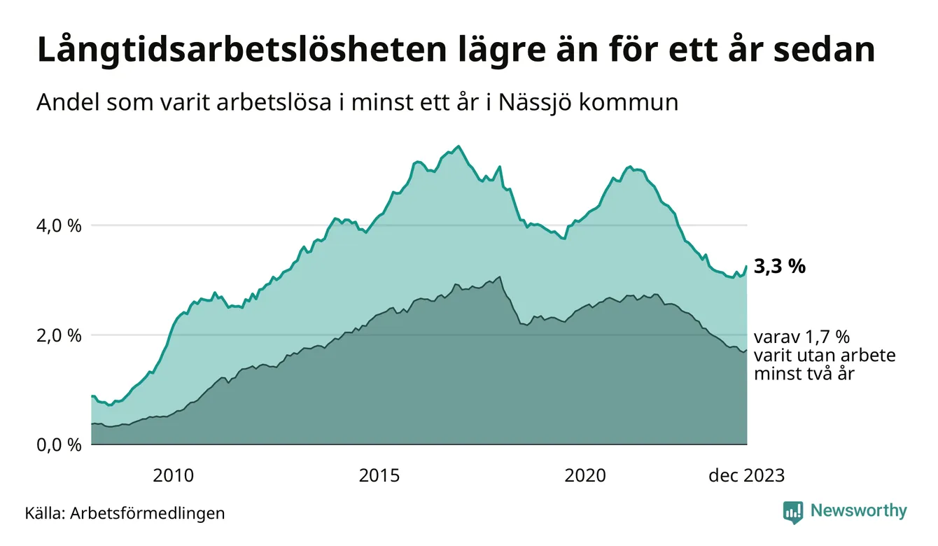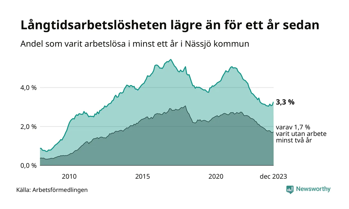 Andelen långtidsarbetslösa i Nässjö är den högsta i Jönköpings län. I Habo finns länets lägsta långtidsarbetslöshet, 1,1 procent. I Jönköpings län som helhet hade 3 816 personer (2,1 procent) varit arbetslösa i minst ett år i december. Det är 108 personer fler än månaden innan.