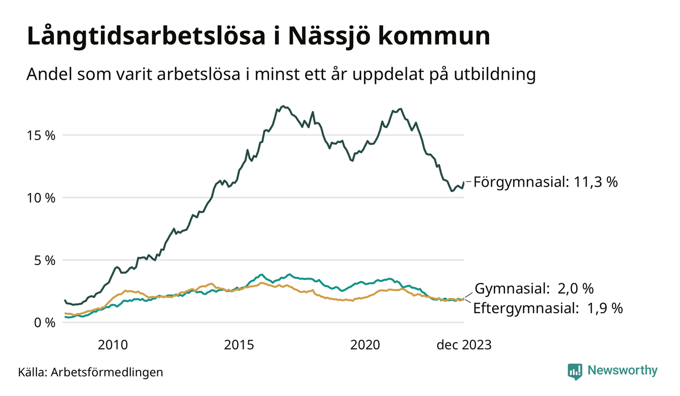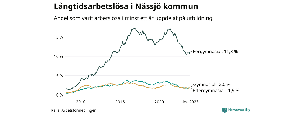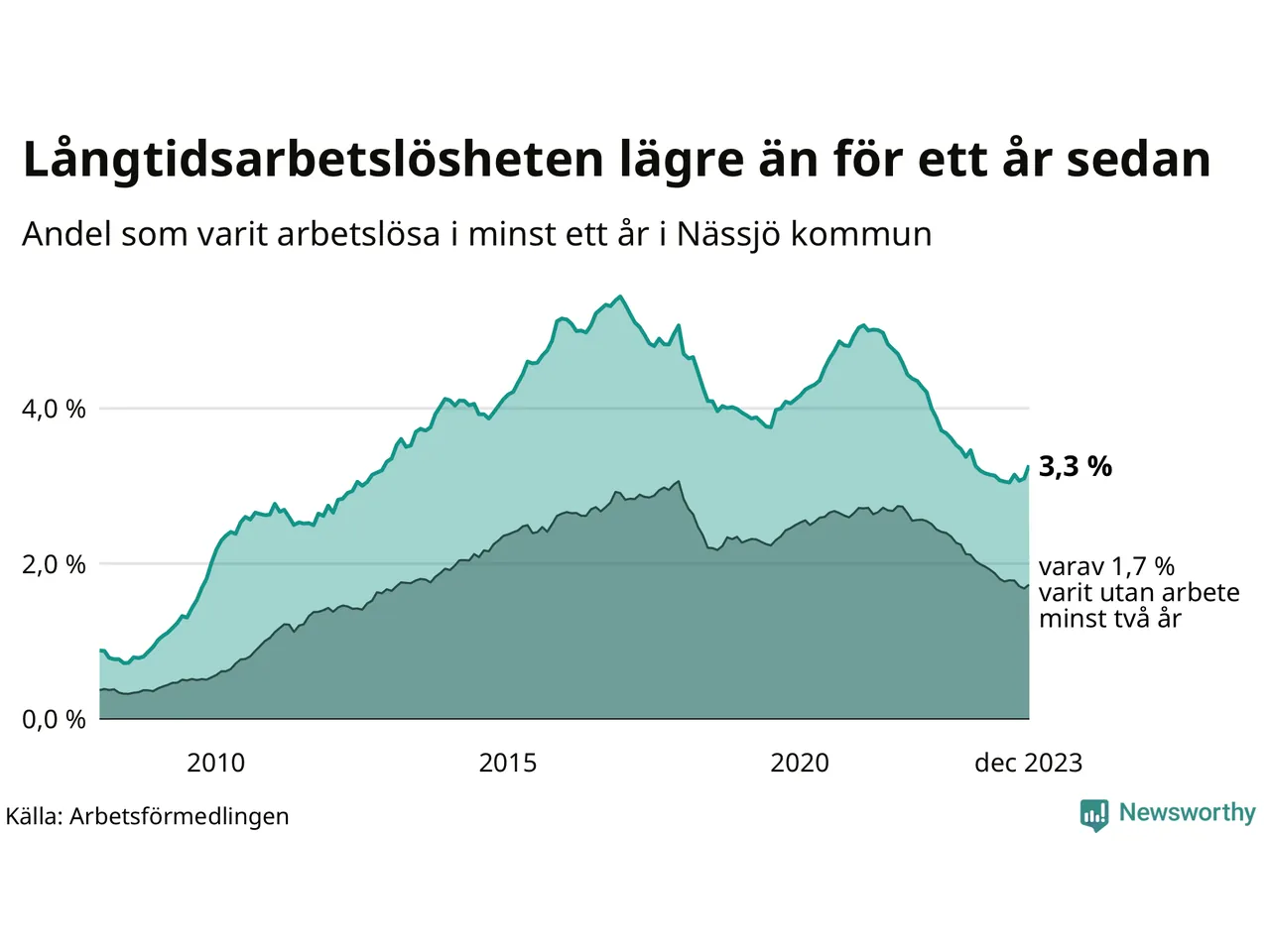 Andelen som varit utan arbete i minst ett år i Nässjö i december var lägre än för ett år sedan. Men jämfört med i november har antalet långtidsarbetslösa ökat.