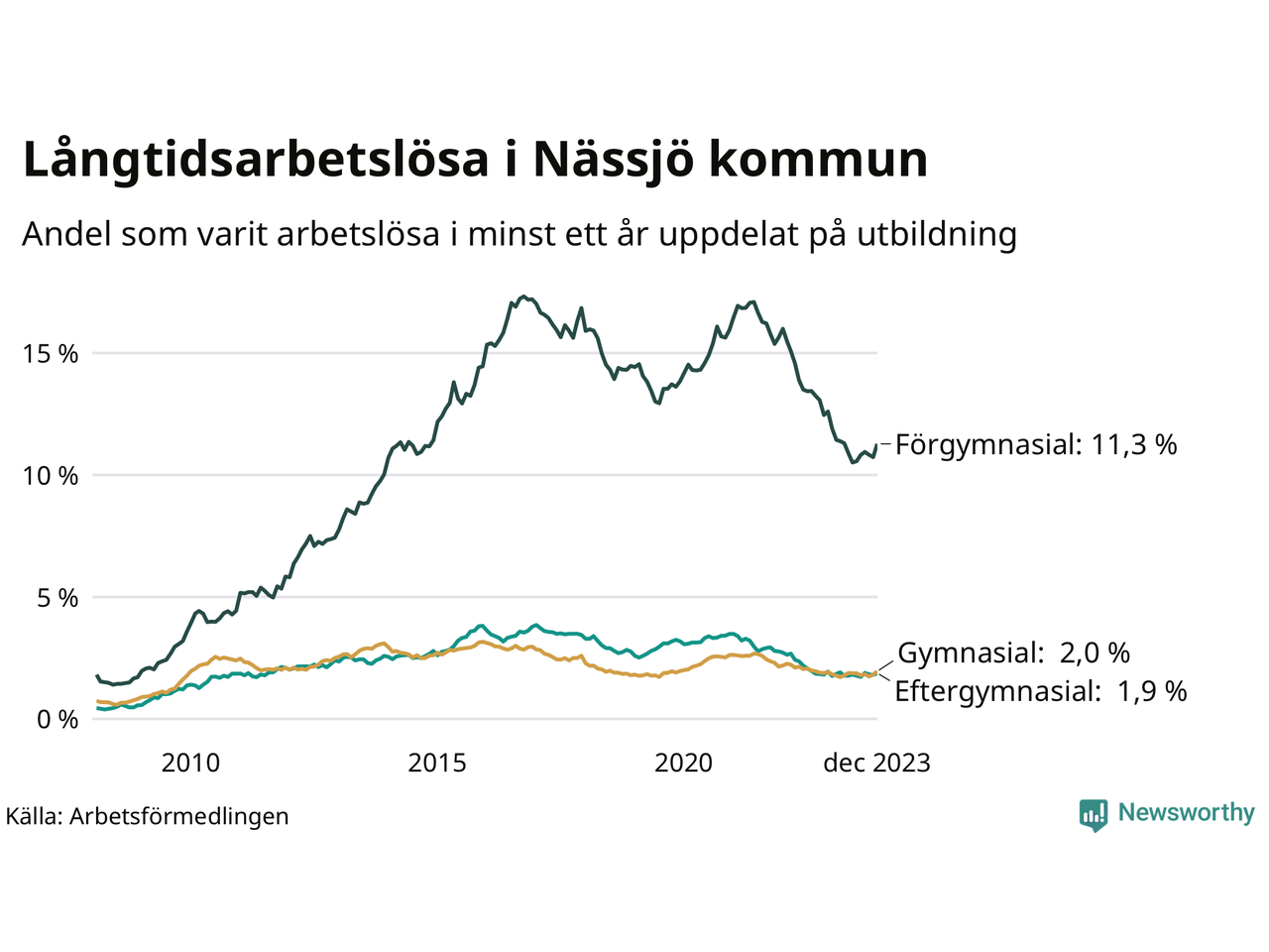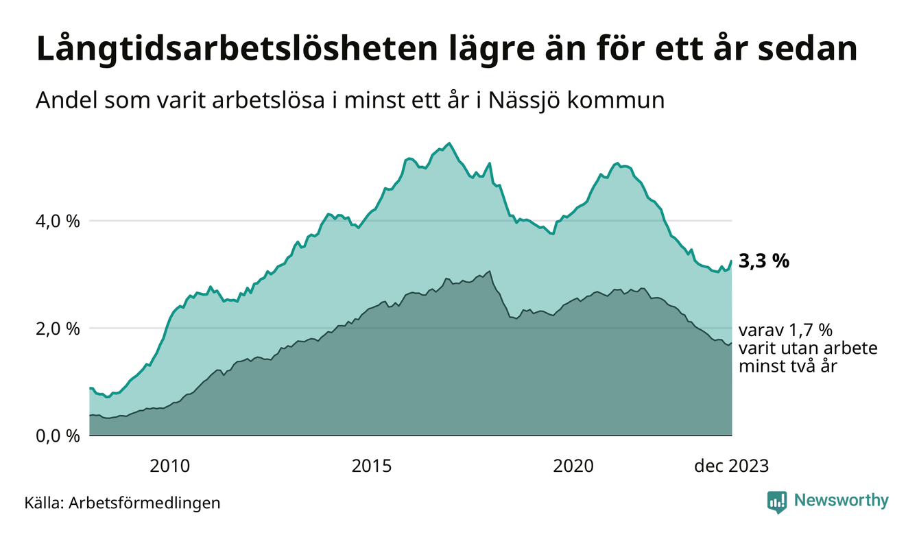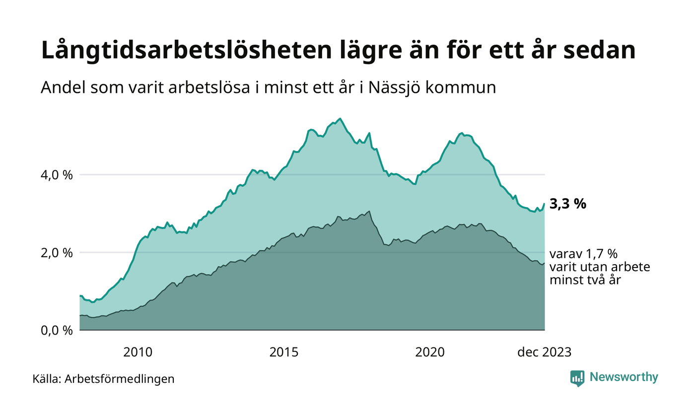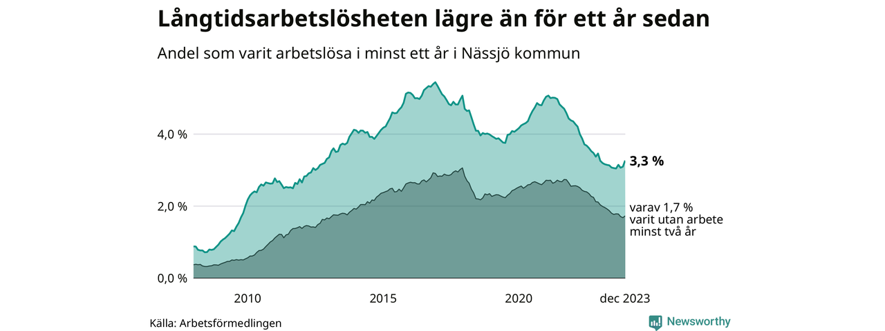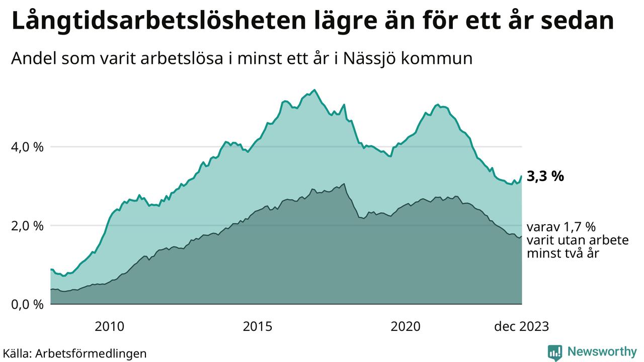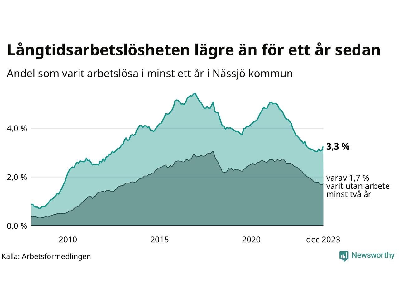 I december hade 514 Nässjöbor varit arbetslösa i minst ett år, vilket är 29 fler än månaden innan. 514 personer motsvarar 3,3 procent av arbetskraften i kommunen – andelen långtidsarbetslösa är 0,2 procentenheter lägre än samma månad för ett år sedan.