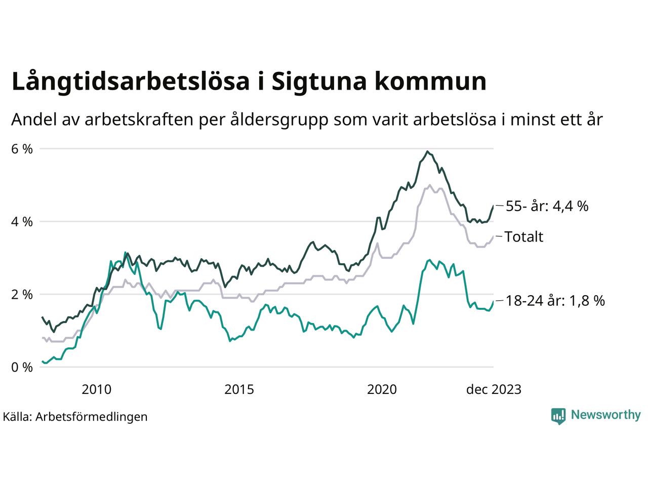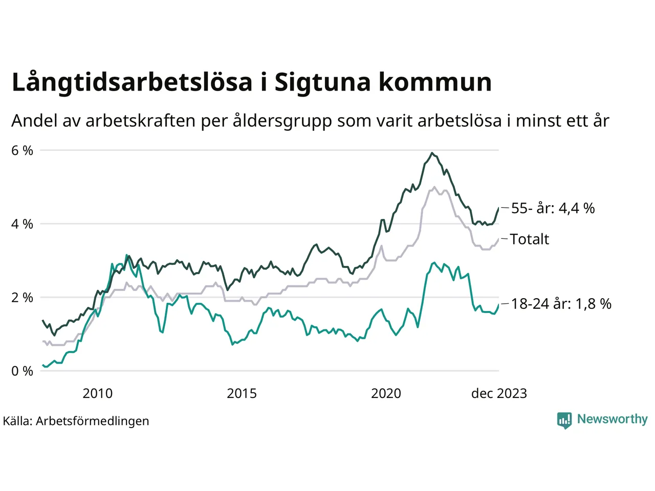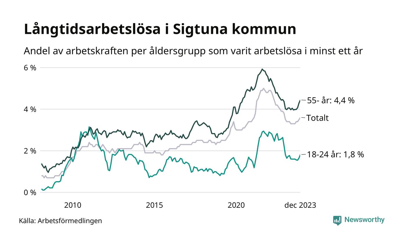 Av de 924 personerna som varit arbetslösa i mer än ett år i Sigtuna kommun är 216 personer mellan 55 och 651 år och 45 är mellan 18 och 24 år. För den äldre gruppen är andelen arbetslösa 4,4 procent medan den i den yngre gruppen är 1,8 procent. Även i riket som helhet är långtidsarbetslösheten högre i gruppen äldre.