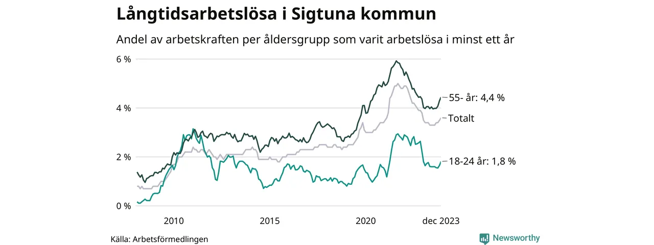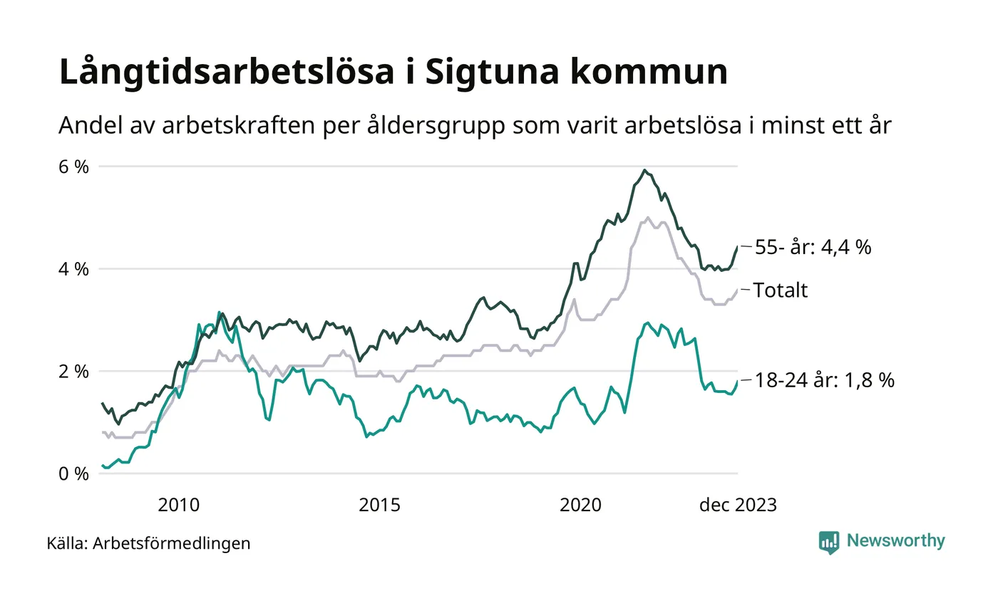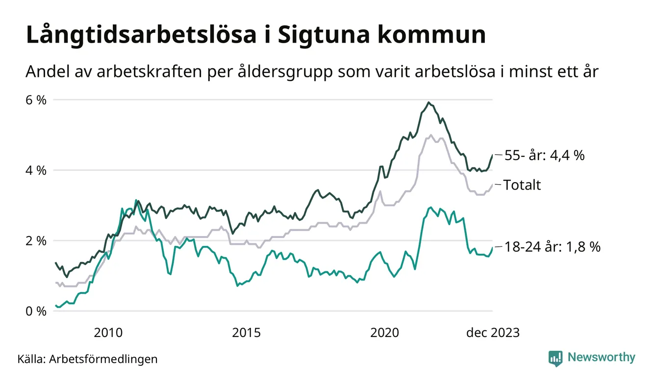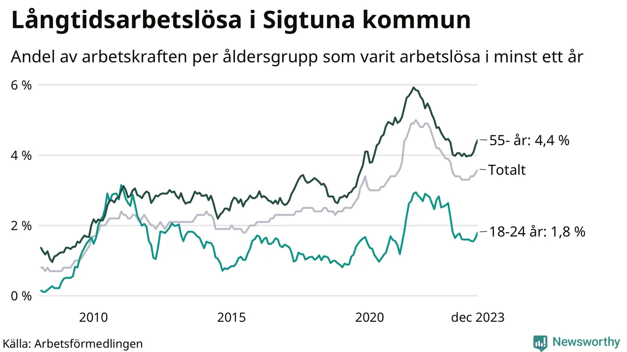 Av de 924 personerna som varit arbetslösa i mer än ett år i Sigtuna kommun är 216 personer mellan 55 och 651 år och 45 är mellan 18 och 24 år. För den äldre gruppen är andelen arbetslösa 4,4 procent medan den i den yngre gruppen är 1,8 procent. Även i riket som helhet är långtidsarbetslösheten högre i gruppen äldre.