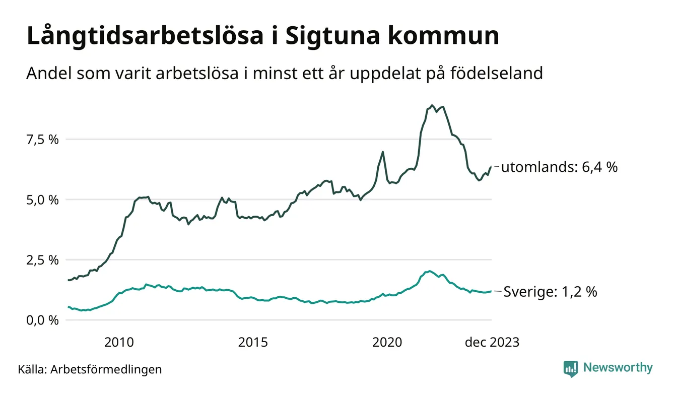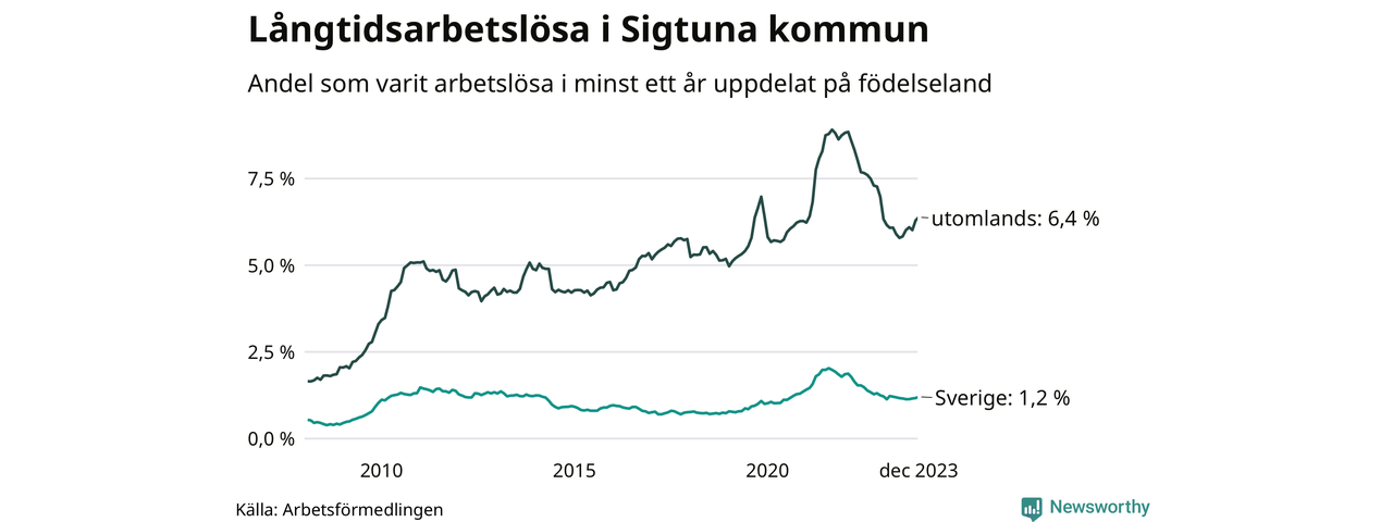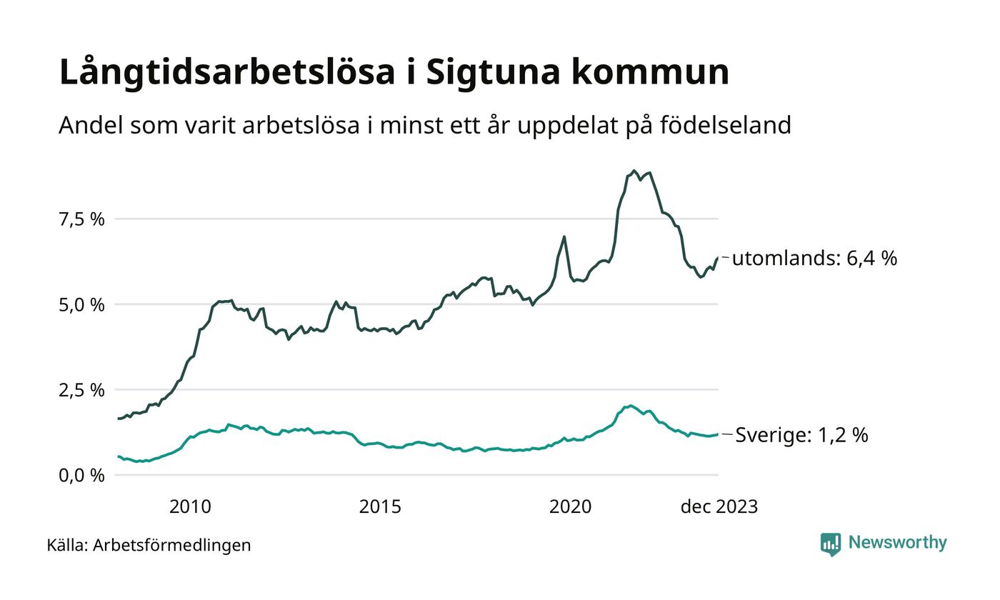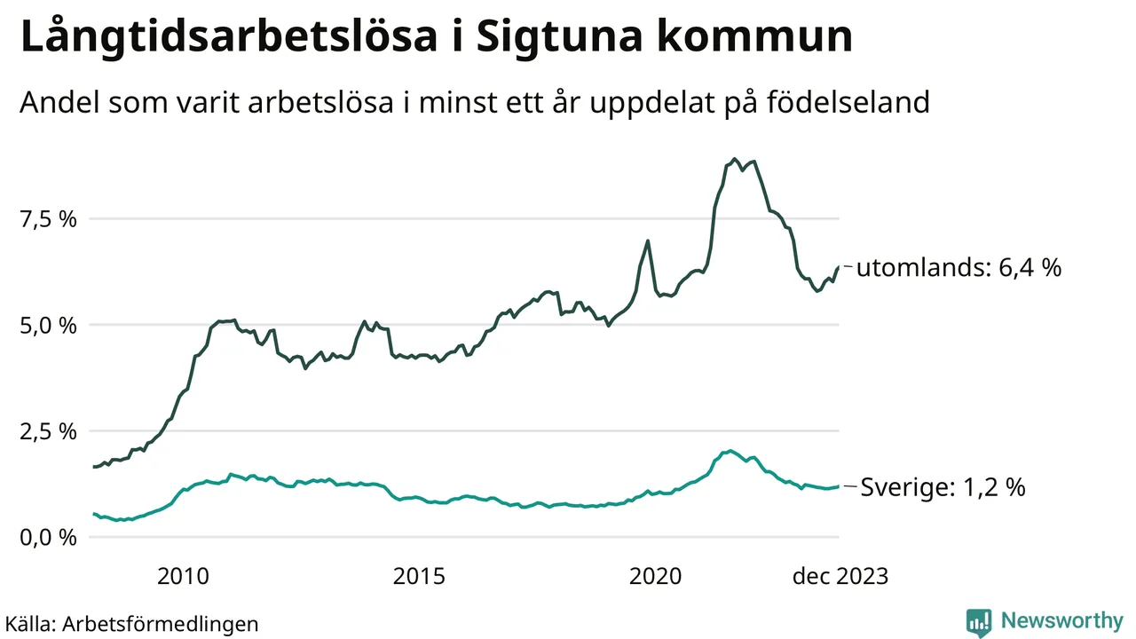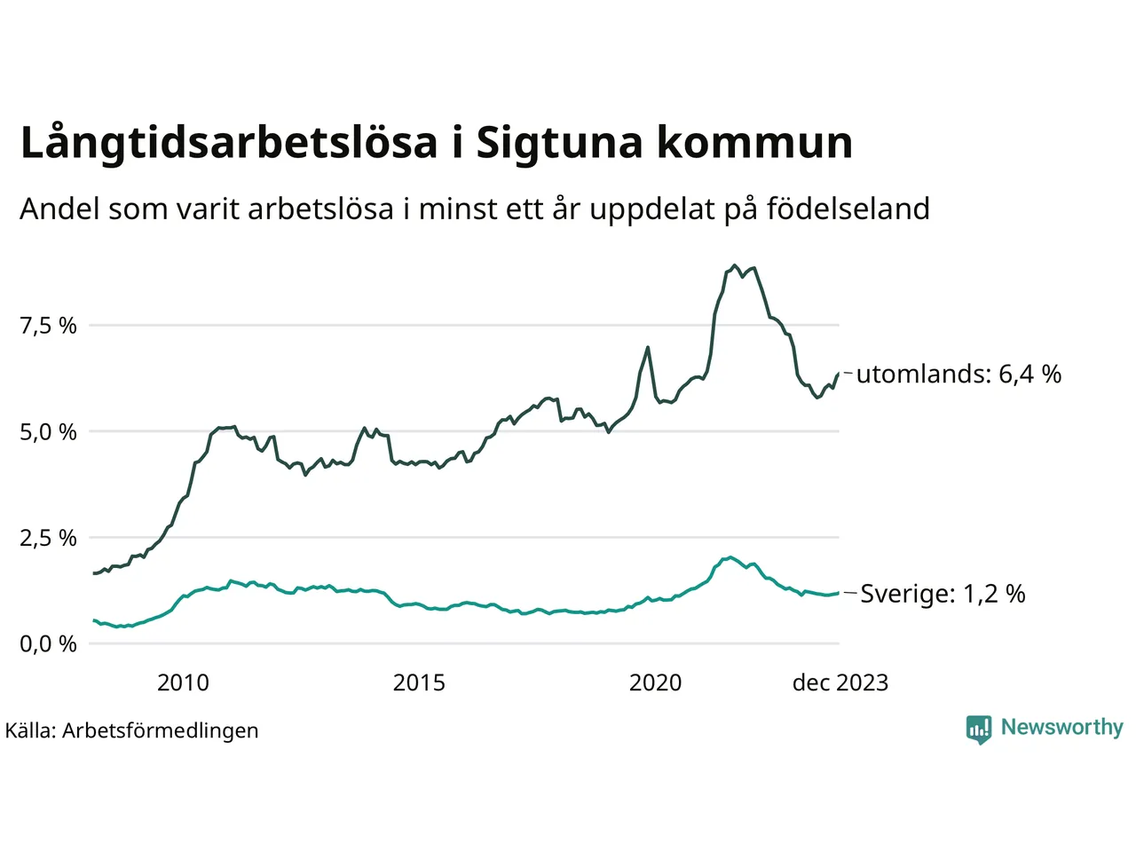 171 av de långtidsarbetslösa i Sigtuna är födda i Sverige, medan 753 är födda utomlands. Det innebär att långtidsarbetslösheten bland Sverigefödda är 1,2 procent, medan den är fem gånger så hög – 6,4 procent – bland födda utomlands. Även i riket som helhet är arbetslösheten högre bland utrikesfödda.