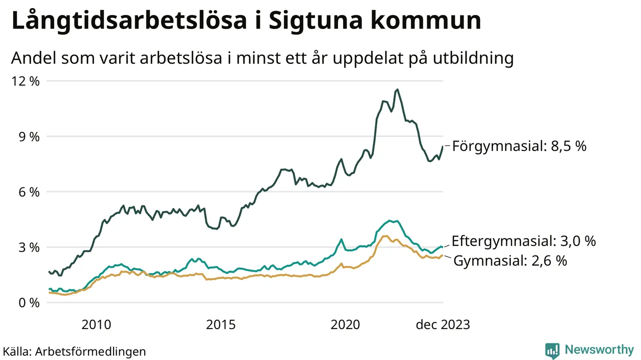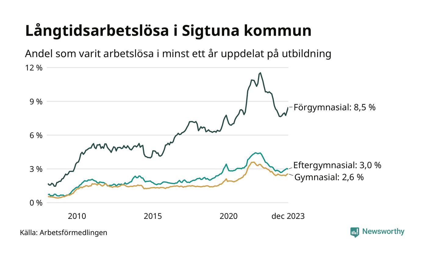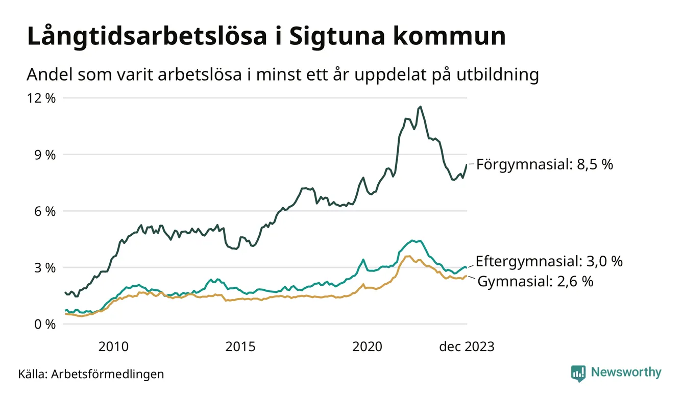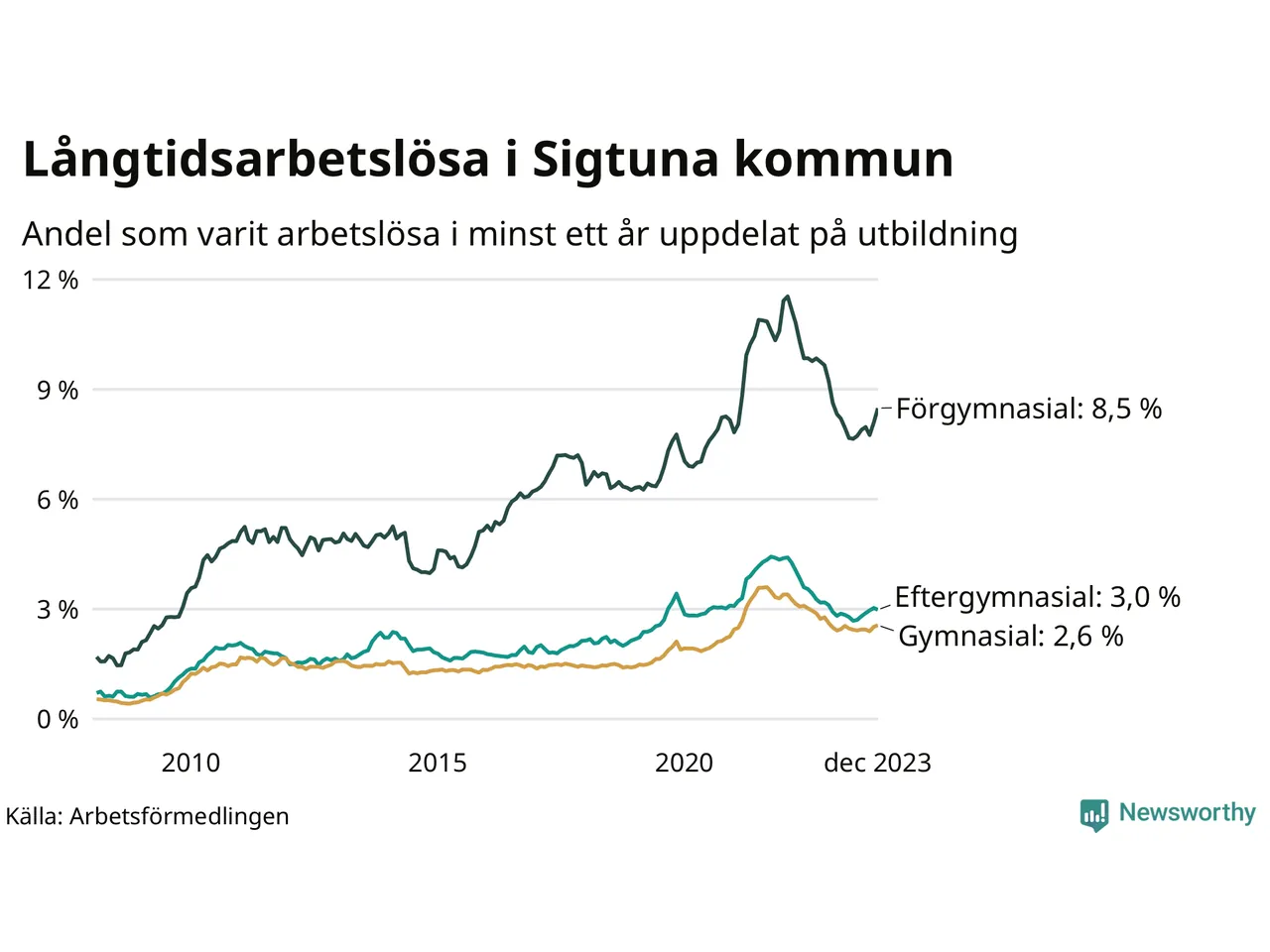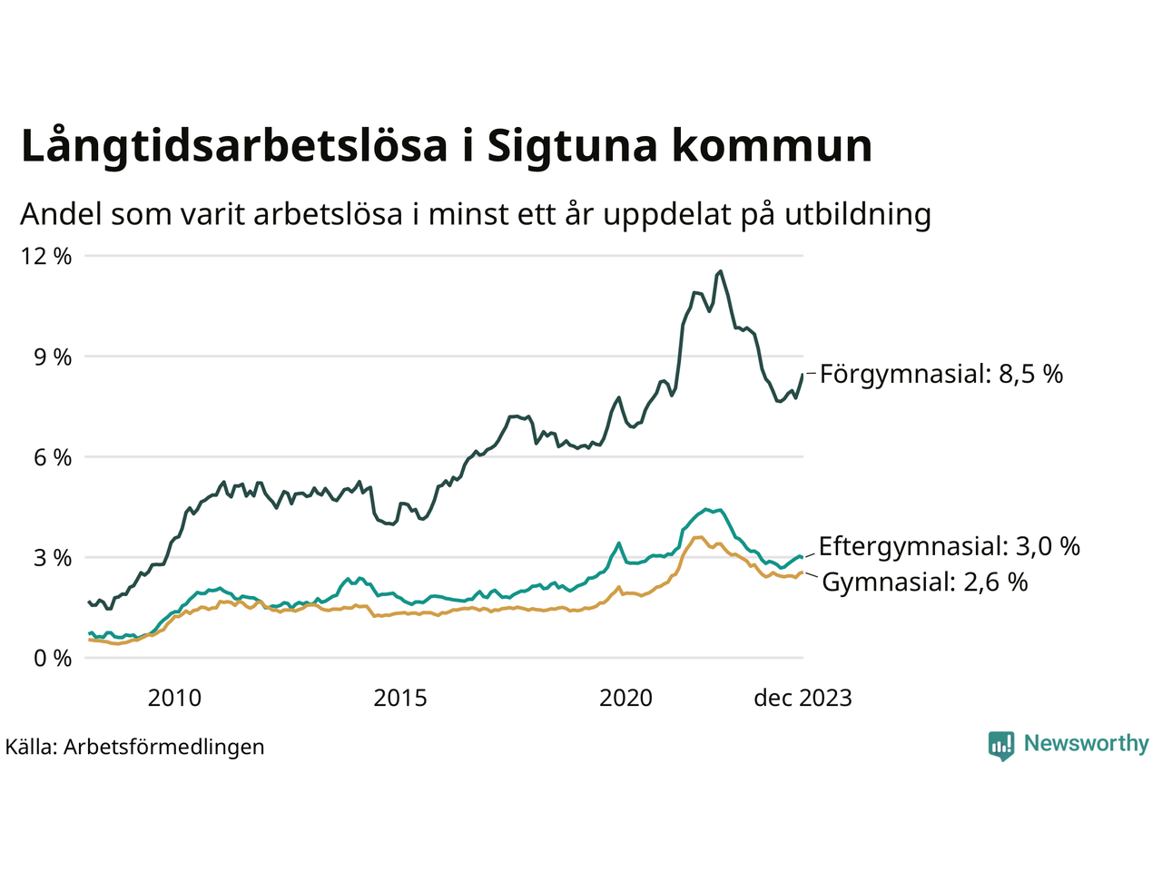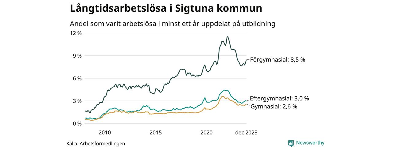 Graf: Andel arbetslösa i Sigtuna som varit utan arbete i minst 12 månader