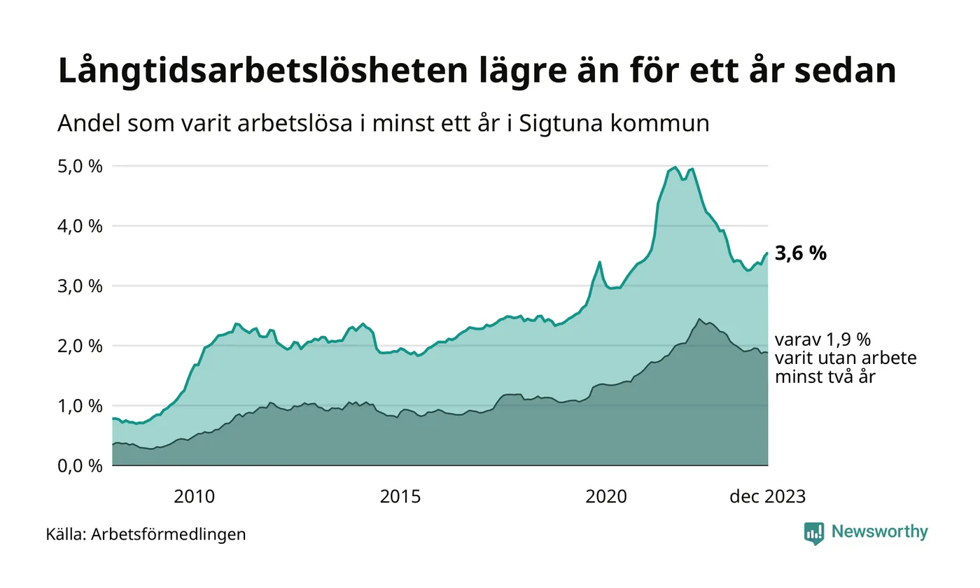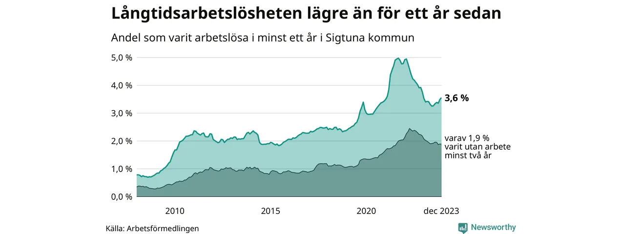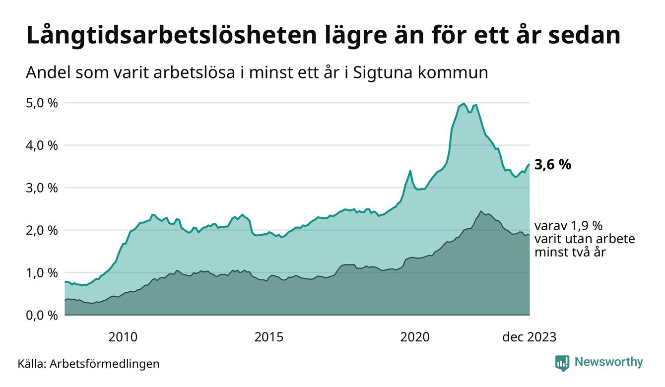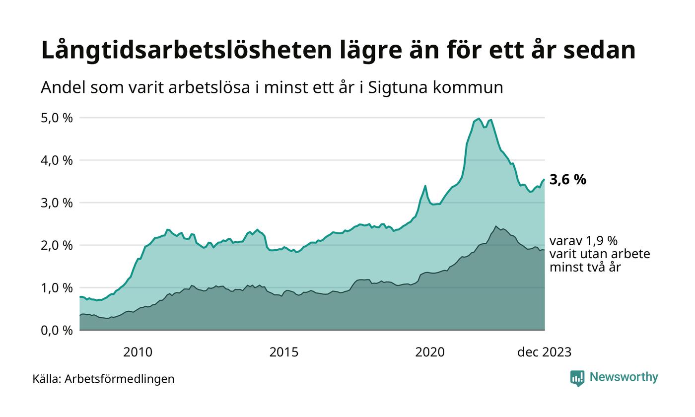 I december hade 924 Sigtunabor varit arbetslösa i minst ett år, vilket är 18 fler än månaden innan. 924 personer motsvarar 3,6 procent av arbetskraften i kommunen – andelen långtidsarbetslösa är 0,2 procentenheter lägre än samma månad för ett år sedan.