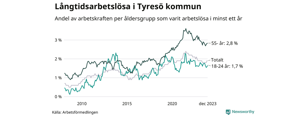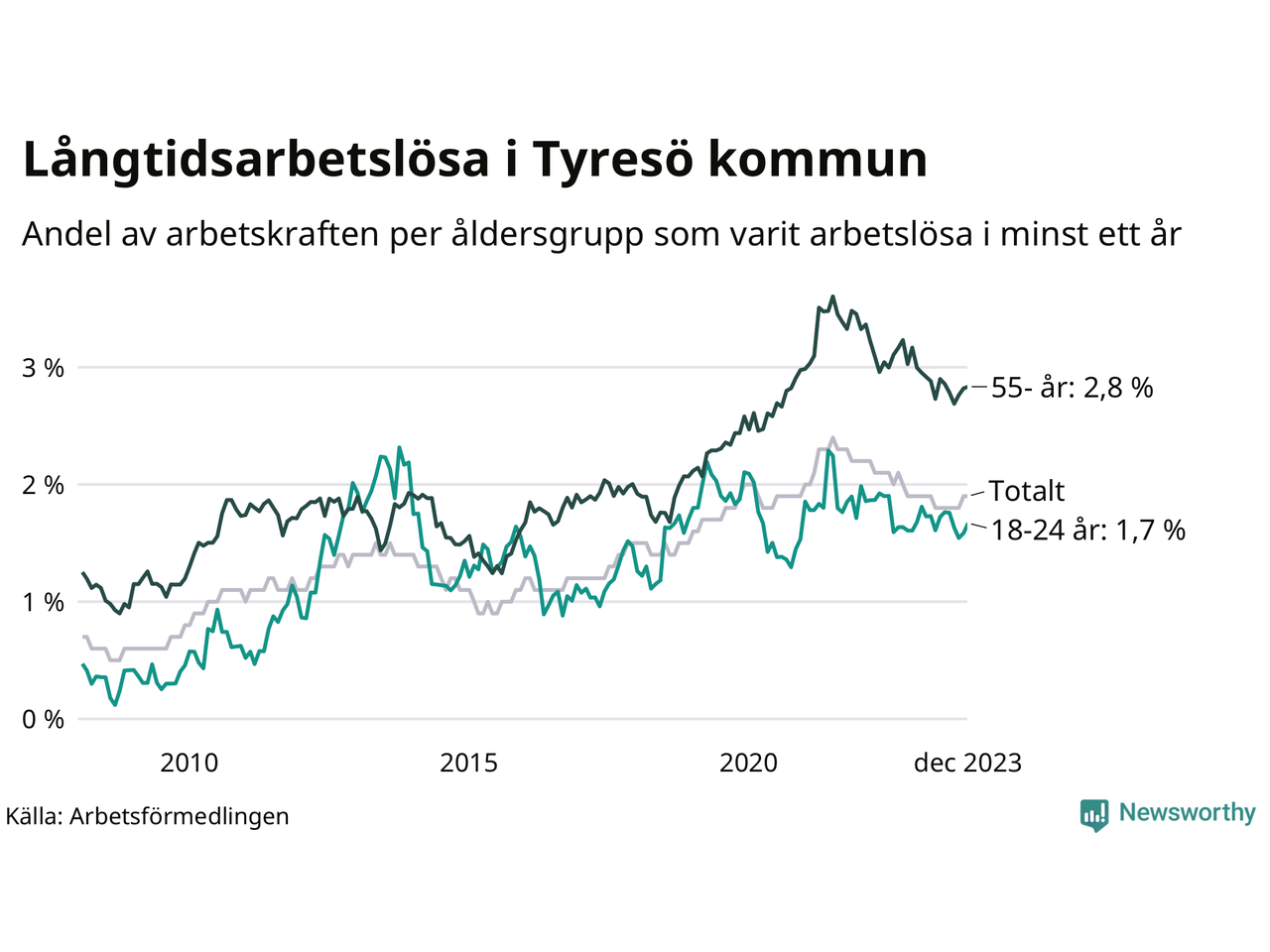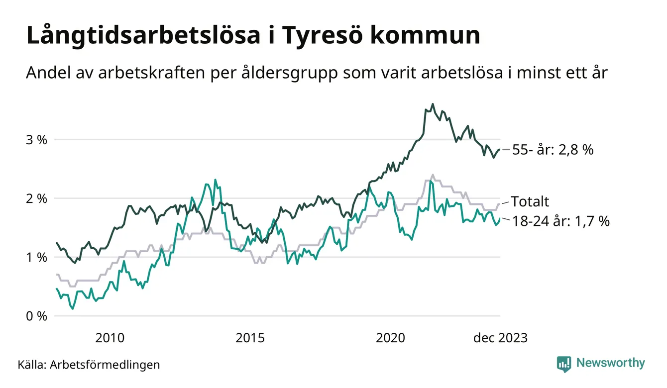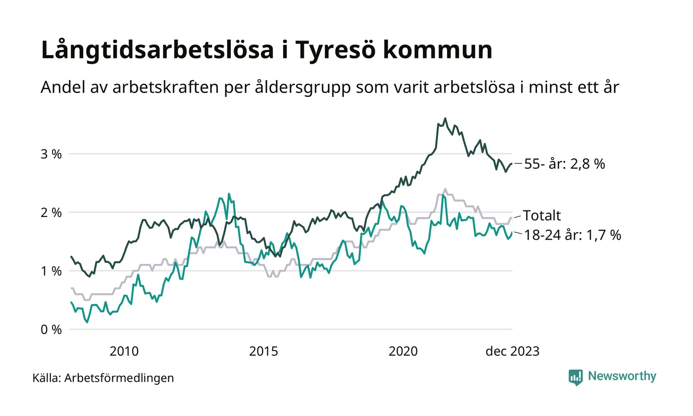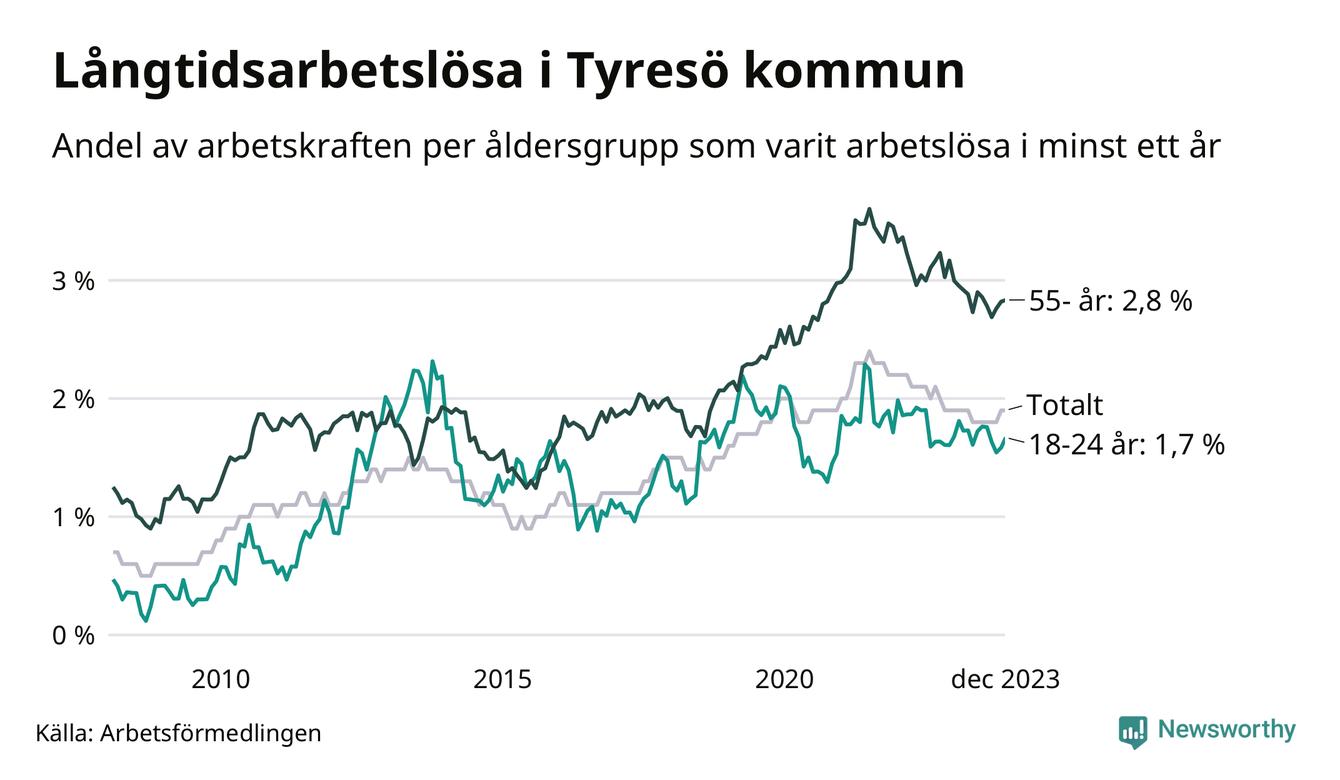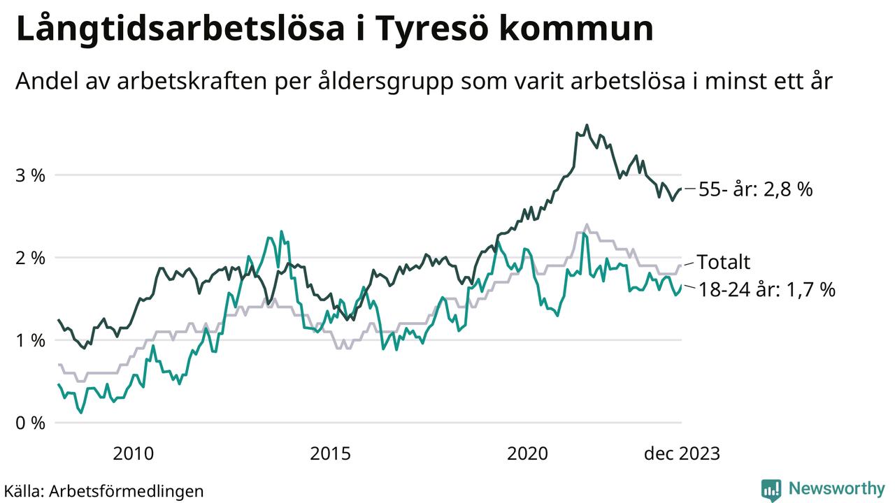 Av de 482 personerna som varit arbetslösa i mer än ett år i Tyresö kommun är 149 personer mellan 55 och 651 år och 39 är mellan 18 och 24 år. För den äldre gruppen är andelen arbetslösa 2,8 procent medan den i den yngre gruppen är 1,7 procent. Även i riket som helhet är långtidsarbetslösheten högre i gruppen äldre.