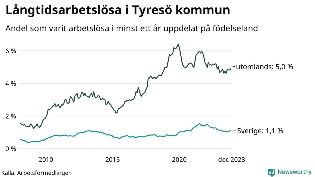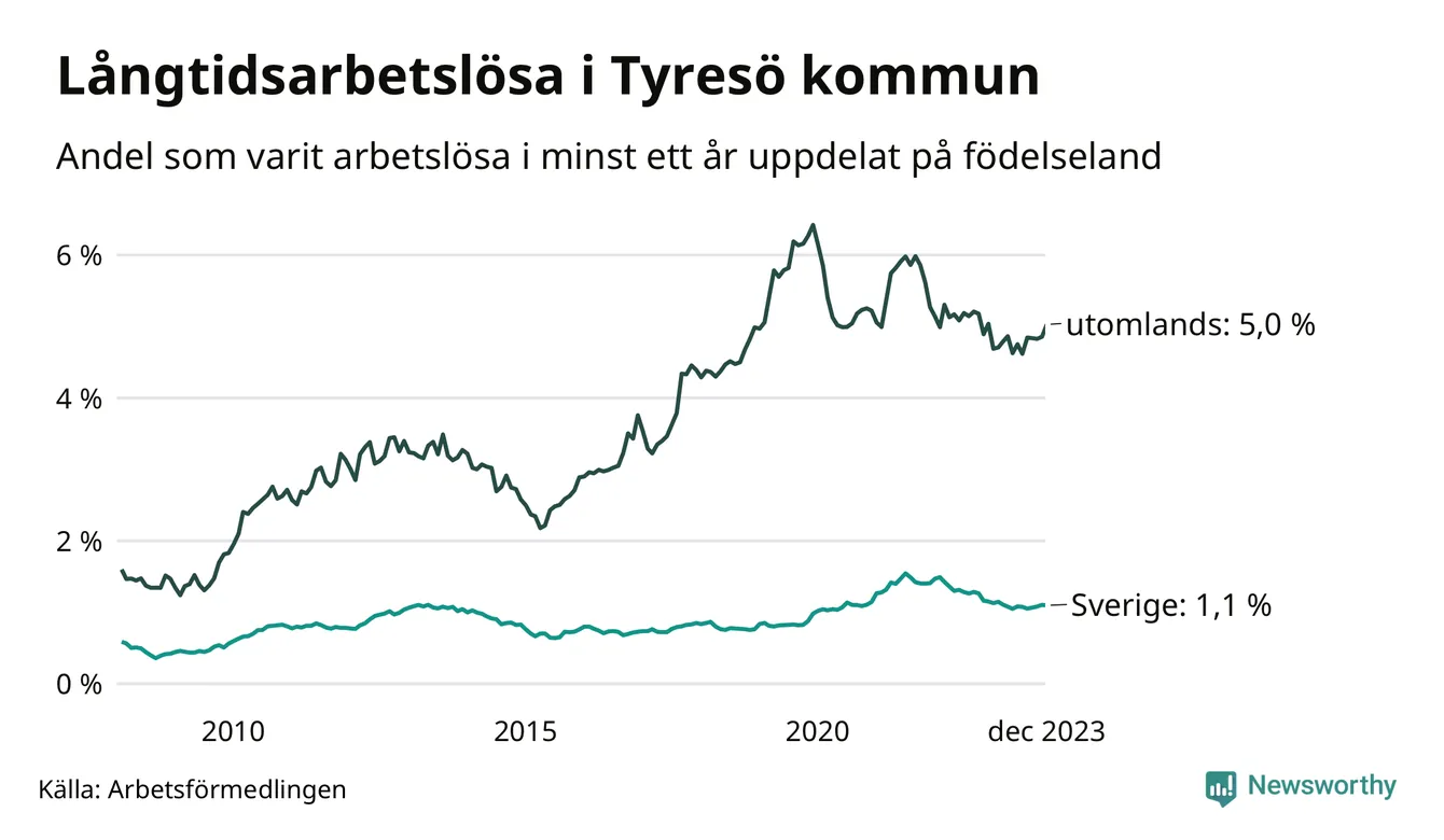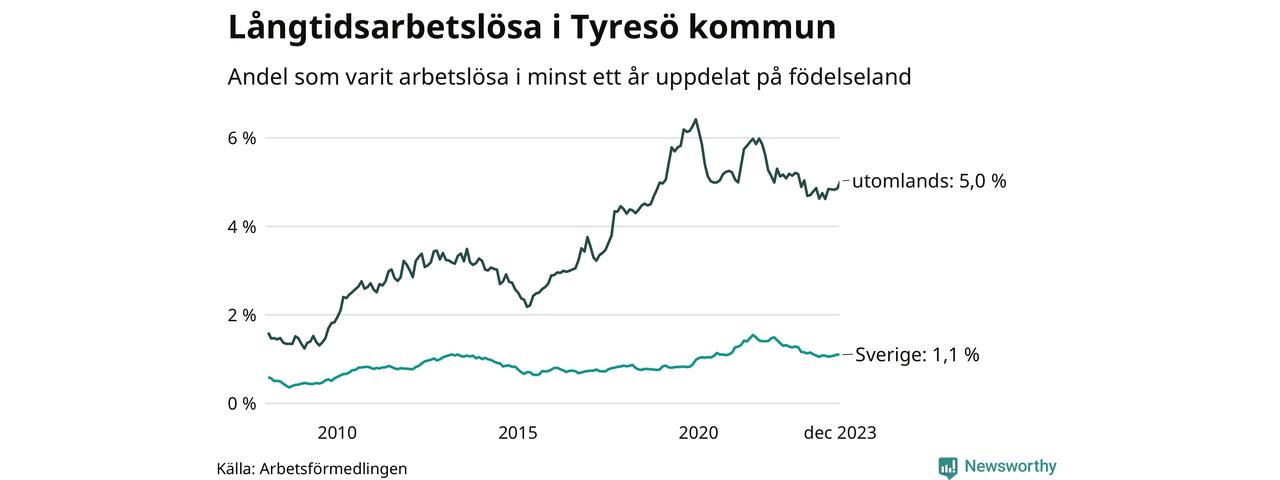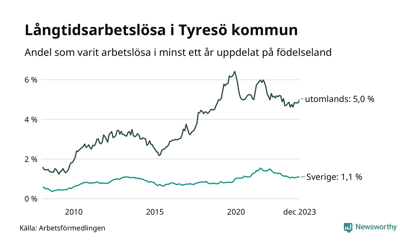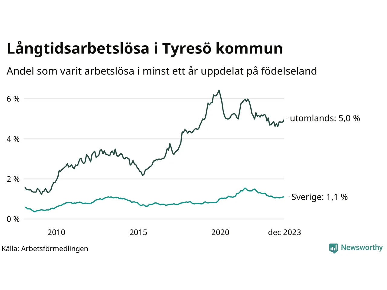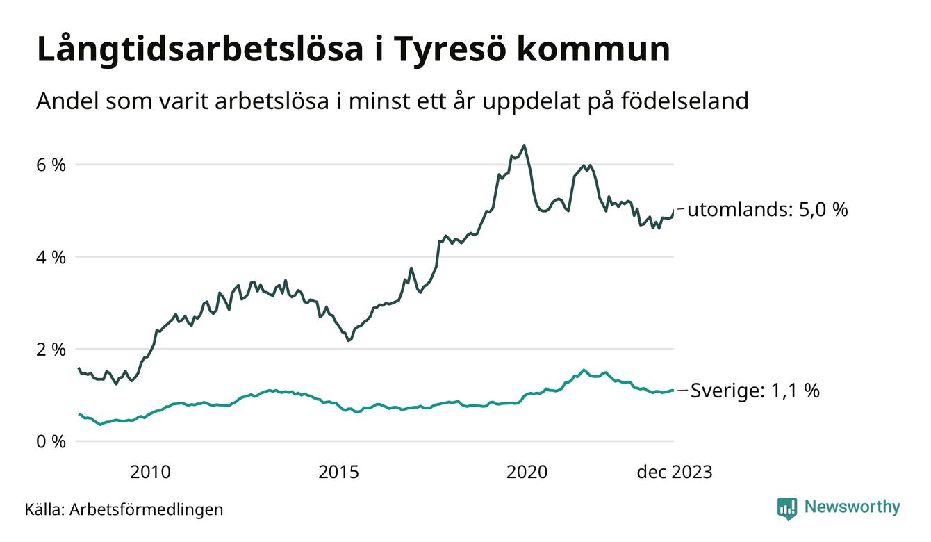 221 av de långtidsarbetslösa i Tyresö är födda i Sverige, medan 261 är födda utomlands. Det innebär att långtidsarbetslösheten bland Sverigefödda är 1,1 procent, medan den är fem gånger så hög – 5,0 procent – bland födda utomlands. Även i riket som helhet är arbetslösheten högre bland utrikesfödda.