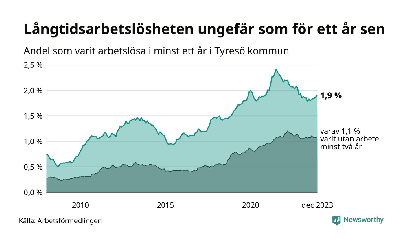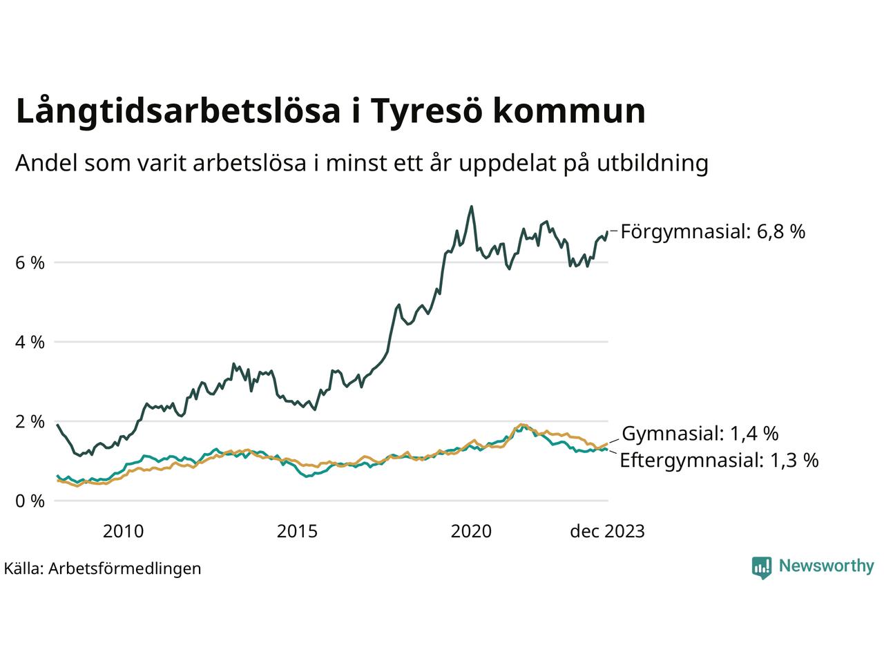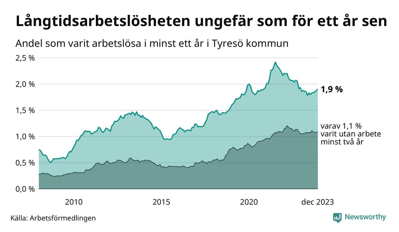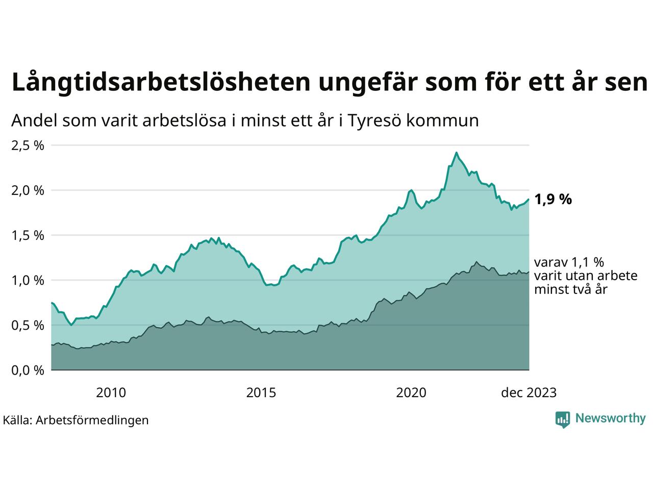 I december hade 482 Tyresöbor varit arbetslösa i minst ett år, vilket är åtta fler än månaden innan. Det är den femte månaden i rad med ökande antal långtidsarbetslösa. 482 personer motsvarar 1,9 procent av arbetskraften i kommunen – andelen långtidsarbetslösa är ungefär på samma nivå som för ett år sedan.