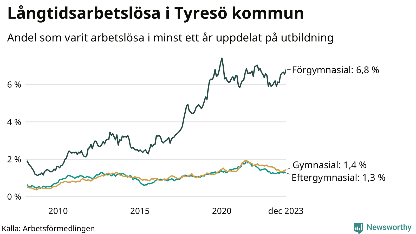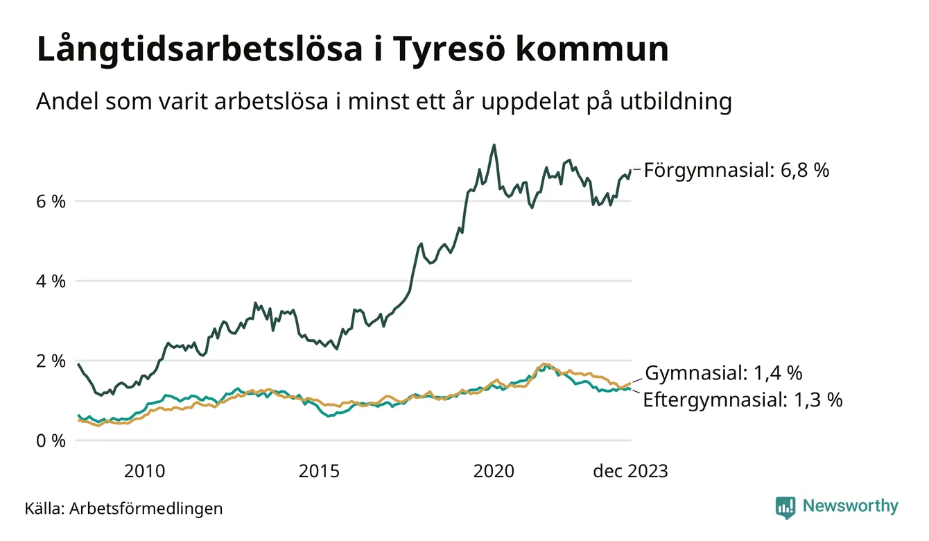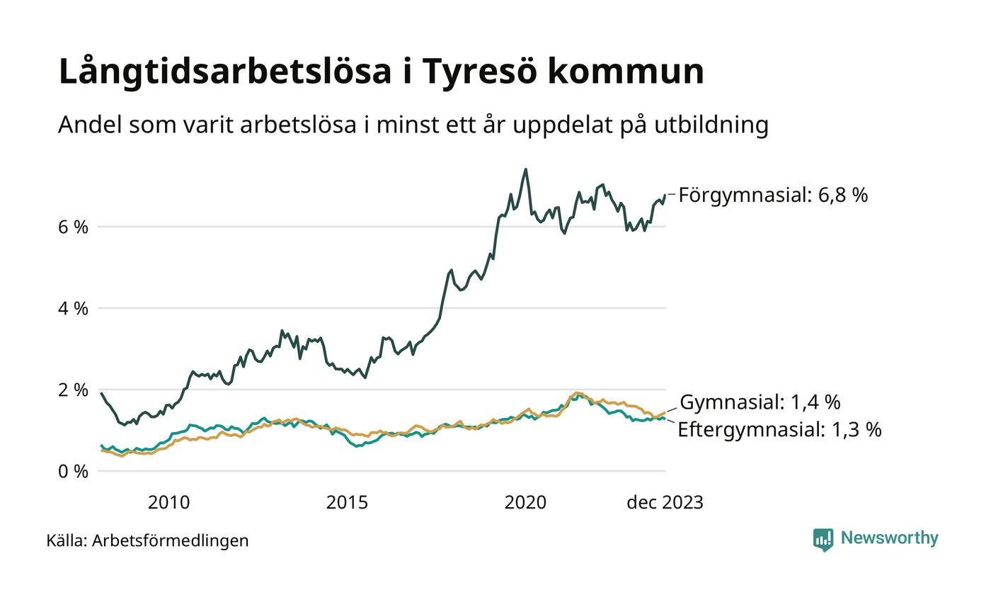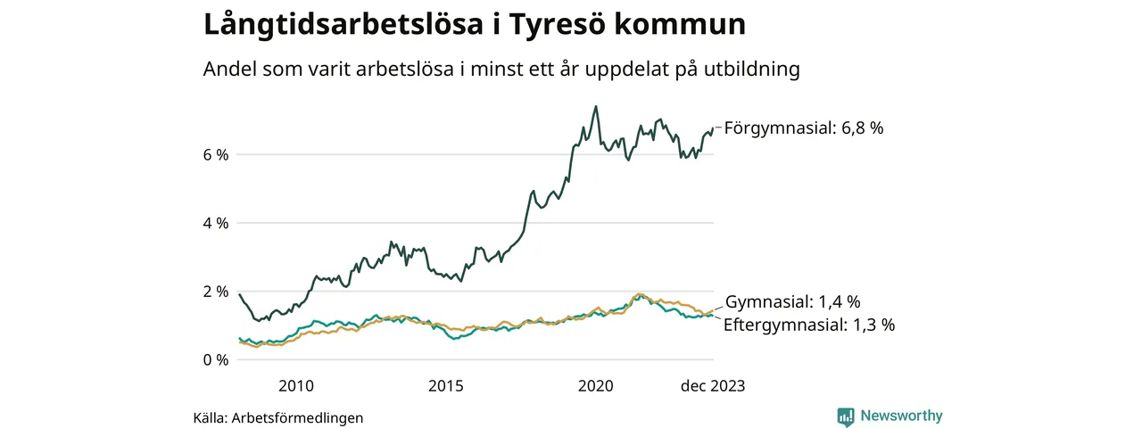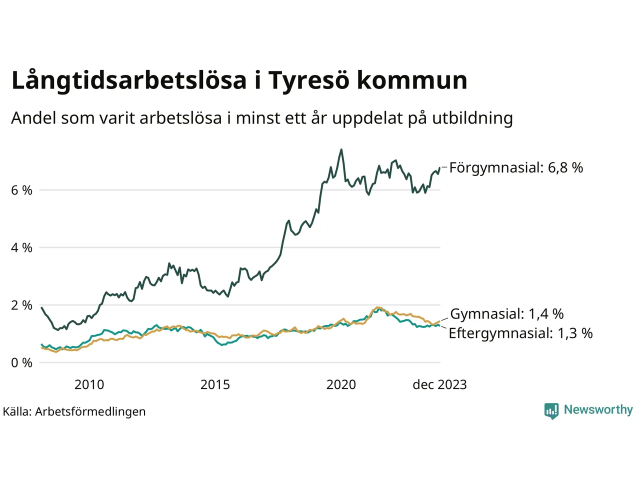 I december hade 482 Tyresöbor varit arbetslösa i minst ett år, vilket är åtta fler än månaden innan. Det är den femte månaden i rad med ökande antal långtidsarbetslösa. 482 personer motsvarar 1,9 procent av arbetskraften i kommunen – andelen långtidsarbetslösa är ungefär på samma nivå som för ett år sedan.