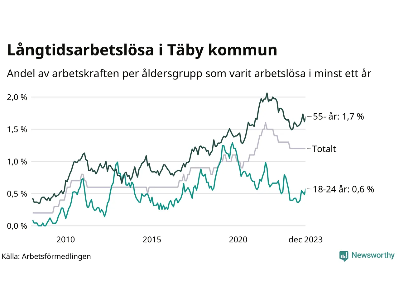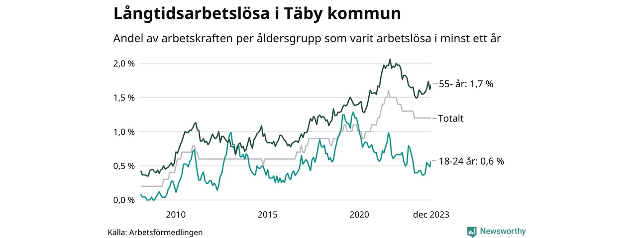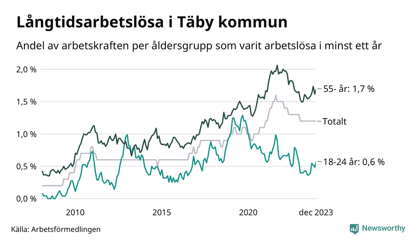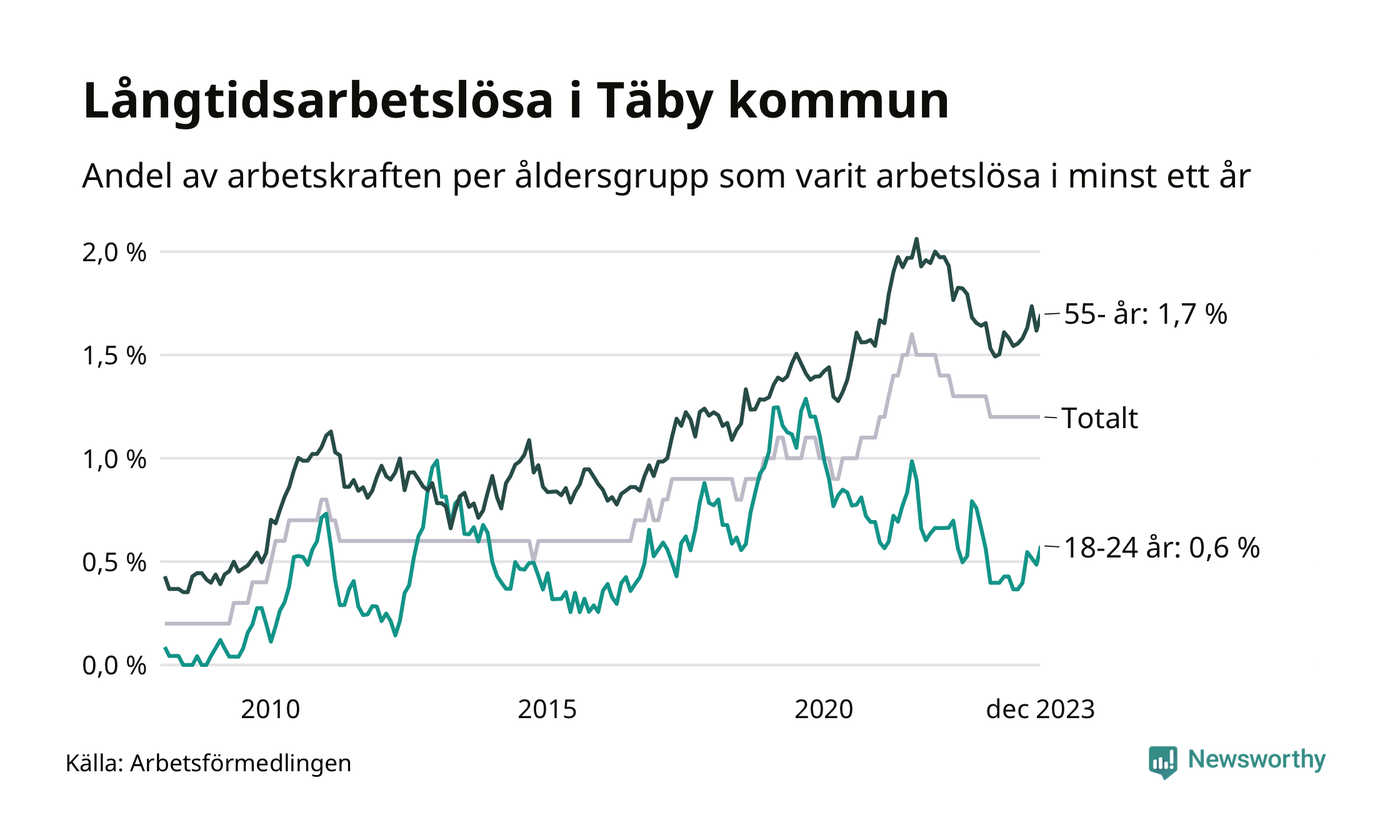 Av de 439 personerna som varit arbetslösa i mer än ett år i Täby kommun är 129 personer mellan 55 och 651 år och 19 är mellan 18 och 24 år. För den äldre gruppen är andelen arbetslösa 1,7 procent medan den i den yngre gruppen är 0,6 procent. Även i riket som helhet är långtidsarbetslösheten högre i gruppen äldre.