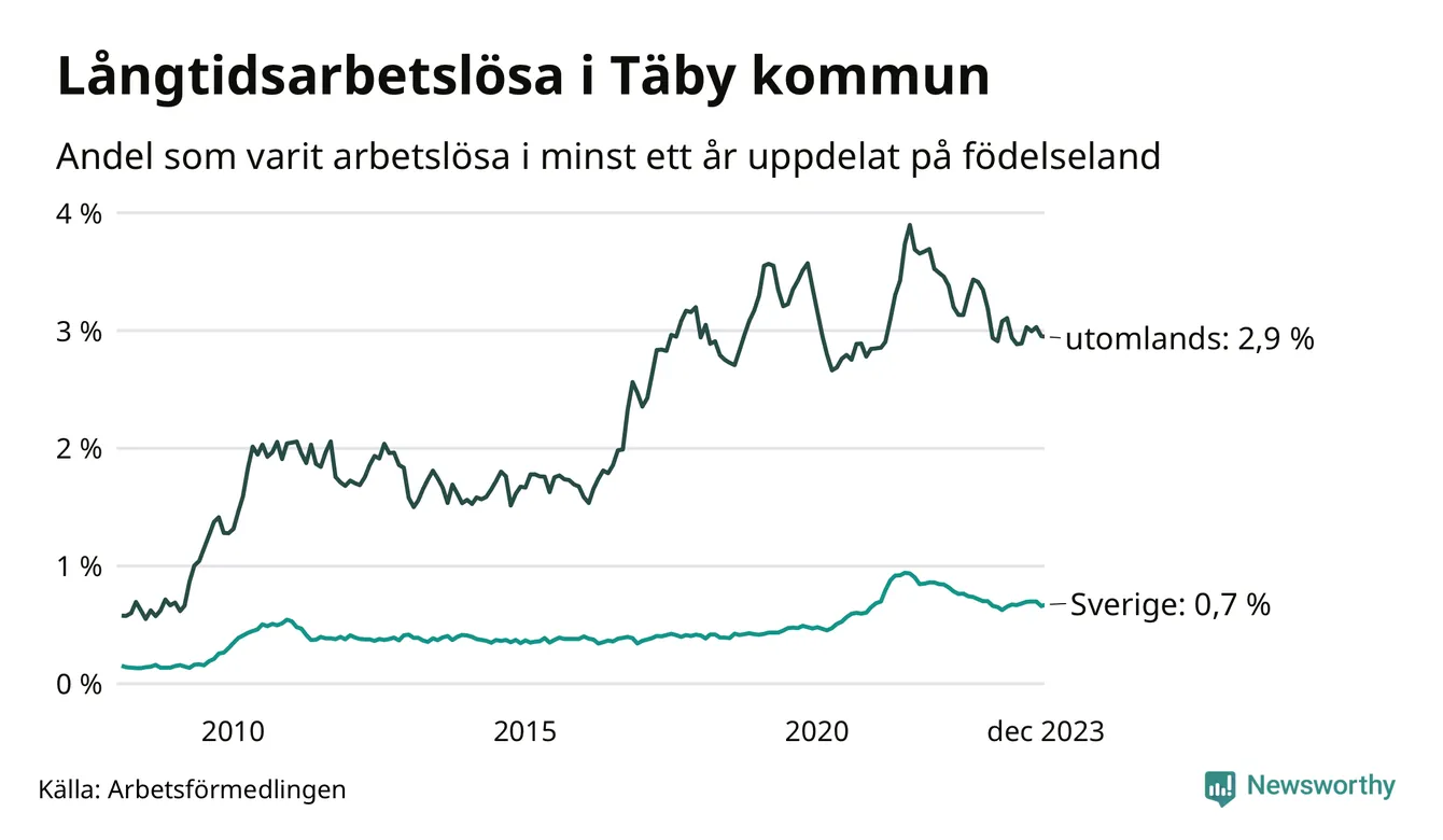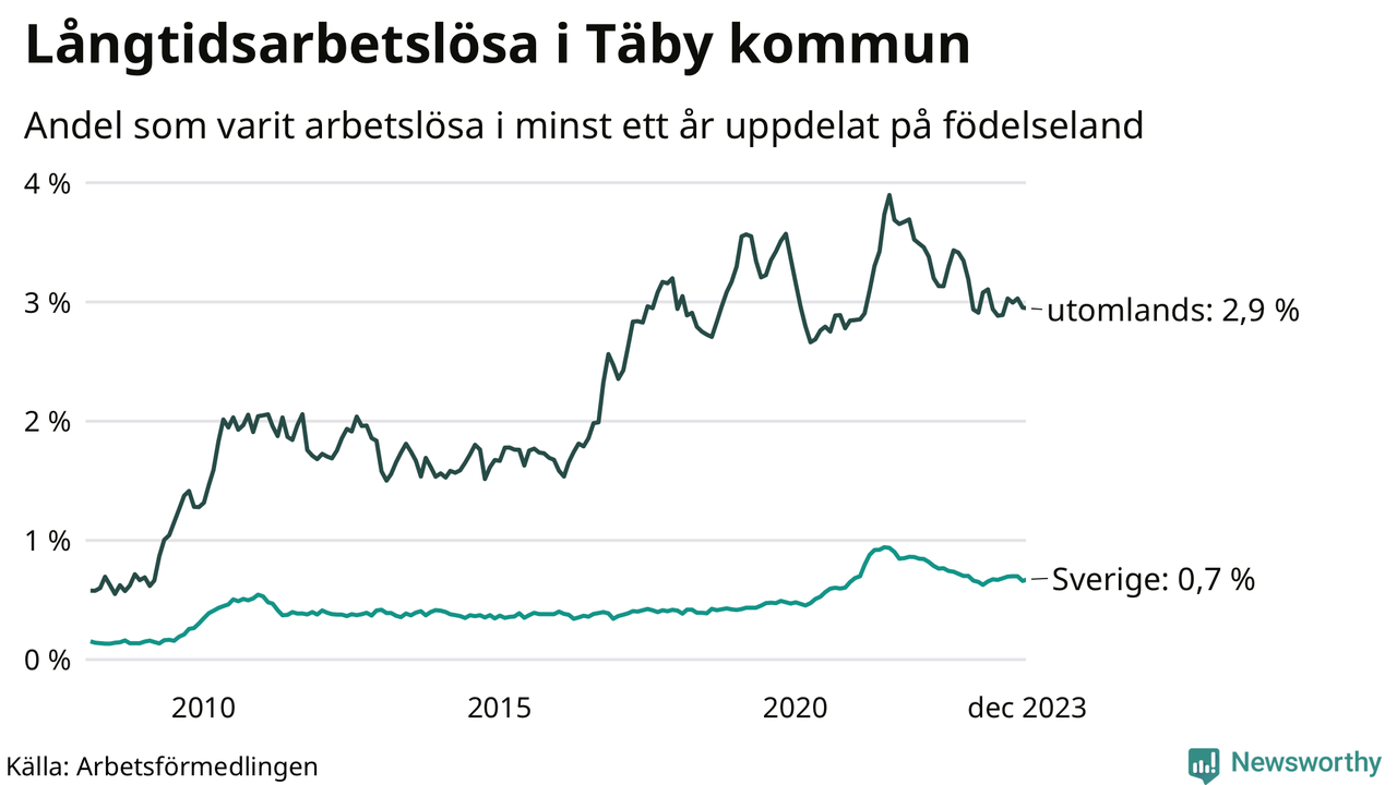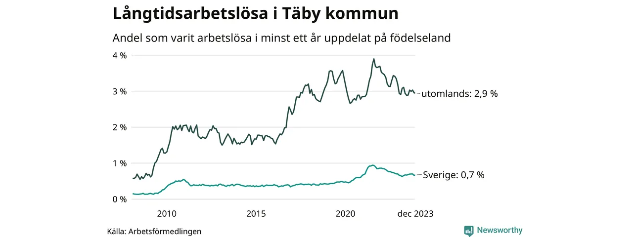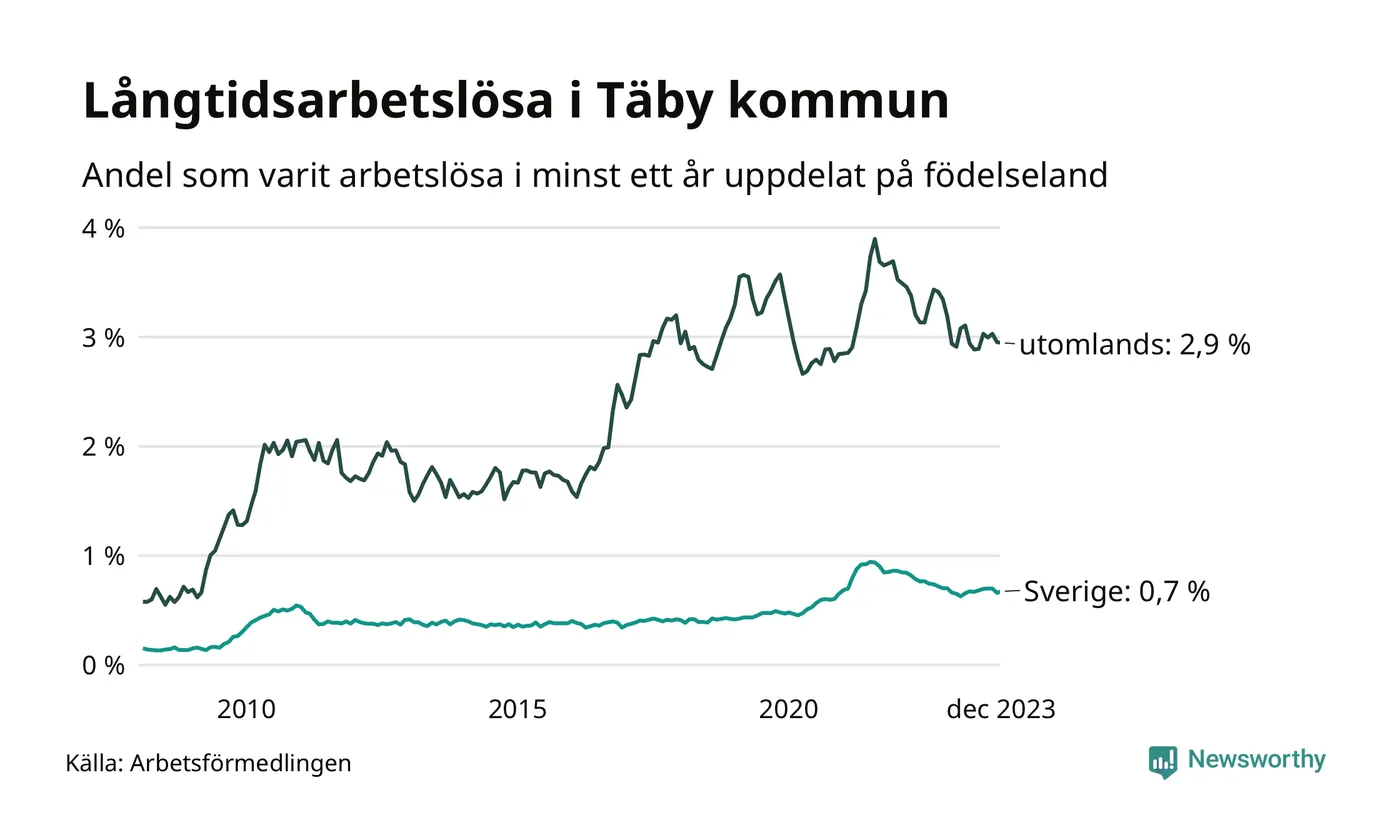 191 av de långtidsarbetslösa i Täby är födda i Sverige, medan 248 är födda utomlands. Det innebär att långtidsarbetslösheten bland Sverigefödda är 0,7 procent, medan den är fyra gånger så hög – 2,9 procent – bland födda utomlands. Även i riket som helhet är arbetslösheten högre bland utrikesfödda.