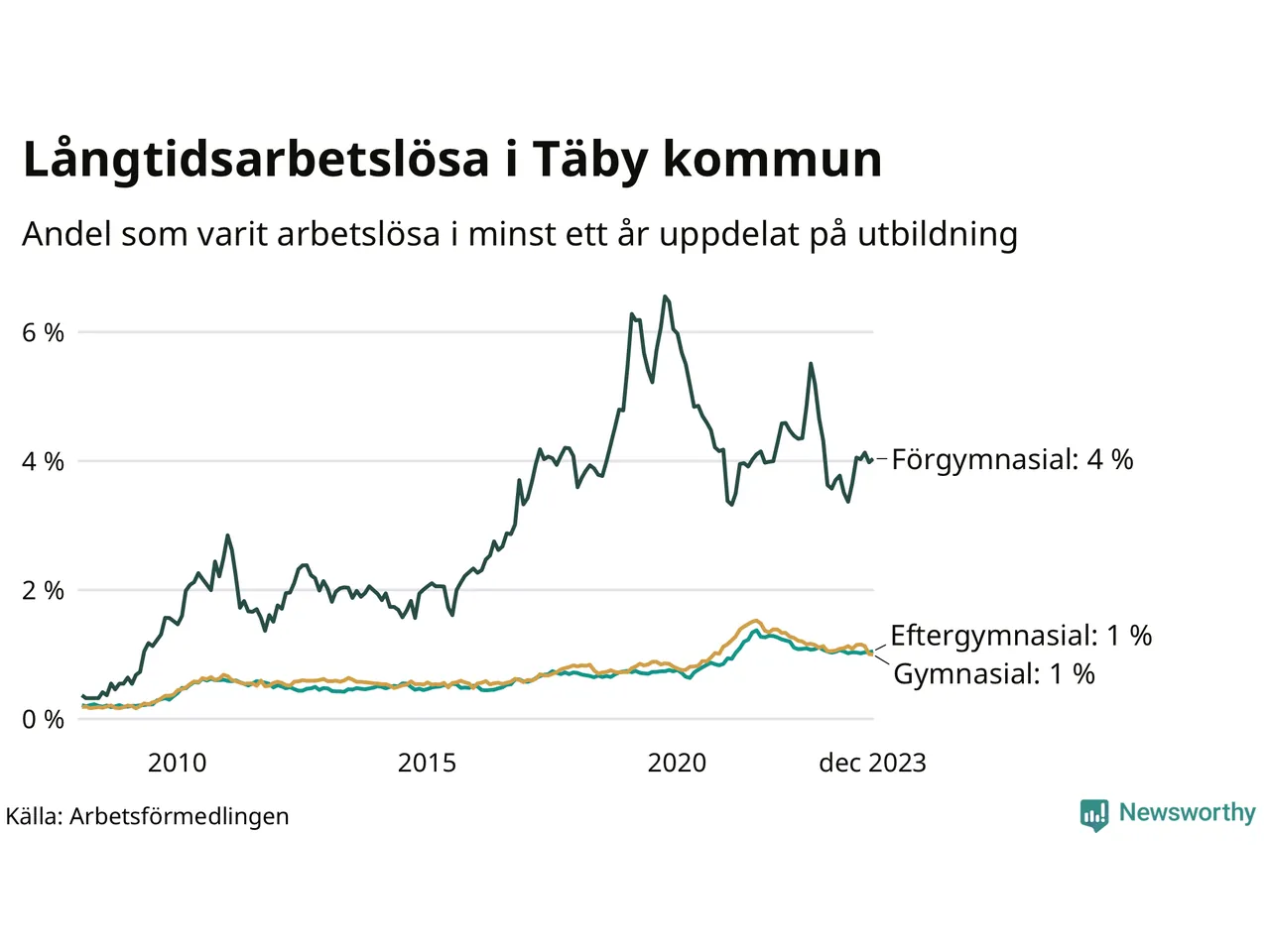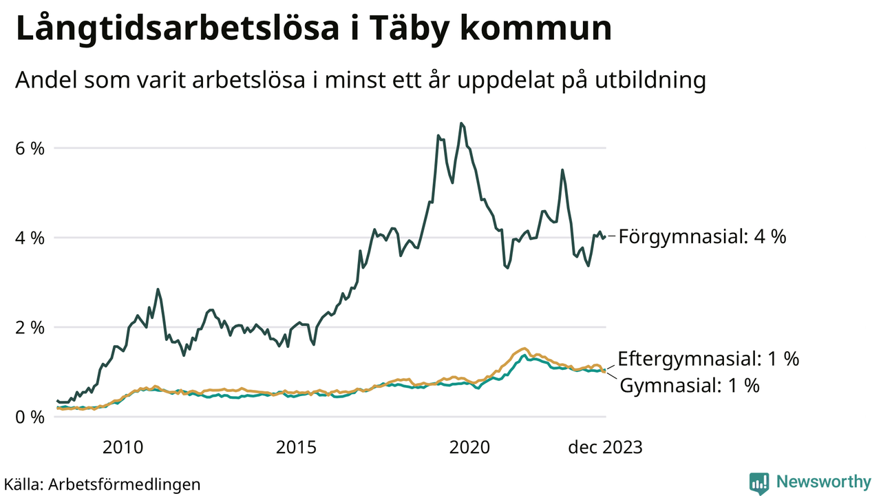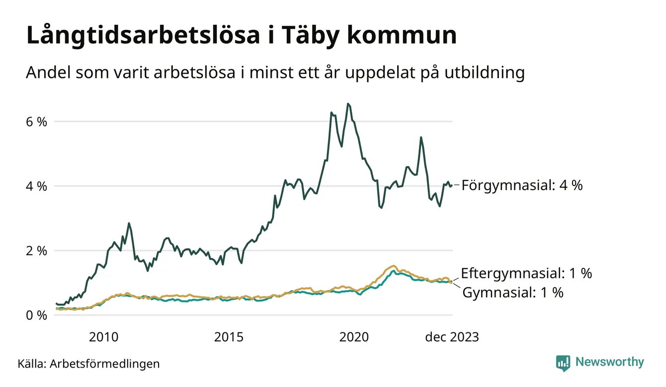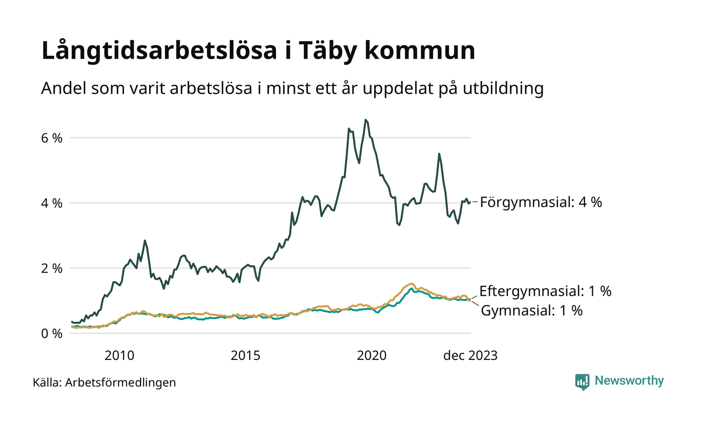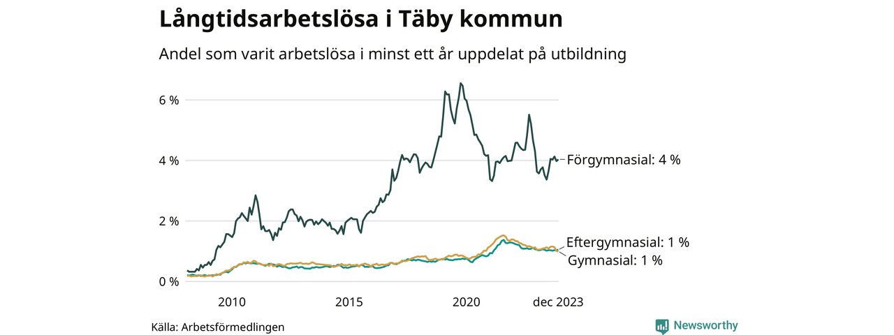 Graf över andel långtidsarbetslösa i Täby uppdelat på utbildningsnivå