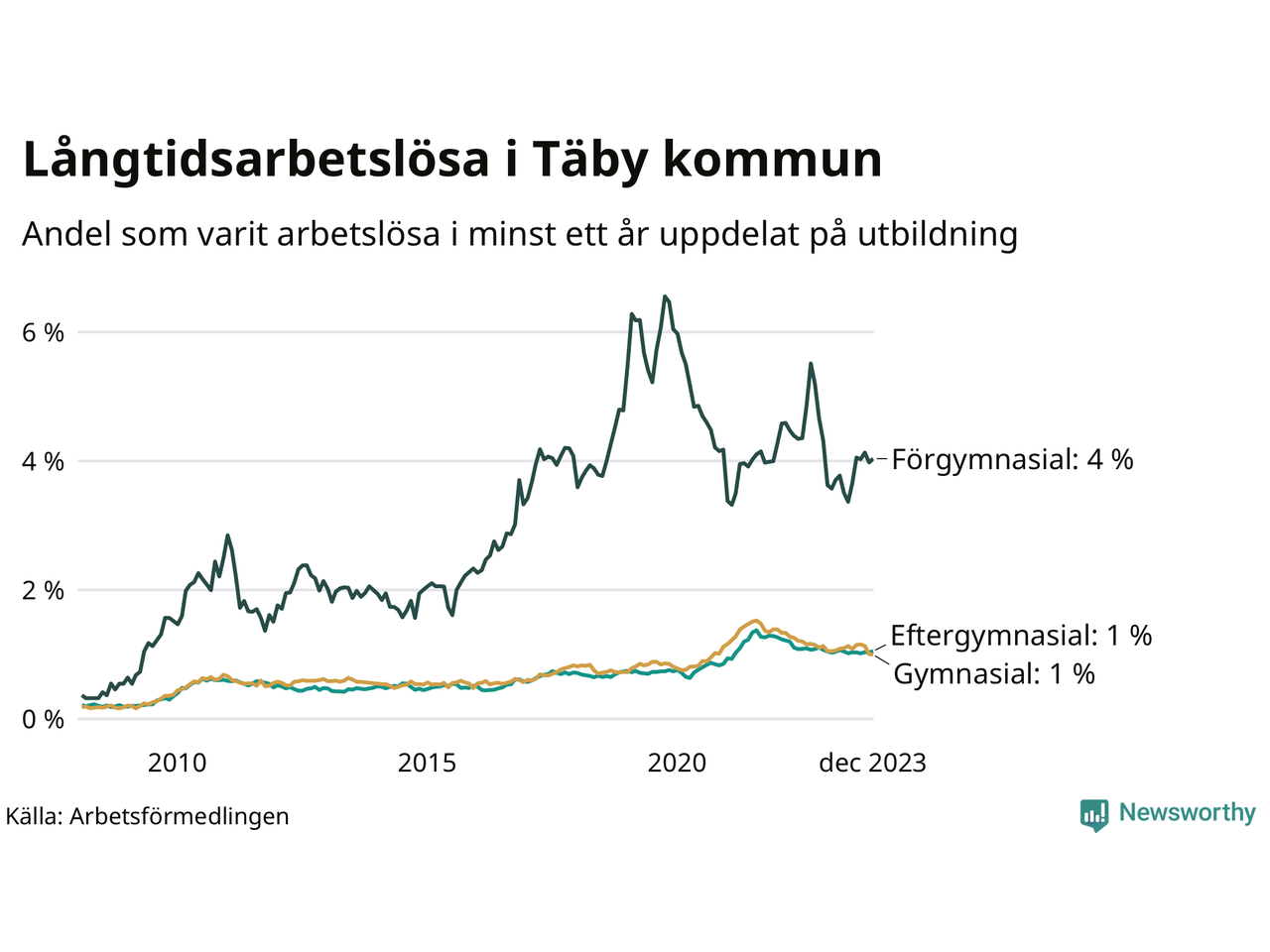 Graf: Andel arbetslösa i Täby som varit utan arbete i minst 12 månader