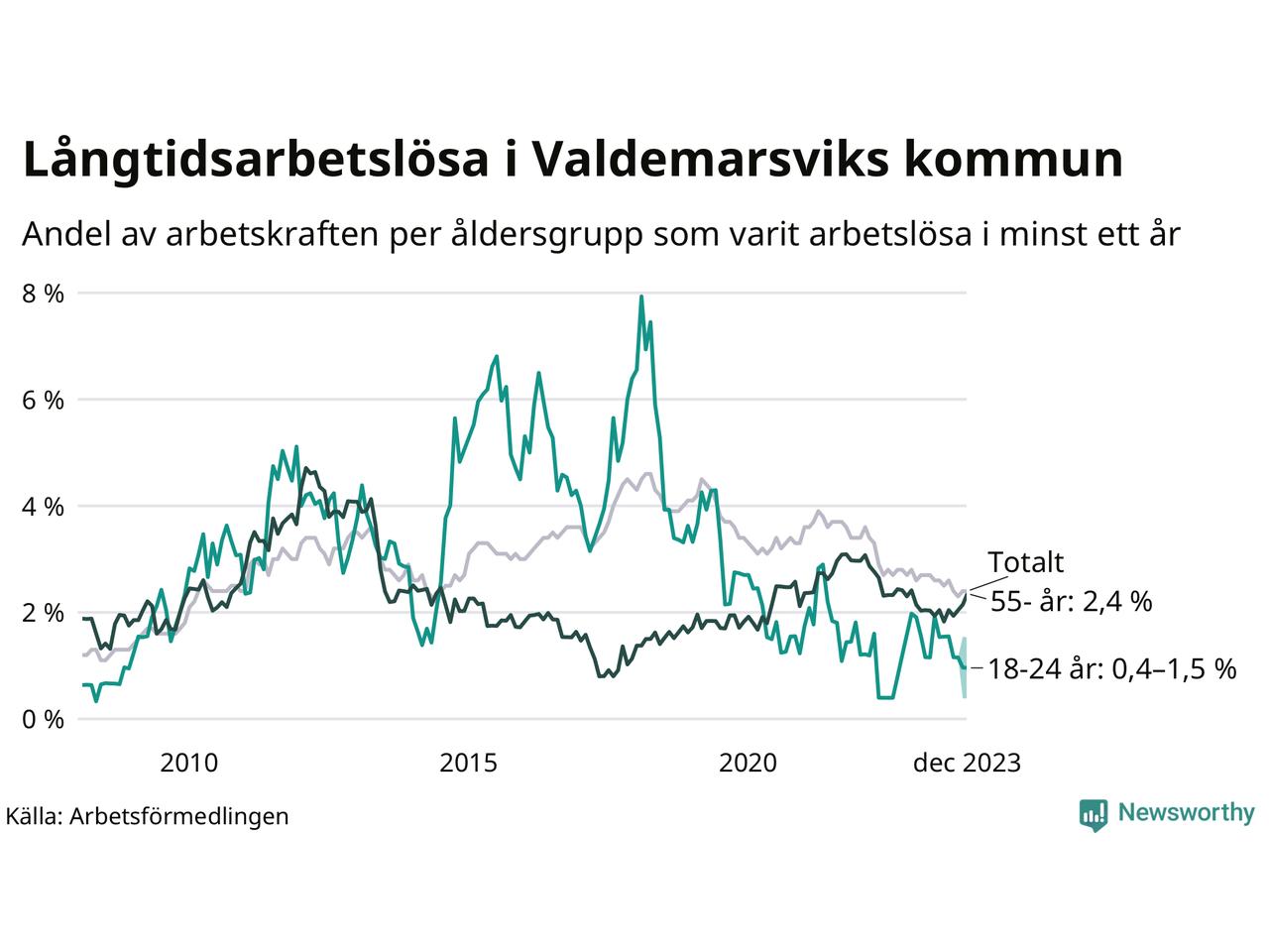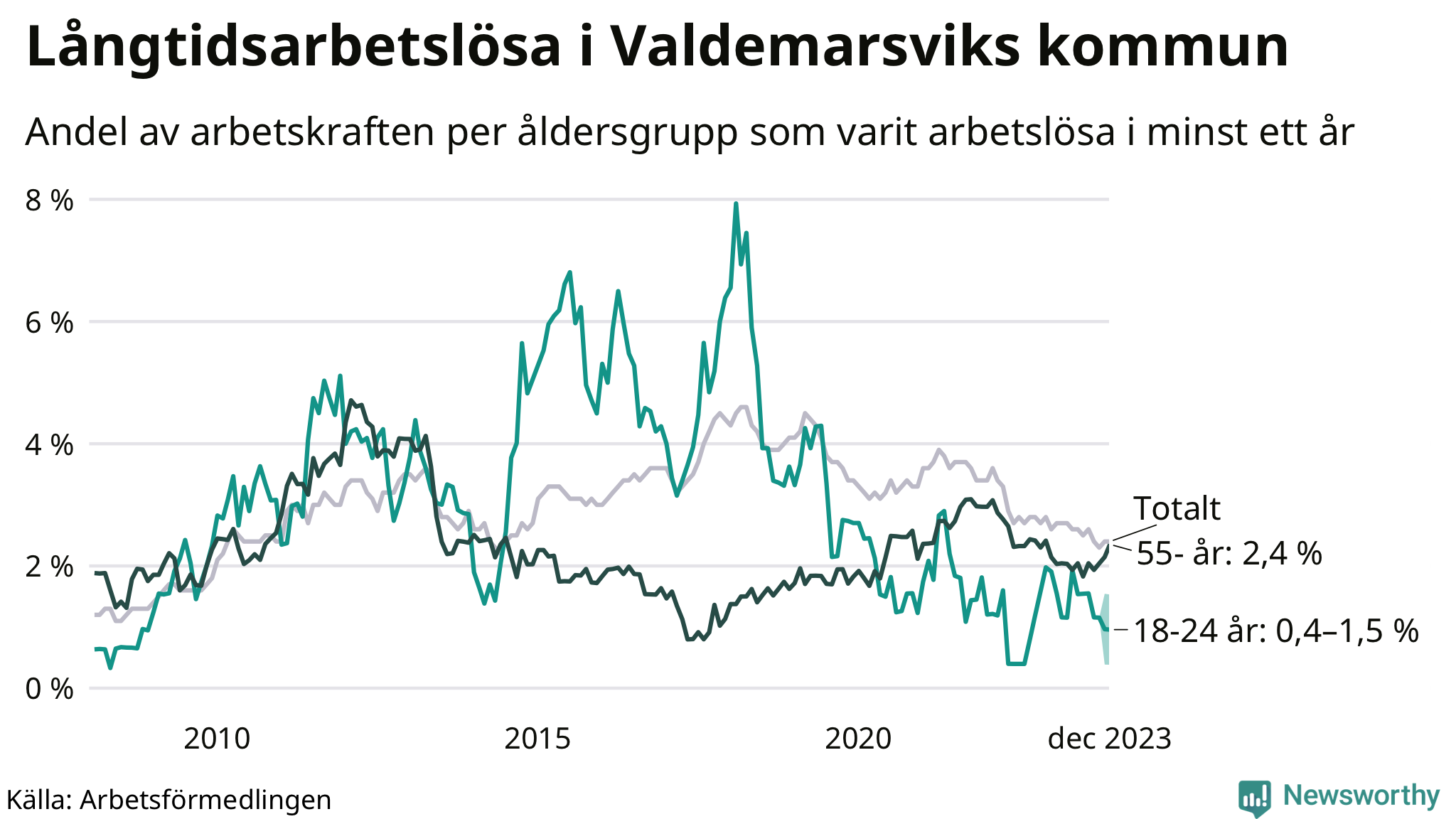 Graf: Andel arbetslösa uppdelat i åldersgrupper i Valdemarsvik