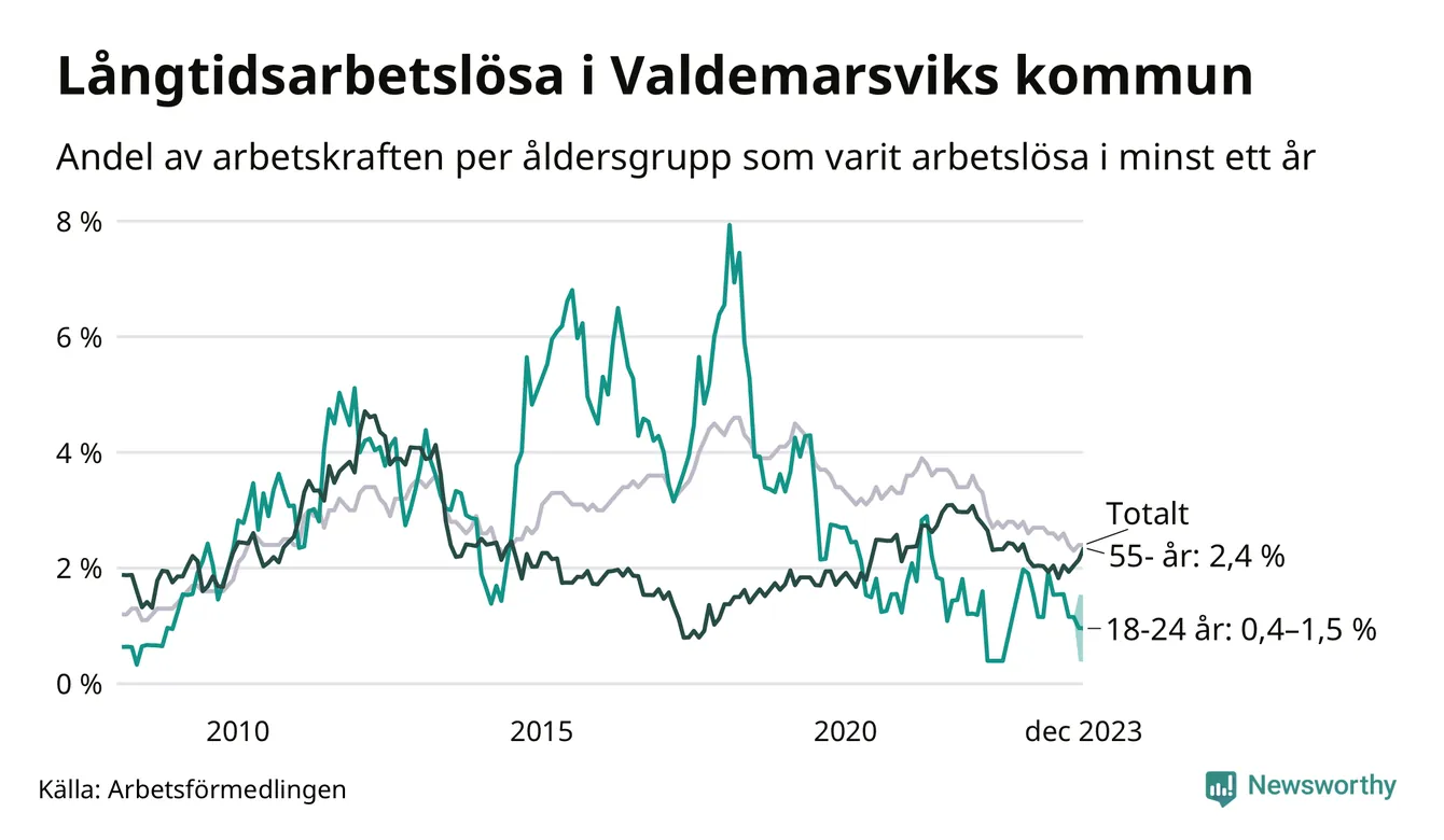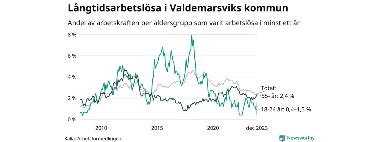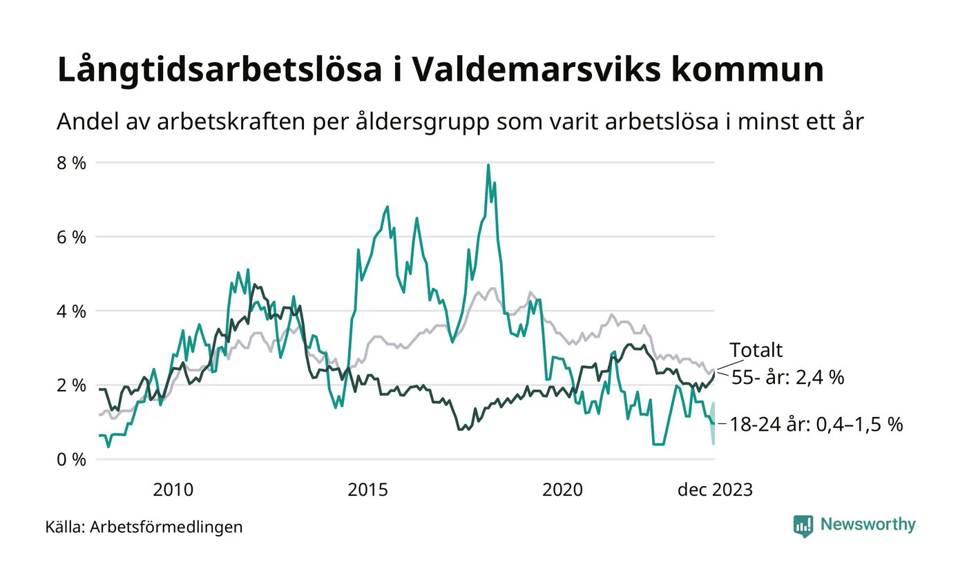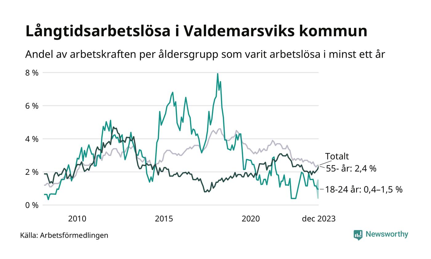 Av de 81 personerna som varit arbetslösa i mer än ett år i Valdemarsviks kommun är 22 personer mellan 55 och 651 år och mellan en och fyra är mellan 18 och 24 år. För den äldre gruppen är andelen arbetslösa 2,4 procent medan den i den yngre gruppen är mellan 0,4 och 1,5 procent. Även i riket som helhet är långtidsarbetslösheten högre i gruppen äldre.