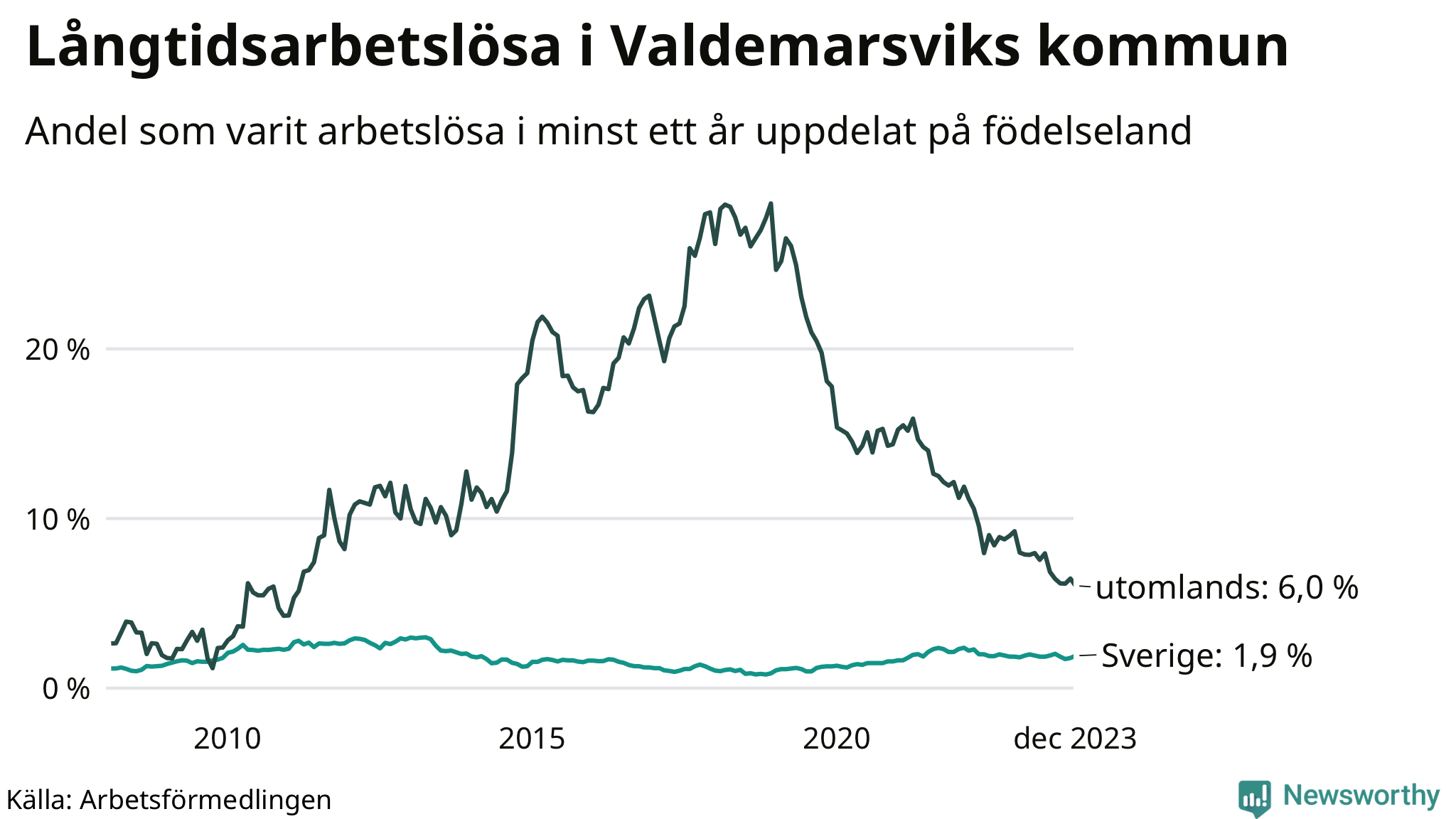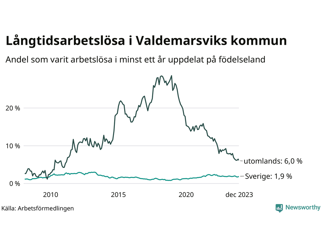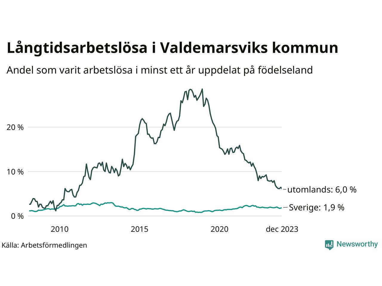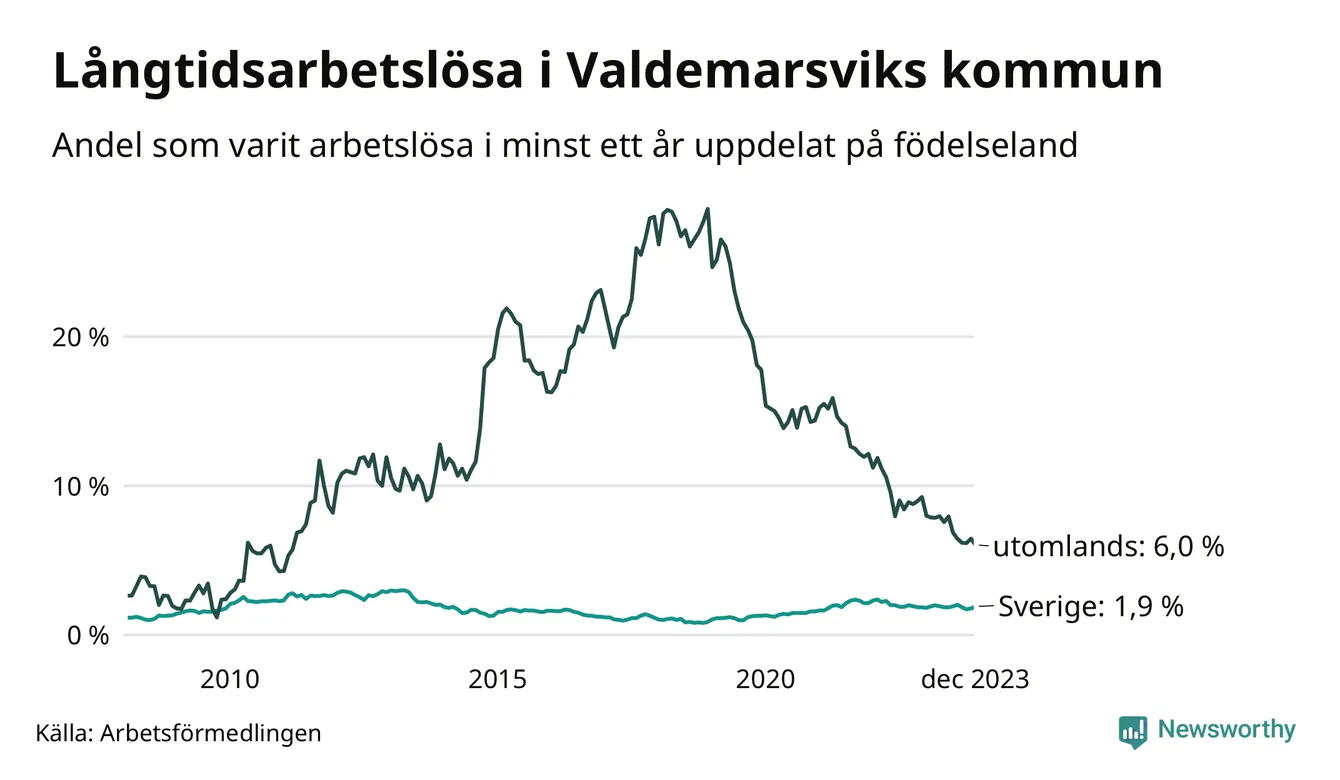 Graf: Andel arbetslösa uppdelat på födelseland i Valdemarsvik