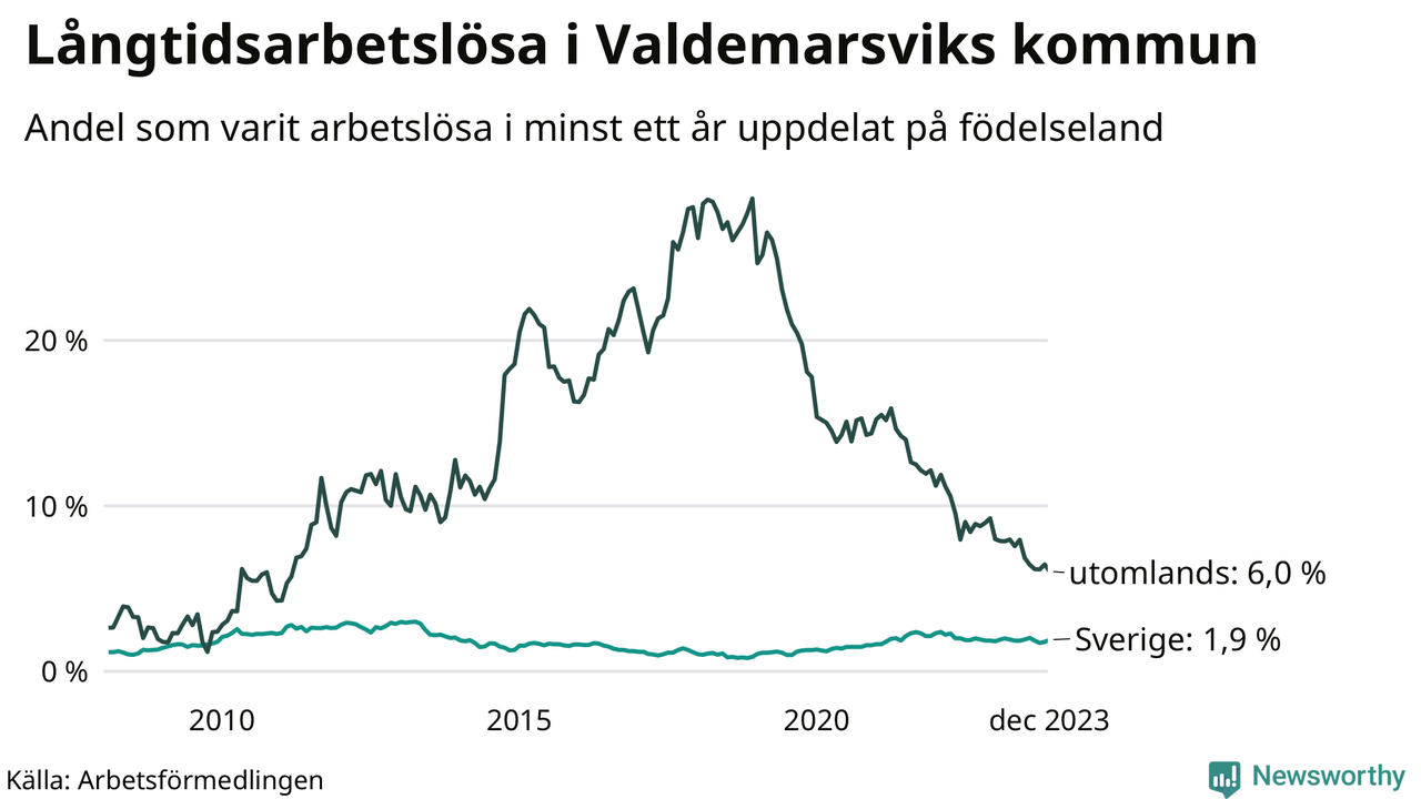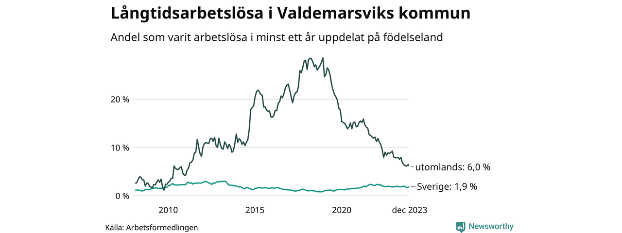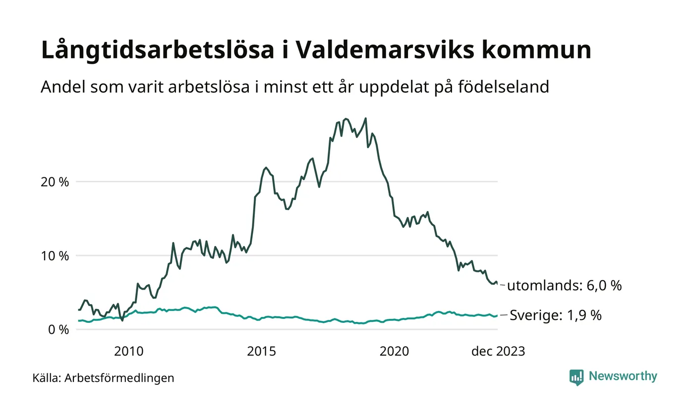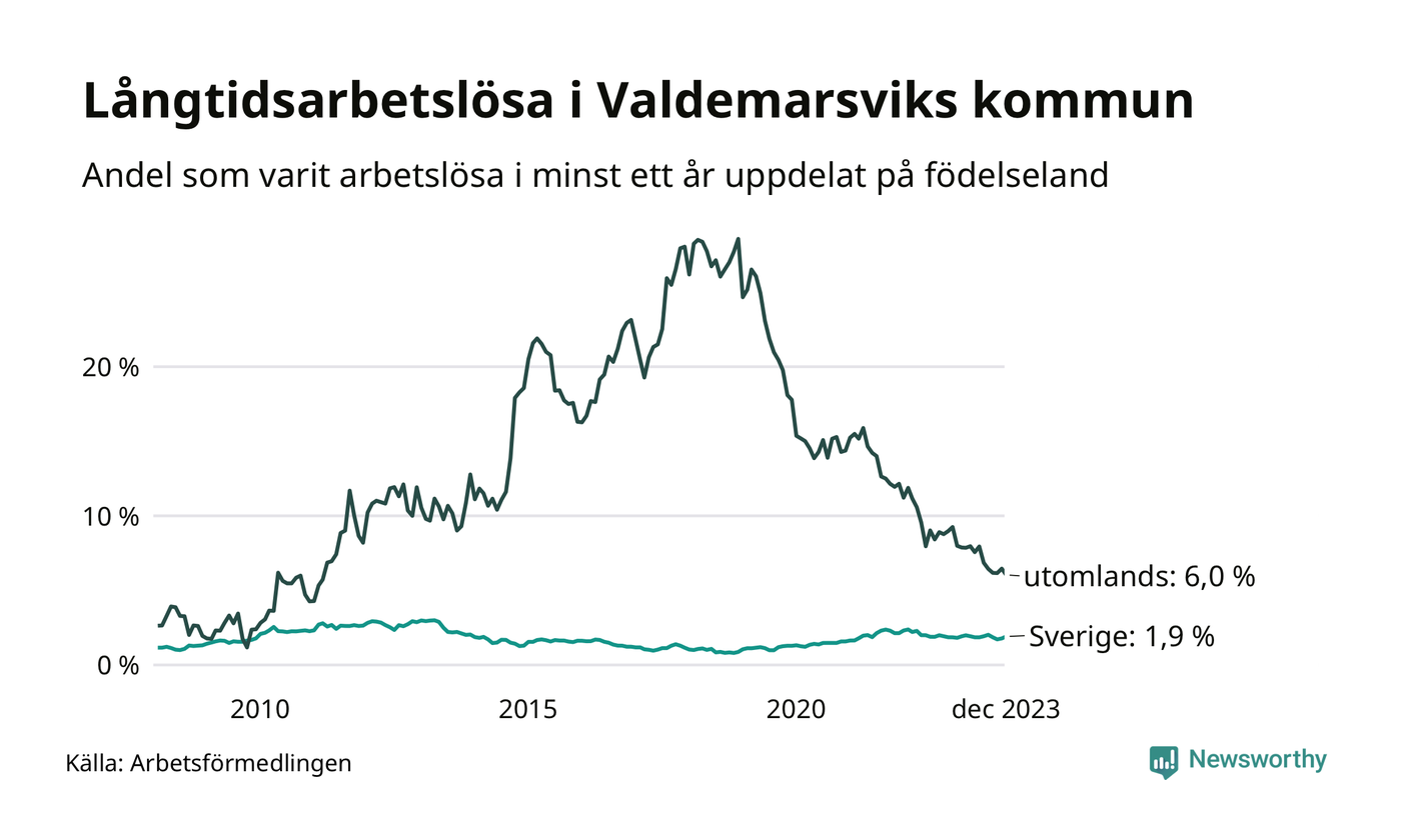 56 av de långtidsarbetslösa i Valdemarsvik är födda i Sverige, medan 25 är födda utomlands. Det innebär att långtidsarbetslösheten bland Sverigefödda är 1,9 procent, medan den är tre gånger så hög – 6,0 procent – bland födda utomlands. Även i riket som helhet är arbetslösheten högre bland utrikesfödda.