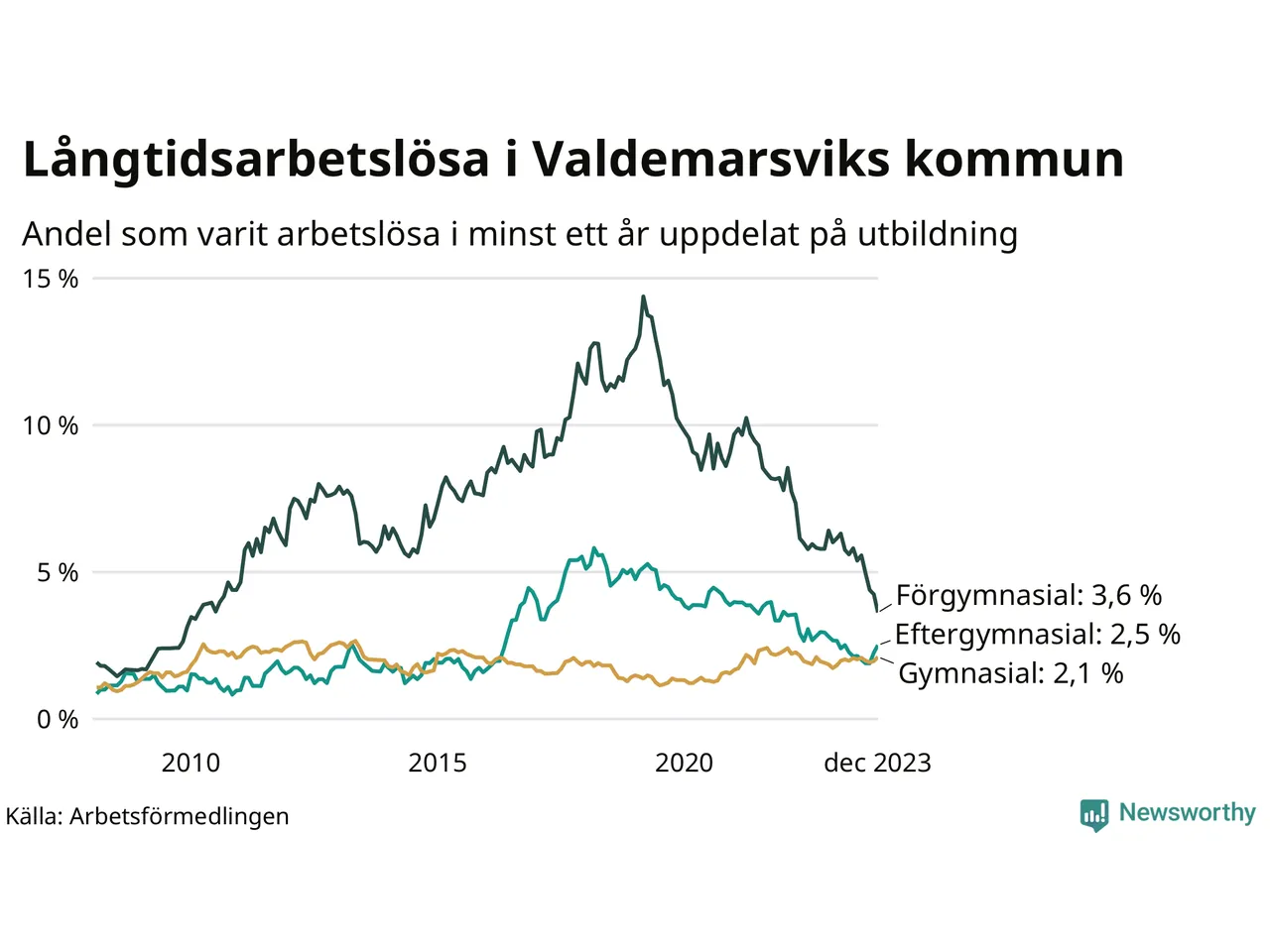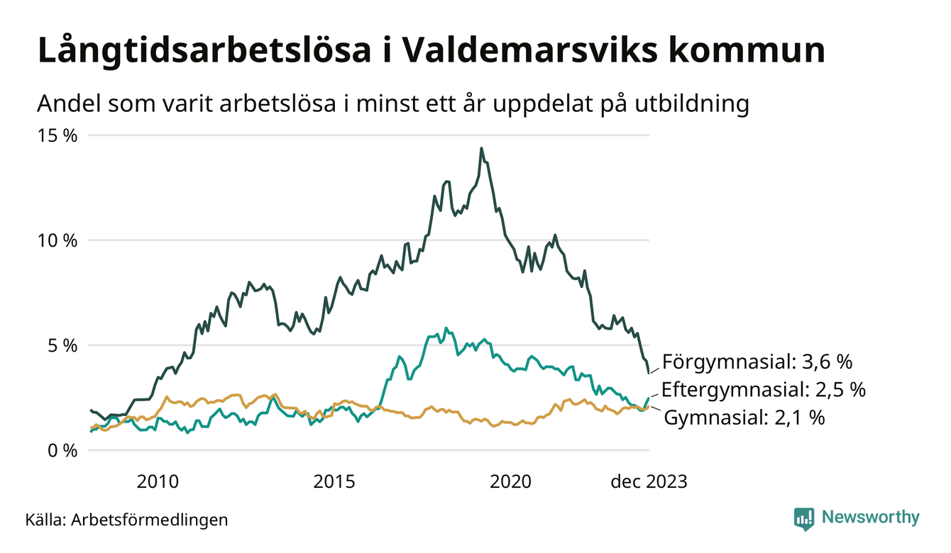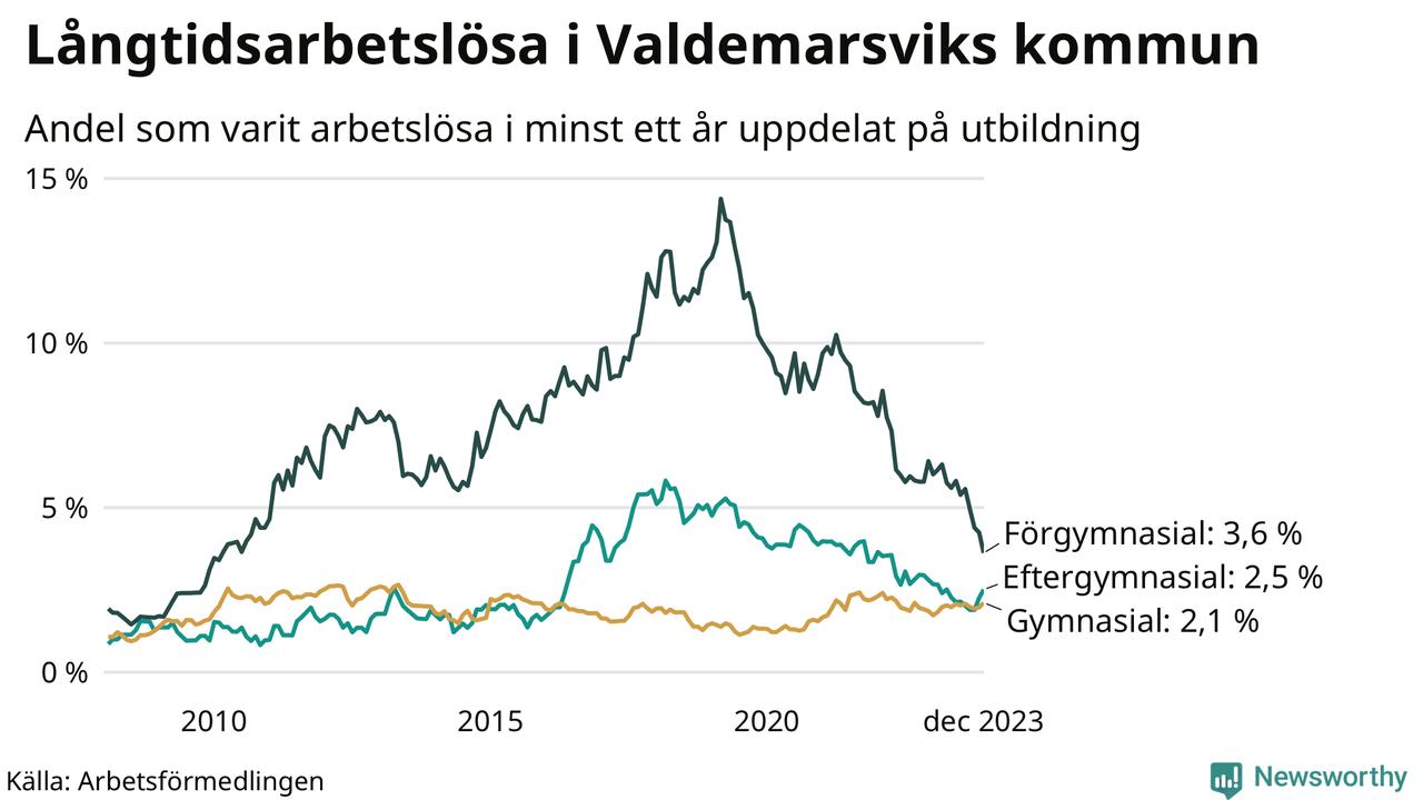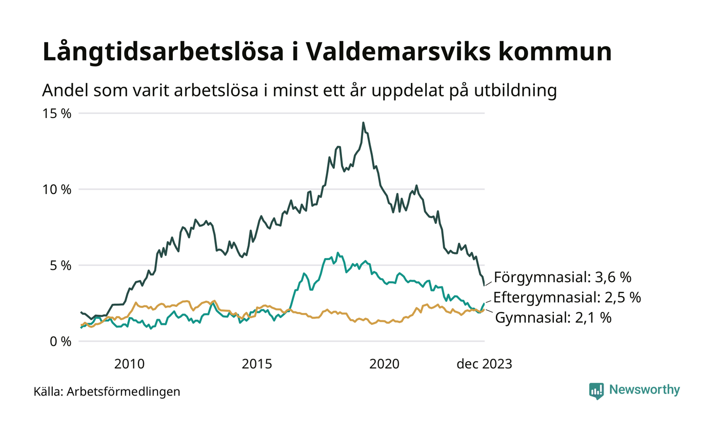 Graf: Andel arbetslösa i Valdemarsvik som varit utan arbete i minst 12 månader