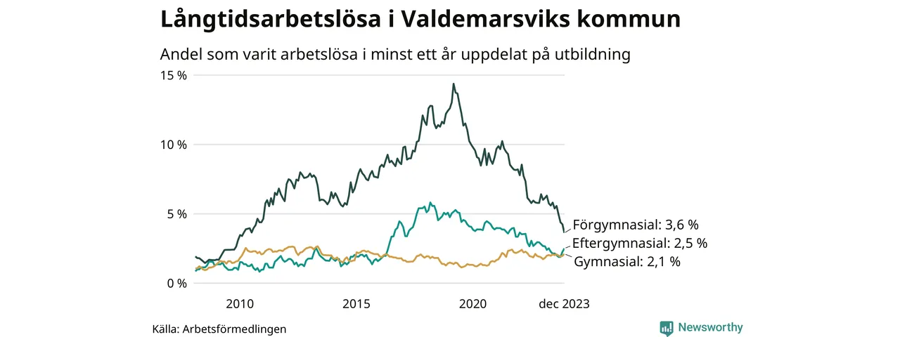 Andelen som varit utan arbete i minst ett år i Valdemarsvik var lägre i december jämfört med samma månad för ett år sedan. Det visar Arbetsfömedlingens senaste månadsstatistik.
