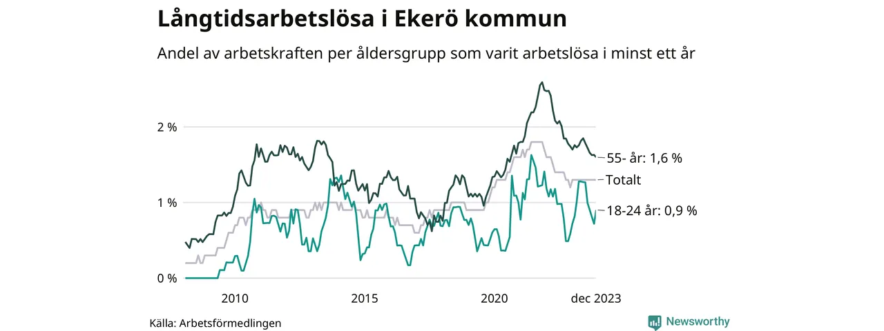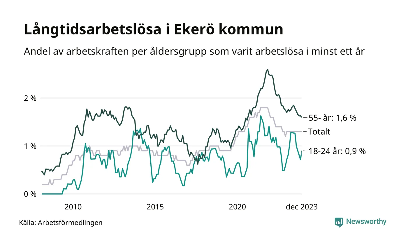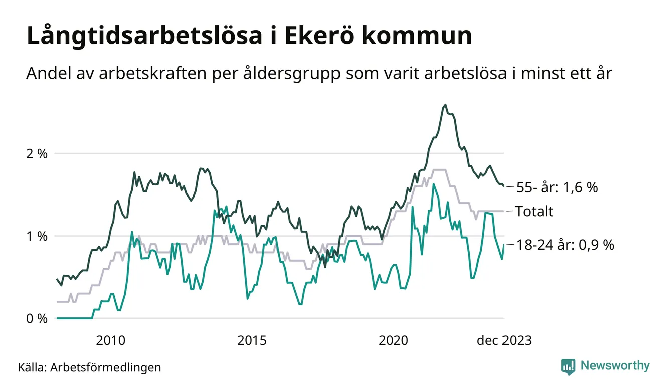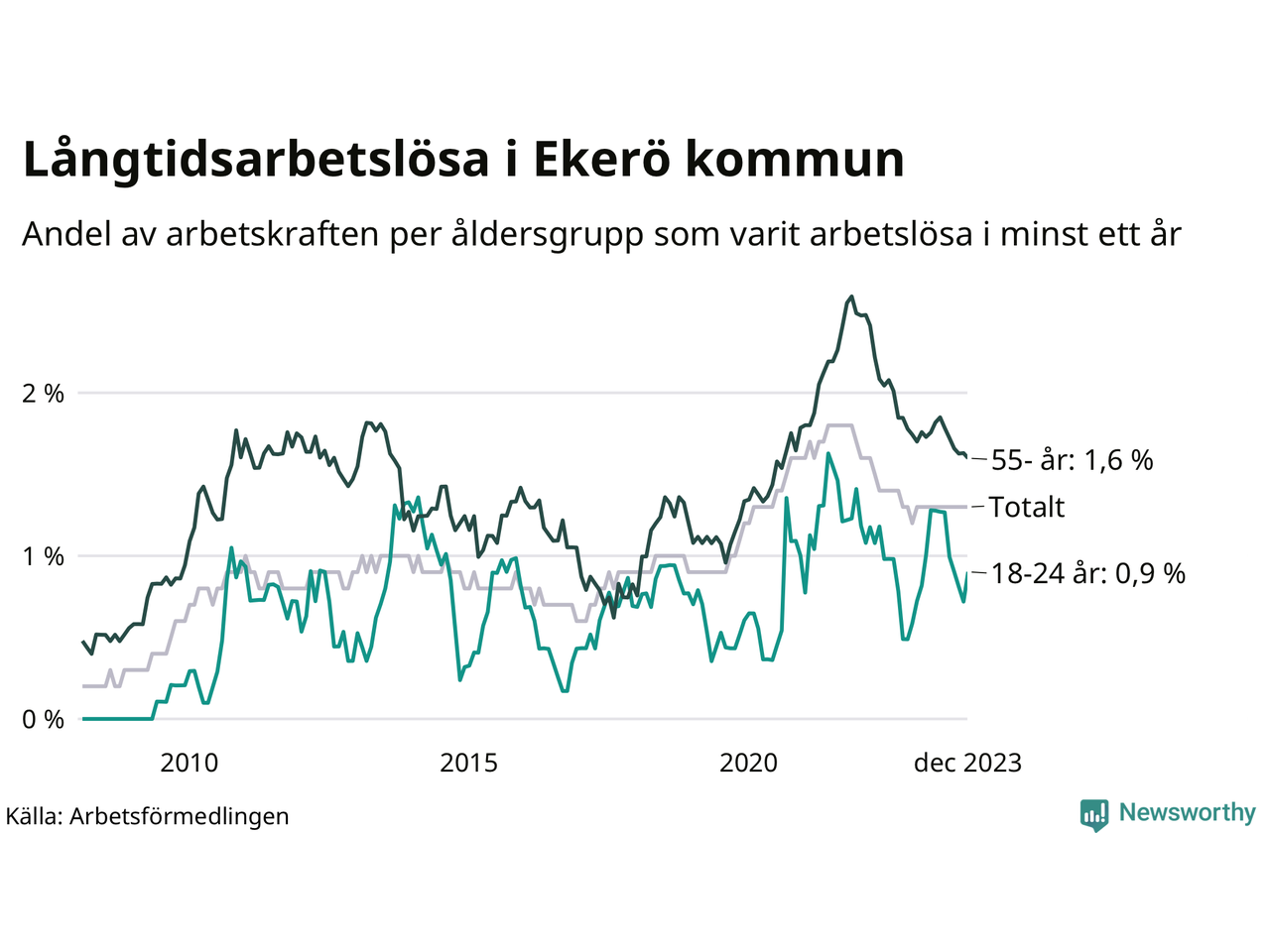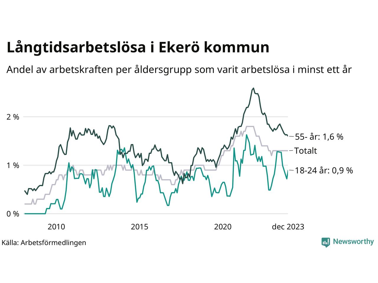Av de 180 personerna som varit arbetslösa i mer än ett år i Ekerö kommun är 51 personer mellan 55 och 651 år och tio är mellan 18 och 24 år. För den äldre gruppen är andelen arbetslösa 1,6 procent medan den i den yngre gruppen är 0,9 procent. Även i riket som helhet är långtidsarbetslösheten högre i gruppen äldre.
