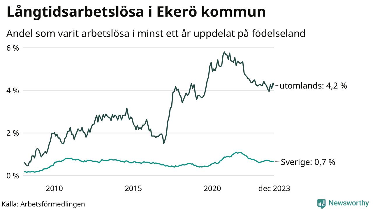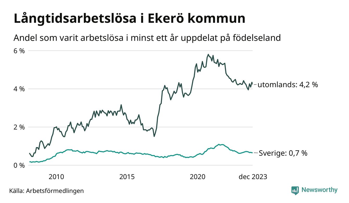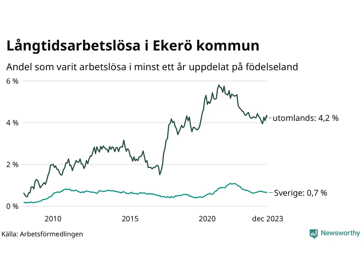 77 av de långtidsarbetslösa i Ekerö är födda i Sverige, medan 103 är födda utomlands. Det innebär att långtidsarbetslösheten bland Sverigefödda är 0,7 procent, medan den är sex gånger så hög – 4,2 procent – bland födda utomlands. Även i riket som helhet är arbetslösheten högre bland utrikesfödda.