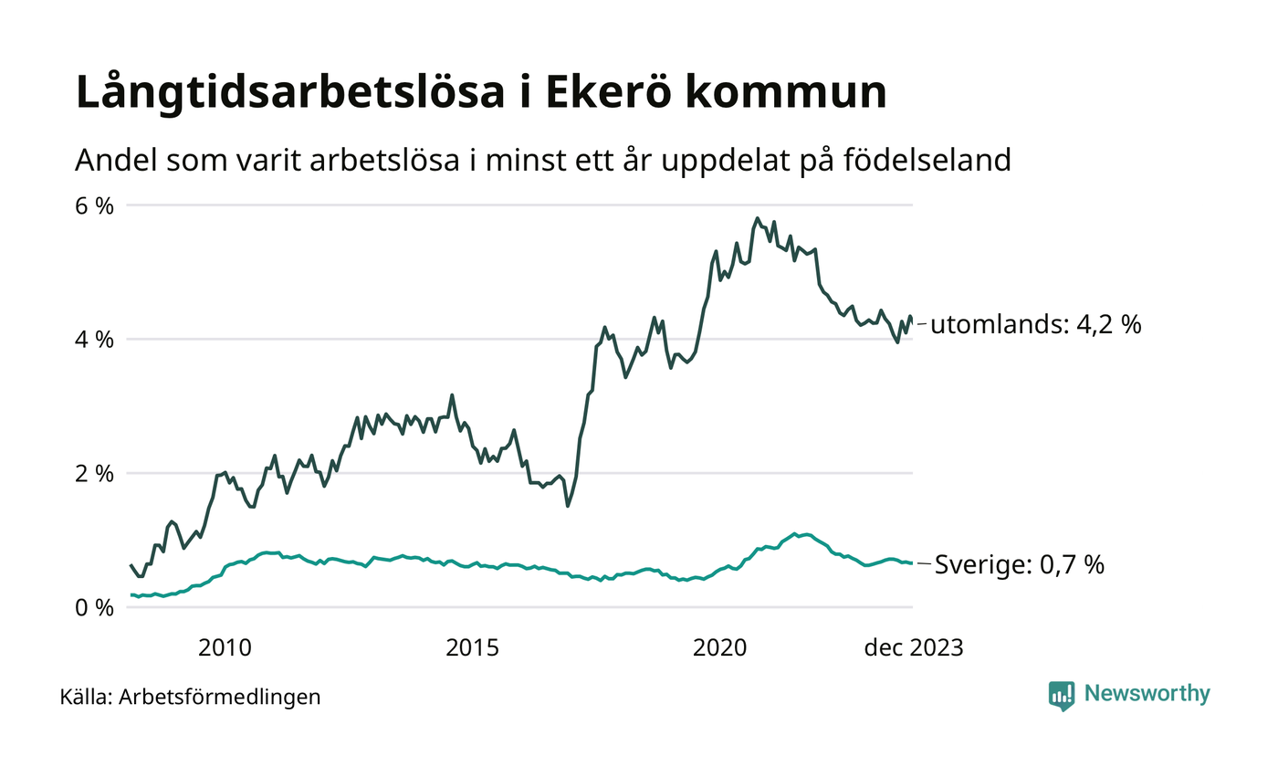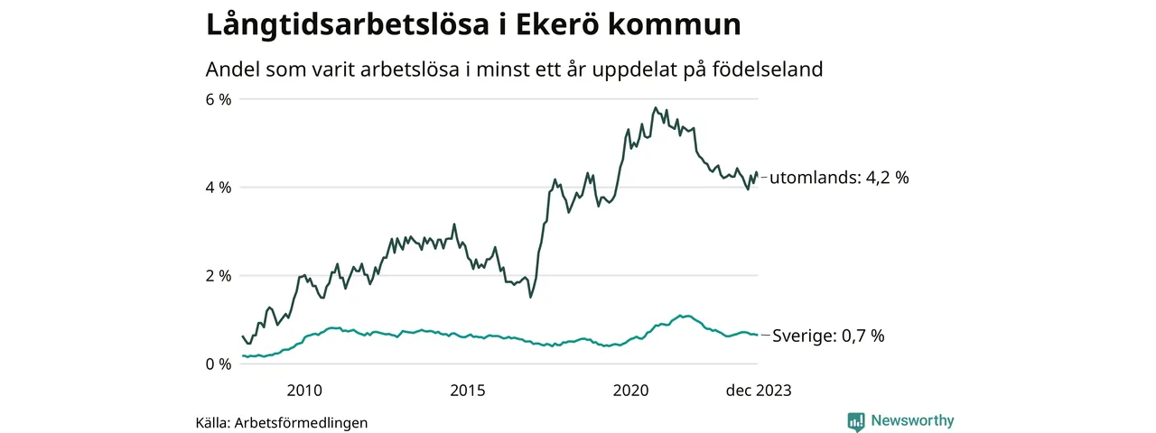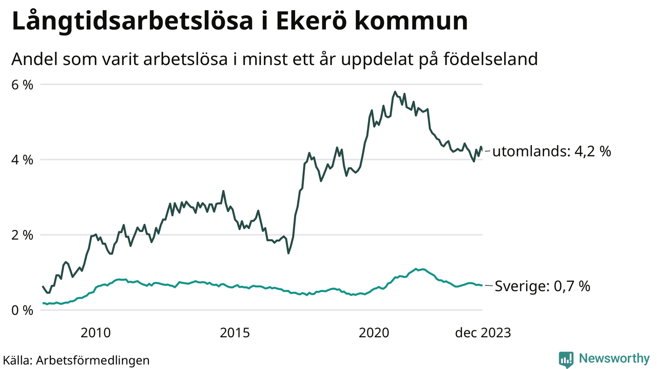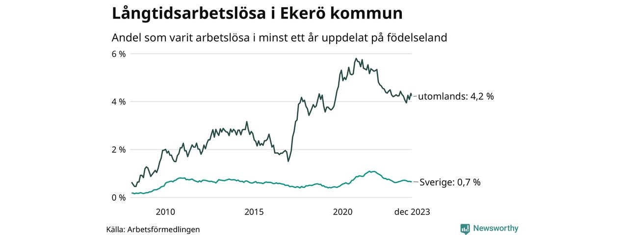 77 av de långtidsarbetslösa i Ekerö är födda i Sverige, medan 103 är födda utomlands. Det innebär att långtidsarbetslösheten bland Sverigefödda är 0,7 procent, medan den är sex gånger så hög – 4,2 procent – bland födda utomlands. Även i riket som helhet är arbetslösheten högre bland utrikesfödda.