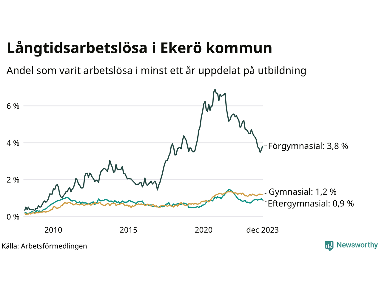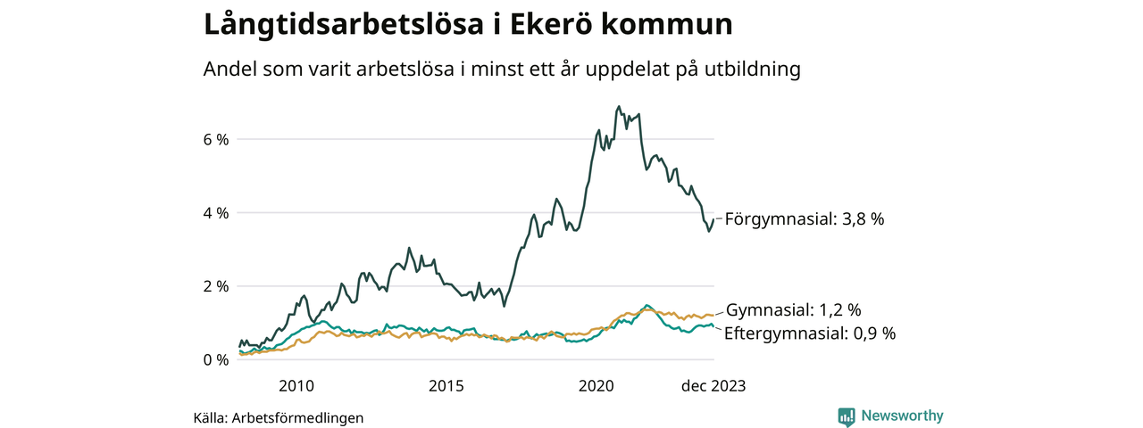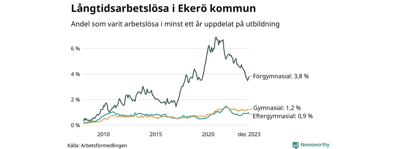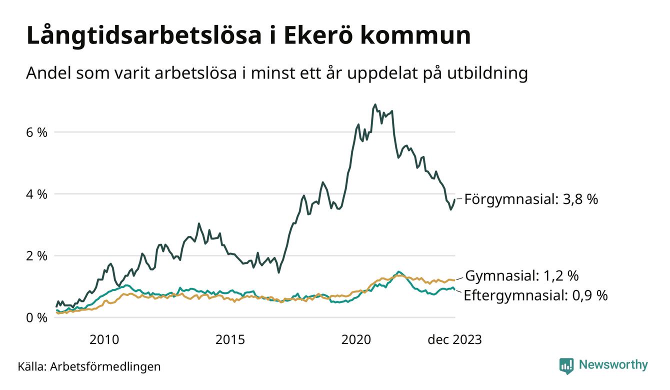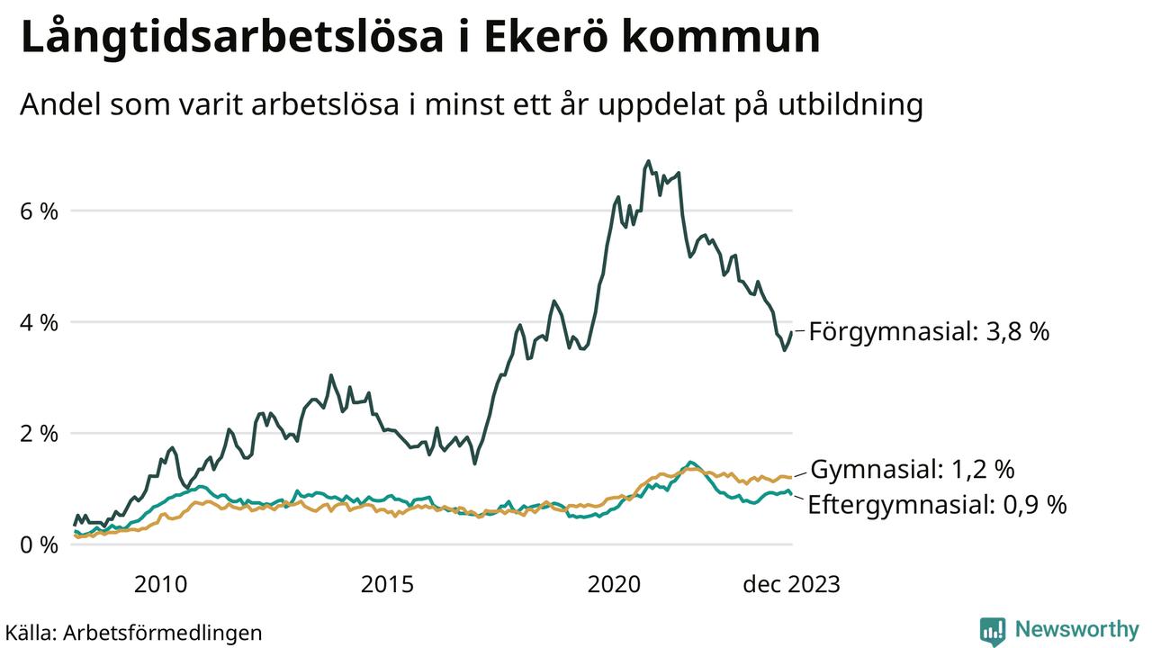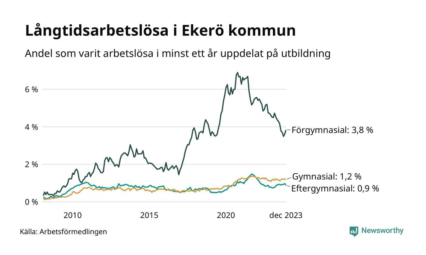 Graf: Andel arbetslösa i Ekerö som varit utan arbete i minst 12 månader