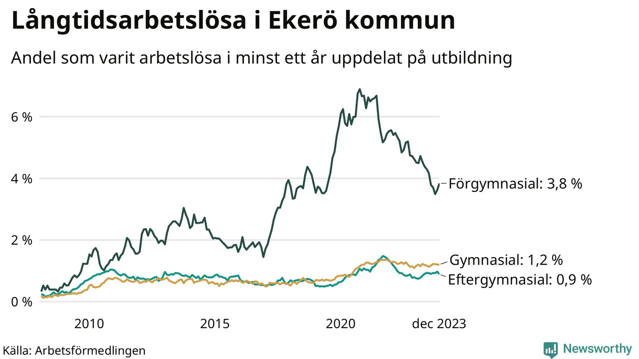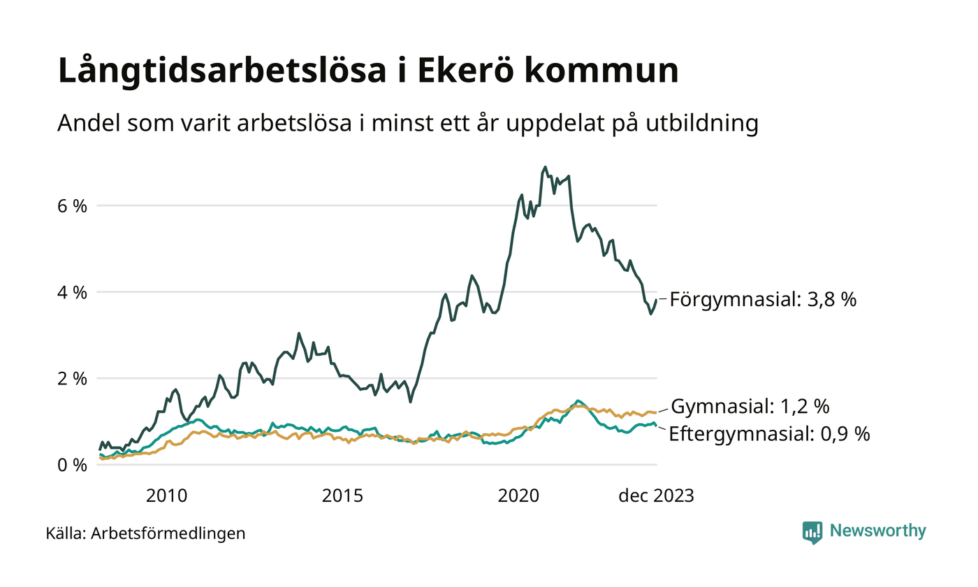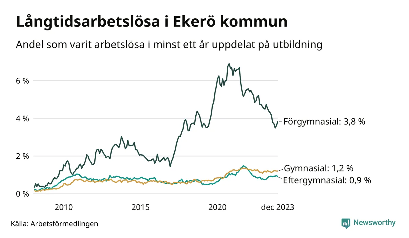 Graf över andel långtidsarbetslösa i Ekerö uppdelat på utbildningsnivå
