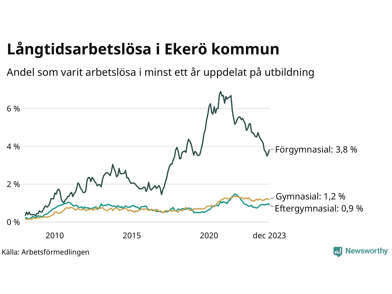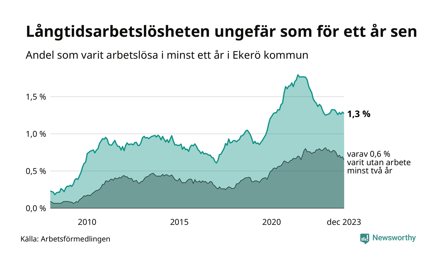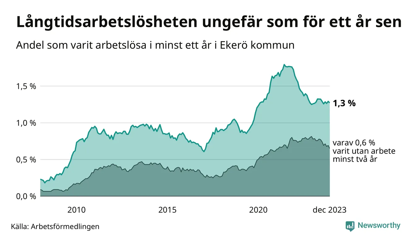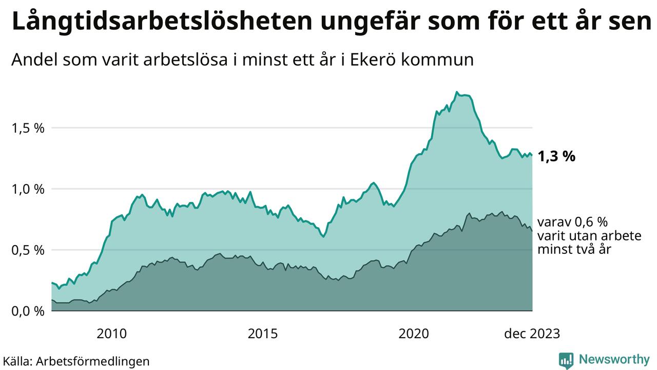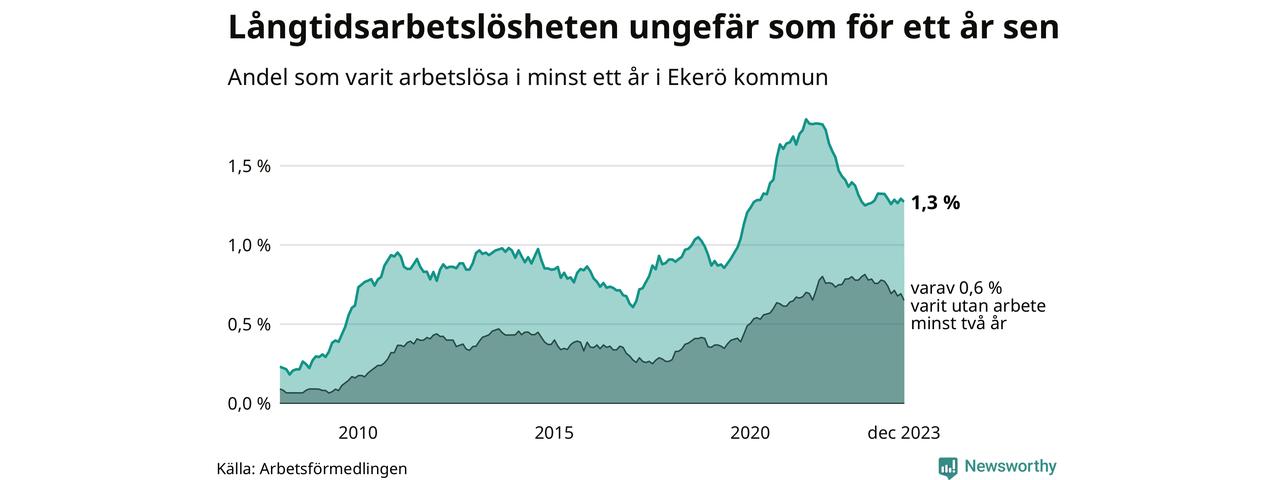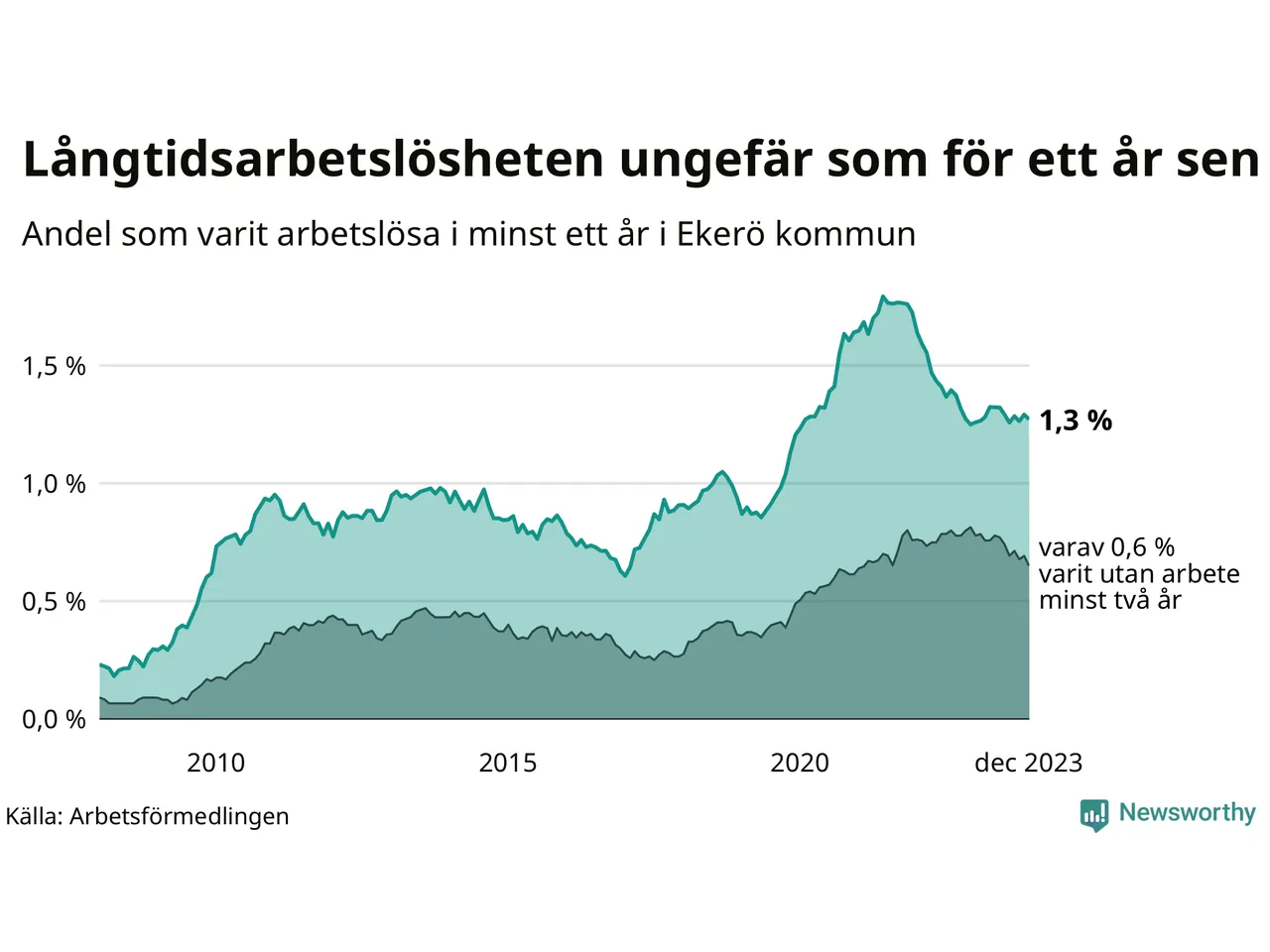 I december hade 180 Ekeröbor varit arbetslösa i minst ett år, vilket är tre färre än månaden innan. 180 personer motsvarar 1,3 procent av arbetskraften i kommunen – andelen långtidsarbetslösa är ungefär på samma nivå som för ett år sedan.