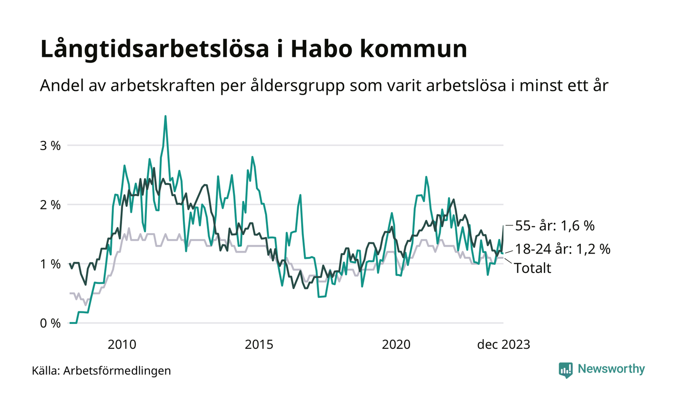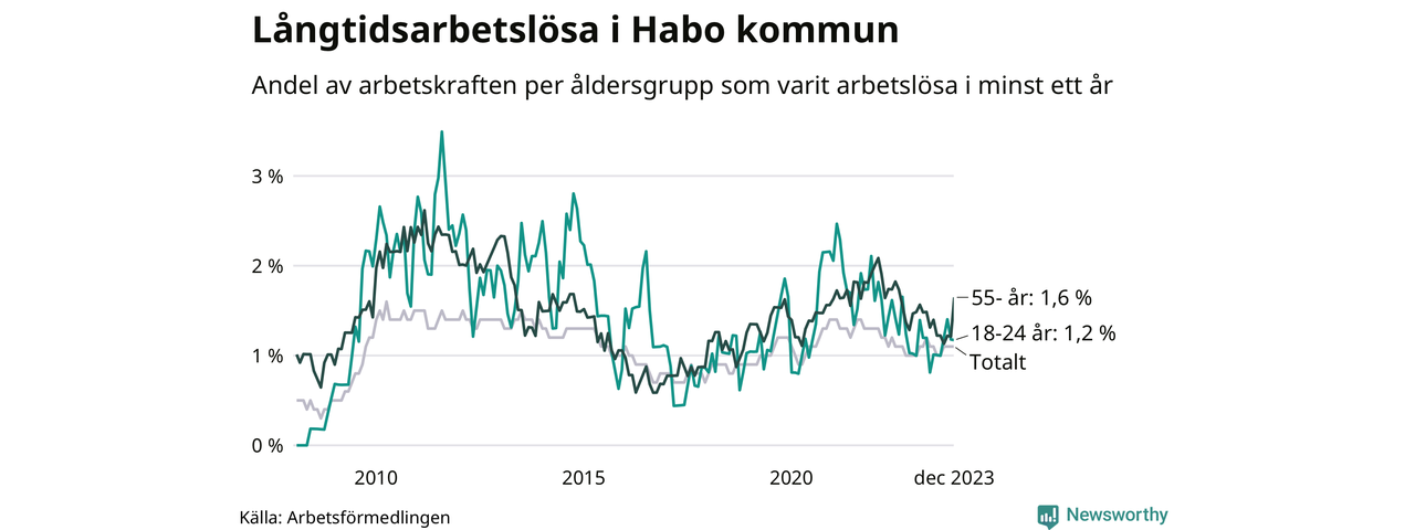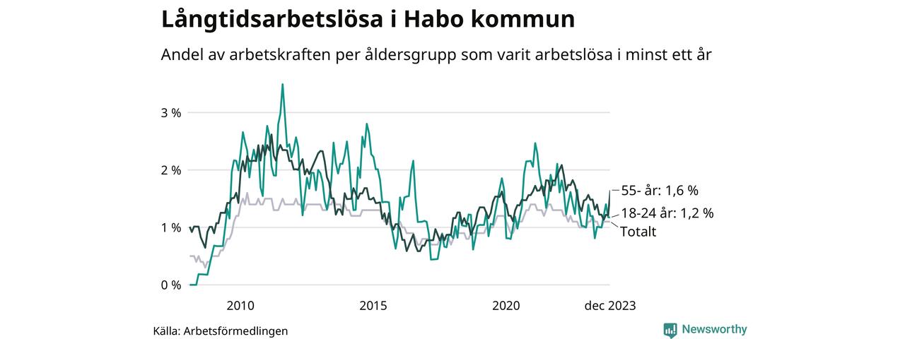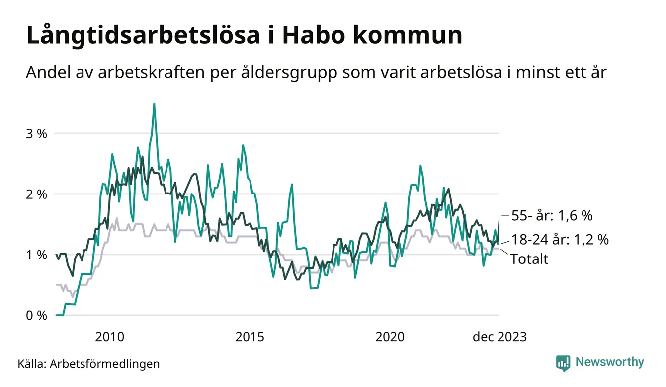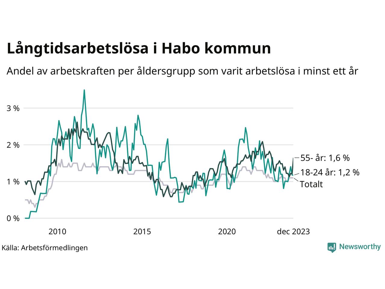 Av de 72 personerna som varit arbetslösa i mer än ett år i Habo kommun är 19 personer mellan 55 och 651 år och sex är mellan 18 och 24 år. För den äldre gruppen är andelen arbetslösa 1,6 procent medan den i den yngre gruppen är 1,2 procent. Även i riket som helhet är långtidsarbetslösheten högre i gruppen äldre.
