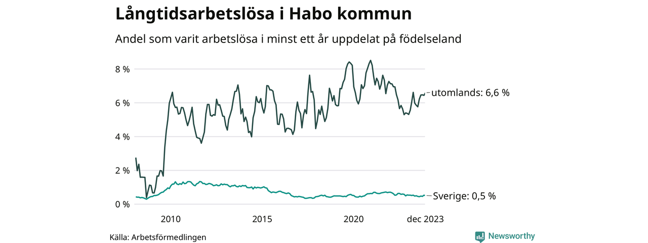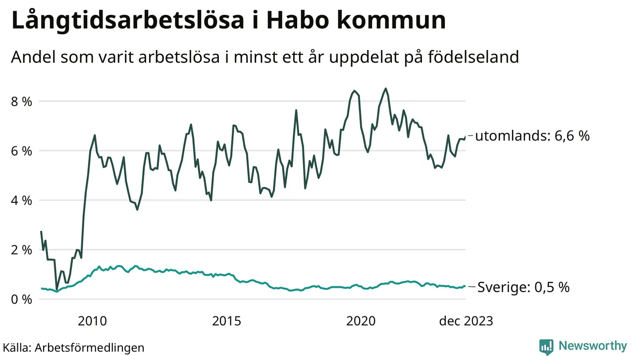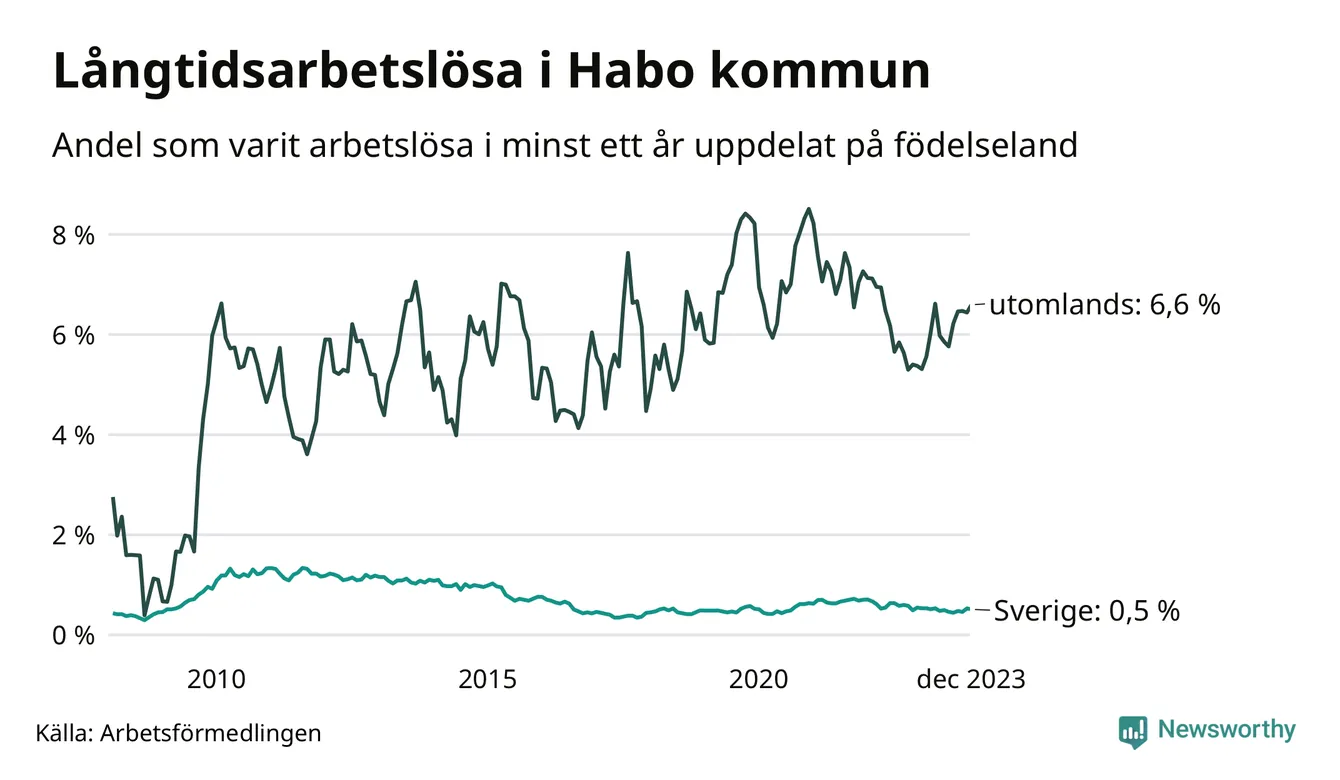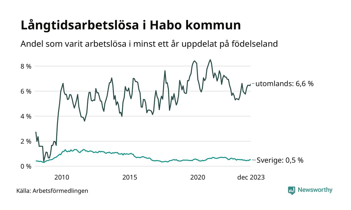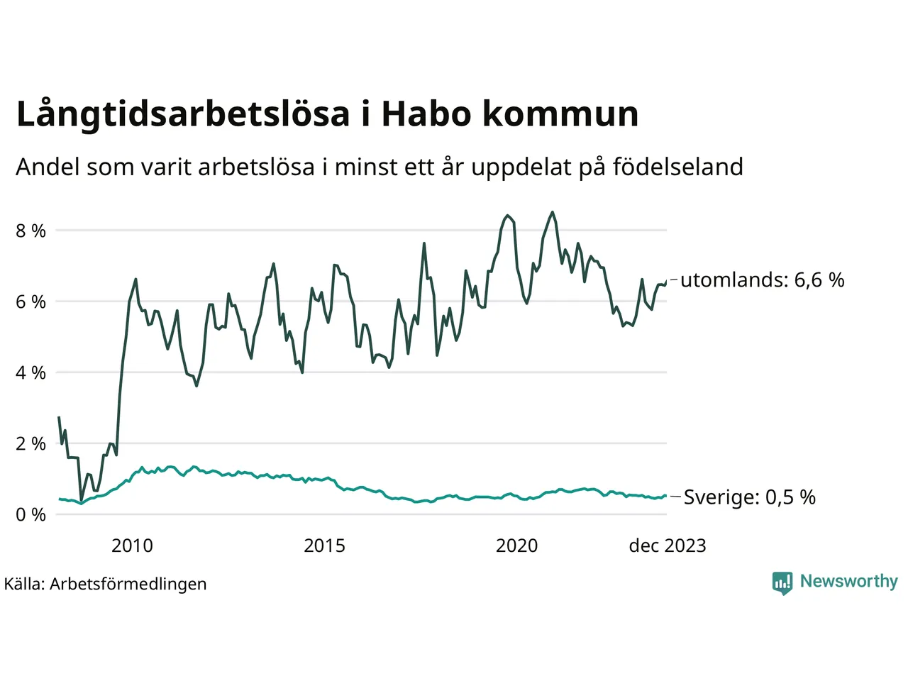 29 av de långtidsarbetslösa i Habo är födda i Sverige, medan 43 är födda utomlands. Det innebär att långtidsarbetslösheten bland Sverigefödda är 0,5 procent, medan den är tretton gånger så hög – 6,6 procent – bland födda utomlands. Även i riket som helhet är arbetslösheten högre bland utrikesfödda.