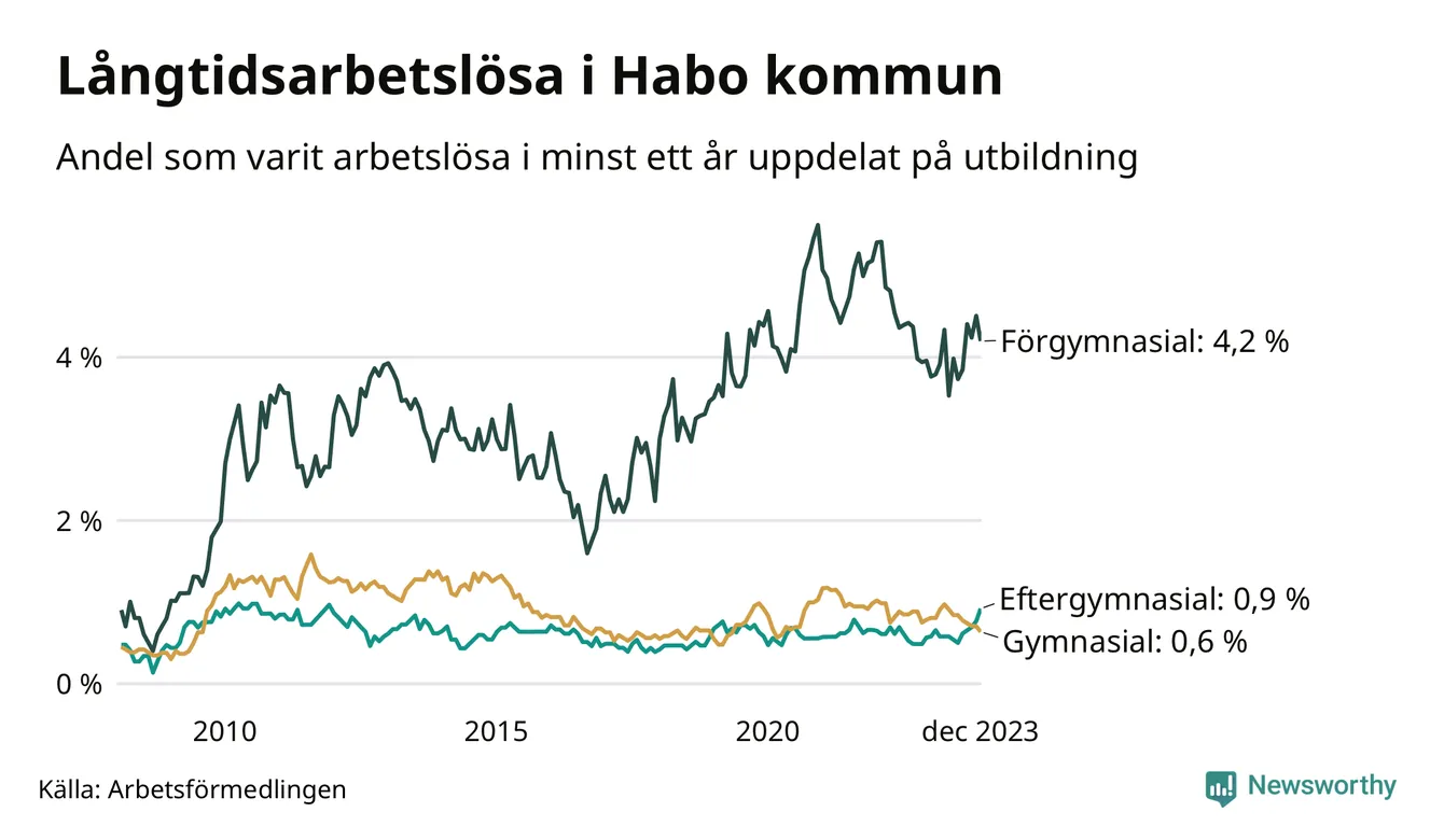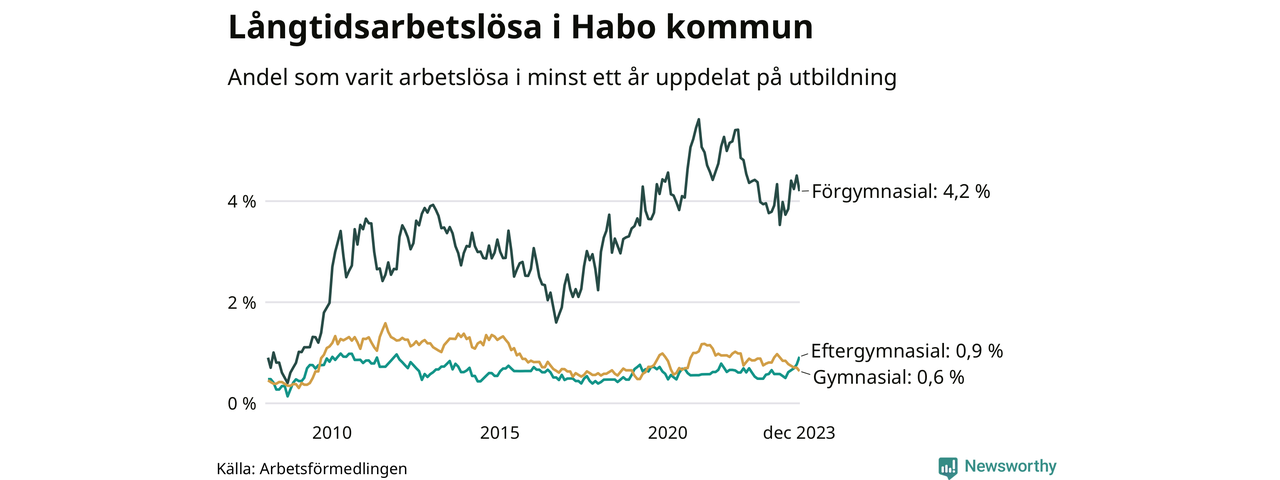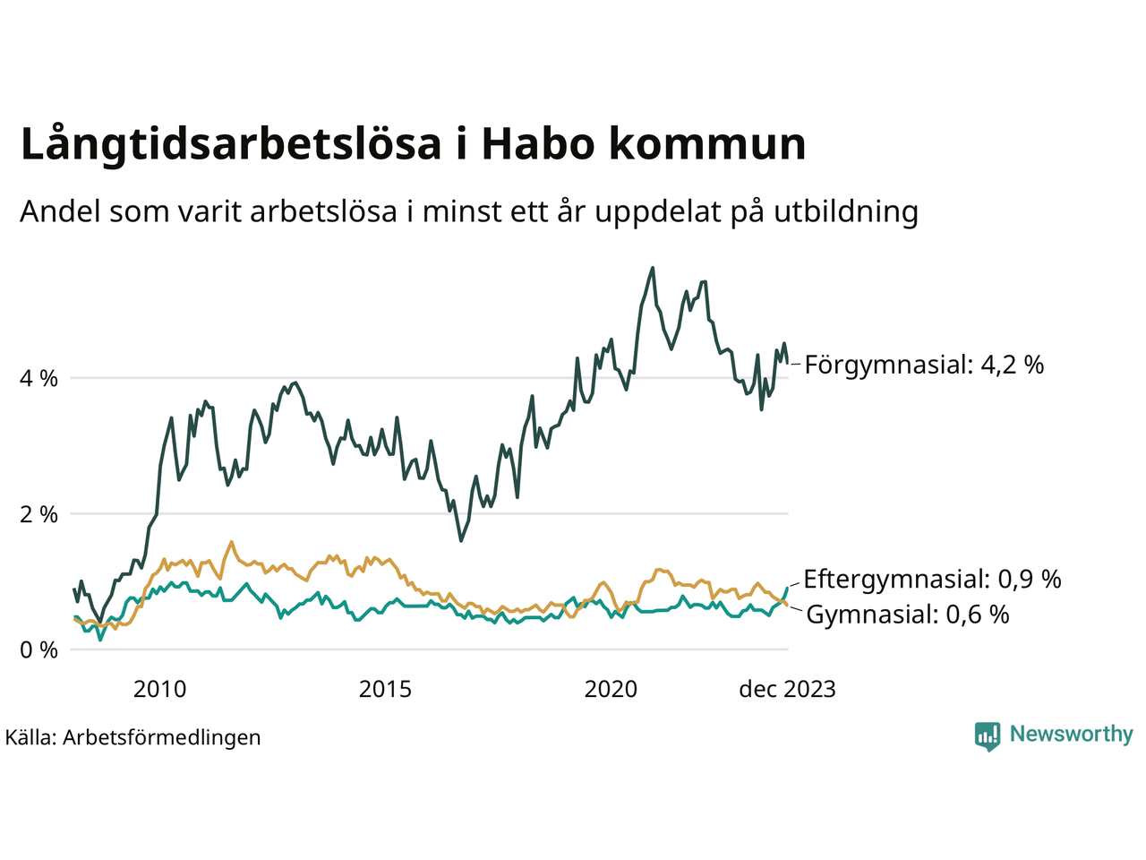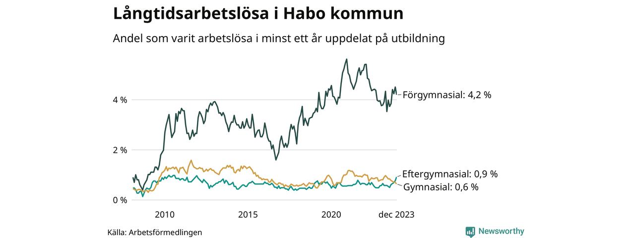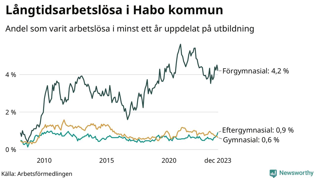 Andelen långtidsarbetslösa i Habo är den lägsta i Jönköpings län. I Nässjö finns länets högsta långtidsarbetslöshet, 3,3 procent. I Jönköpings län som helhet hade 3 816 personer (2,1 procent) varit arbetslösa i minst ett år i december. Det är 108 personer fler än månaden innan.