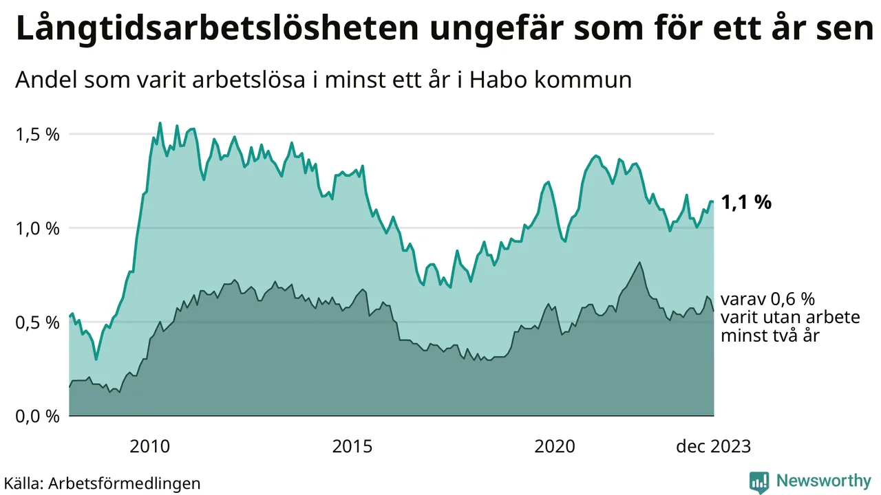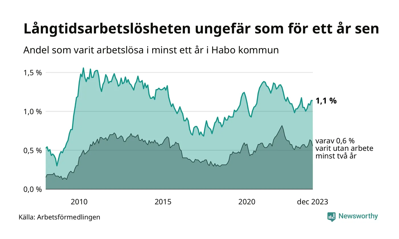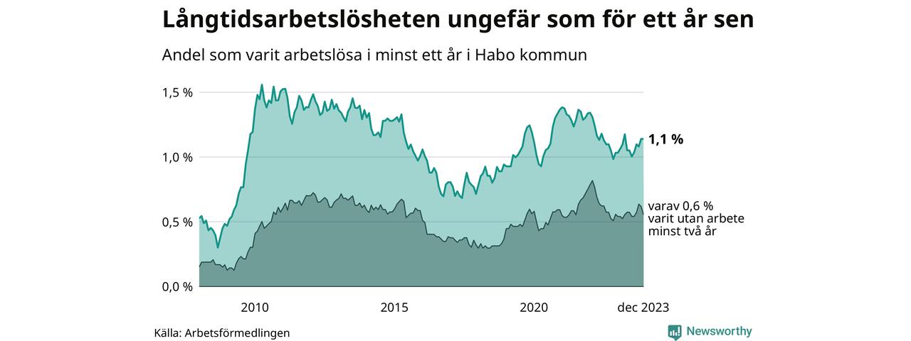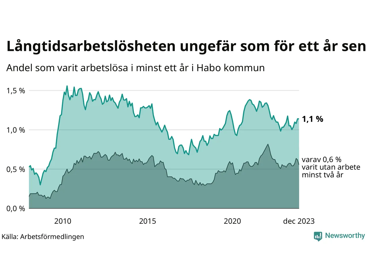I december hade 72 Habobor varit arbetslösa i minst ett år, vilket är lika många som månaden innan. 72 personer motsvarar 1,1 procent av arbetskraften i kommunen – andelen långtidsarbetslösa är ungefär på samma nivå som för ett år sedan. Habo tillhör de kommuner som har lägst andel långtidsarbetslösa i hela landet just nu.