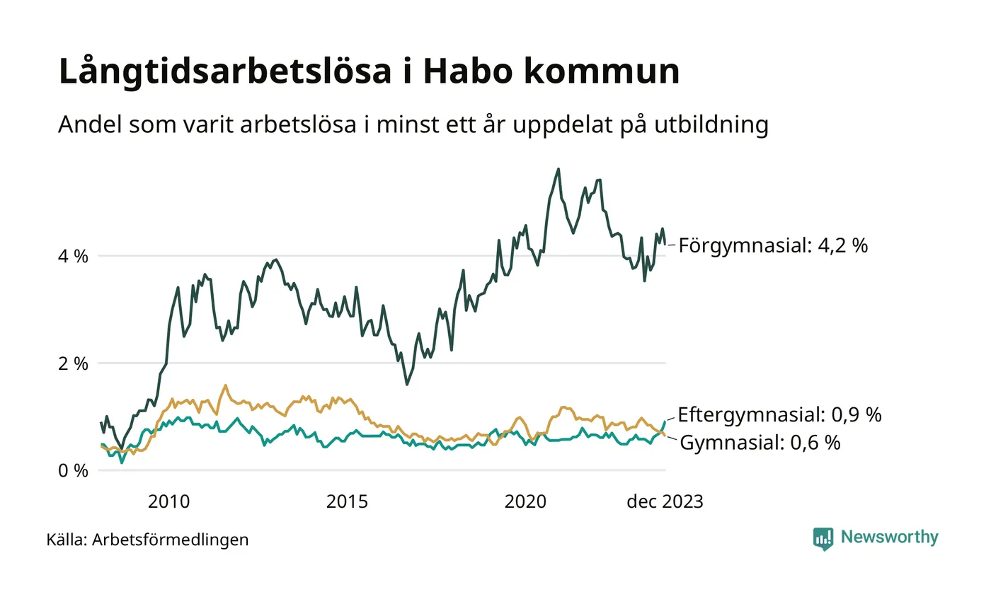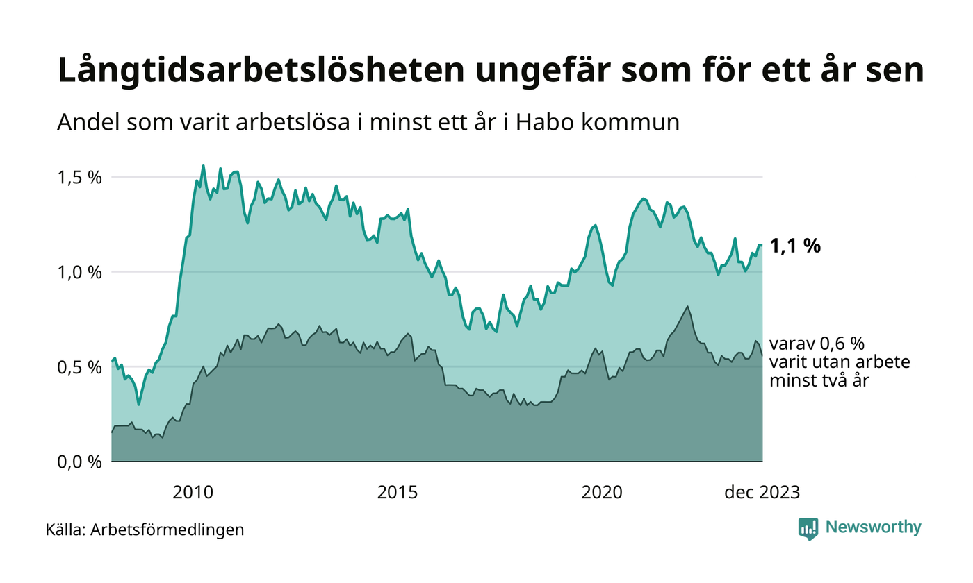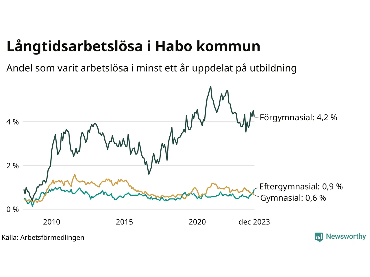 I december hade 72 Habobor varit arbetslösa i minst ett år, vilket är lika många som månaden innan. 72 personer motsvarar 1,1 procent av arbetskraften i kommunen – andelen långtidsarbetslösa är ungefär på samma nivå som för ett år sedan. Habo tillhör de kommuner som har lägst andel långtidsarbetslösa i hela landet just nu.