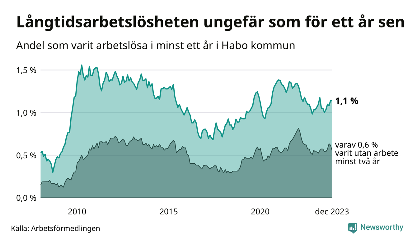 Andel arbetslösa i minst två år | 0,6 % | 1,1 % | 1,5 % |